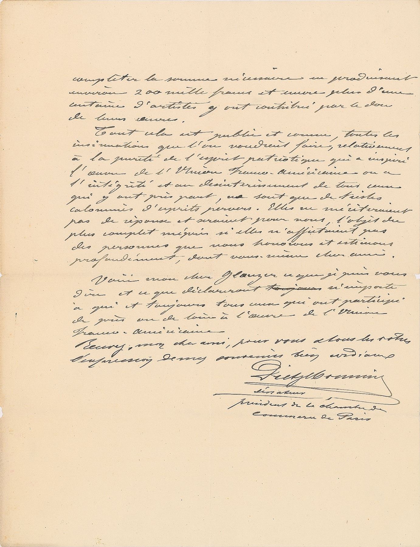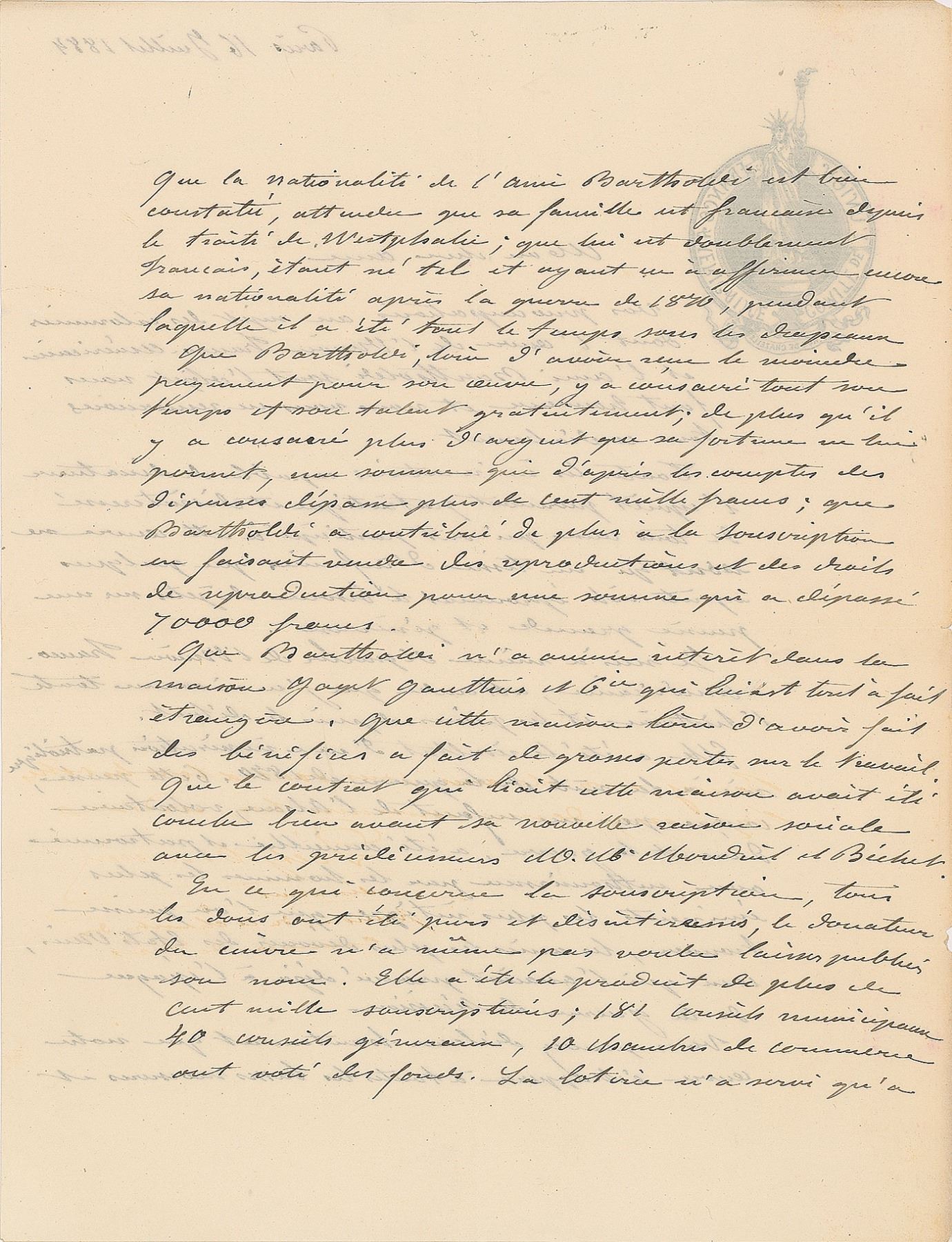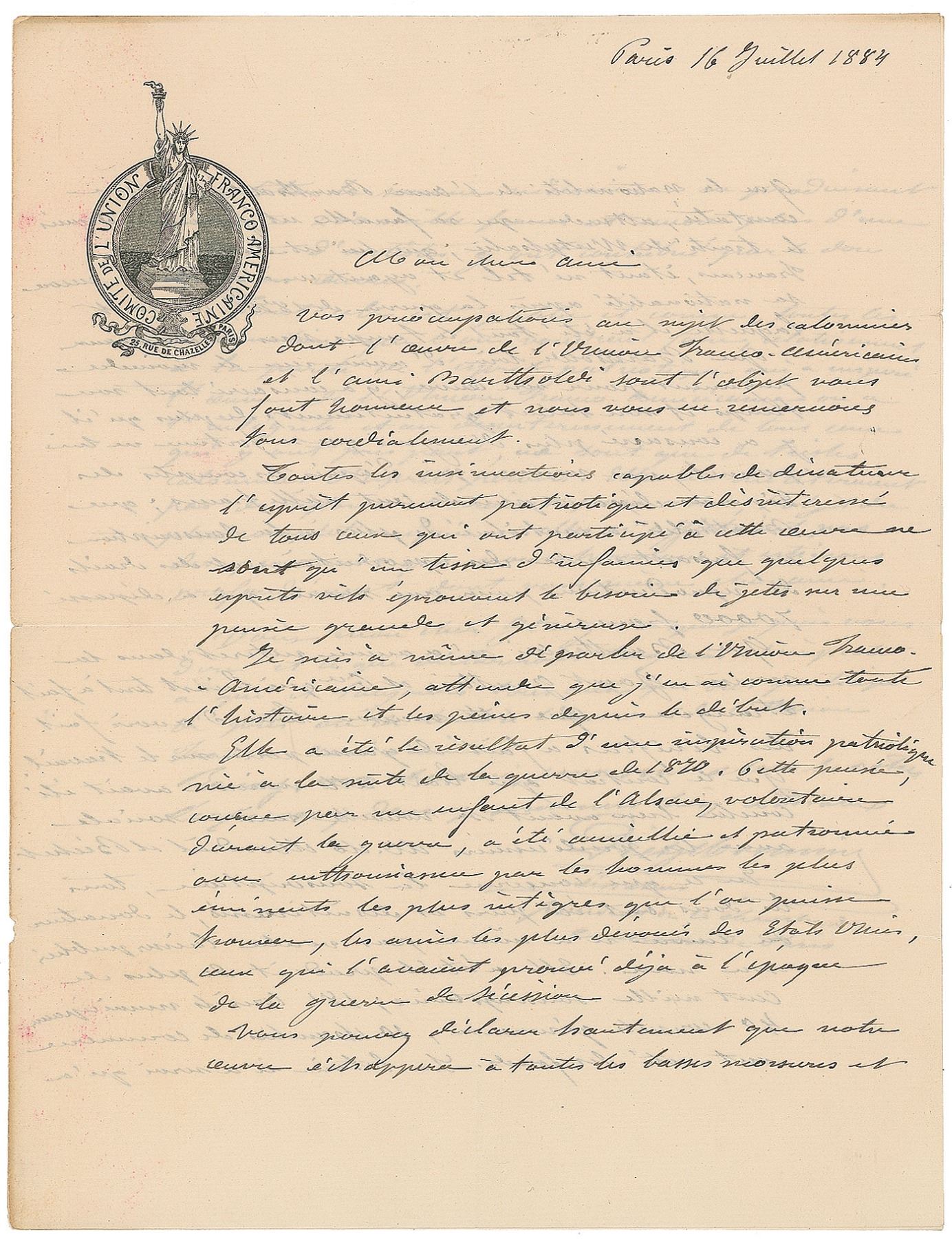 ALS in French, signed “A. Bartholdi,” three pages on two adjoining sheets, 8 x 10.5, Franco American Union Committee letterhead, July 16, 1884. Letter to friend and fellow Statue of Liberty collaborator Georges Glaenzer, in part (translated): "I am in a position to speak of the Franco–American Union, seeing that I have known its story and its difficulties from the beginning. It was the result of a patriotic inspiration, born as a result of the War of 1870. That idea, conceived by a son of Alsace, a volunteer during the war, was enthusiastically greeted and supported by the most eminent, the most upstanding men one could find, the most devoted friends of the United States, those who had proved it already, at the time of the Civil War. You may categorically affirm that our undertaking will resist all low attacks and that the nationality of friend Bartholdi is well certified, seeing that his family has been French since the Treaty of Westphalia; that he is doubly French, having been born such and having to reaffirm his nationality after the War of 1870, during which he was in service the whole time…That Bartholdi has no interest in the Gaget, Gauthier and Co. firm, which is entirely separate from him. That firm, far from having made profits, has taken large losses on the work. That the contract which bound the firm was signed long before its merger with the predecessors of Mondail and Bechet." In fine condition. Accompanied by an English translation. Bartholdi and Glaenzer collaborated extensively during the process of fundraising for, fabricating, and overseeing the permanent placement of the Statue of Liberty.