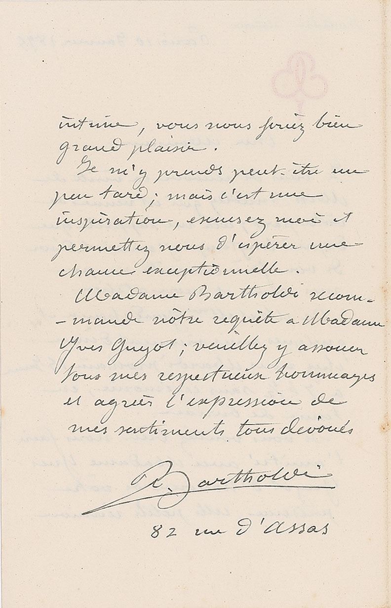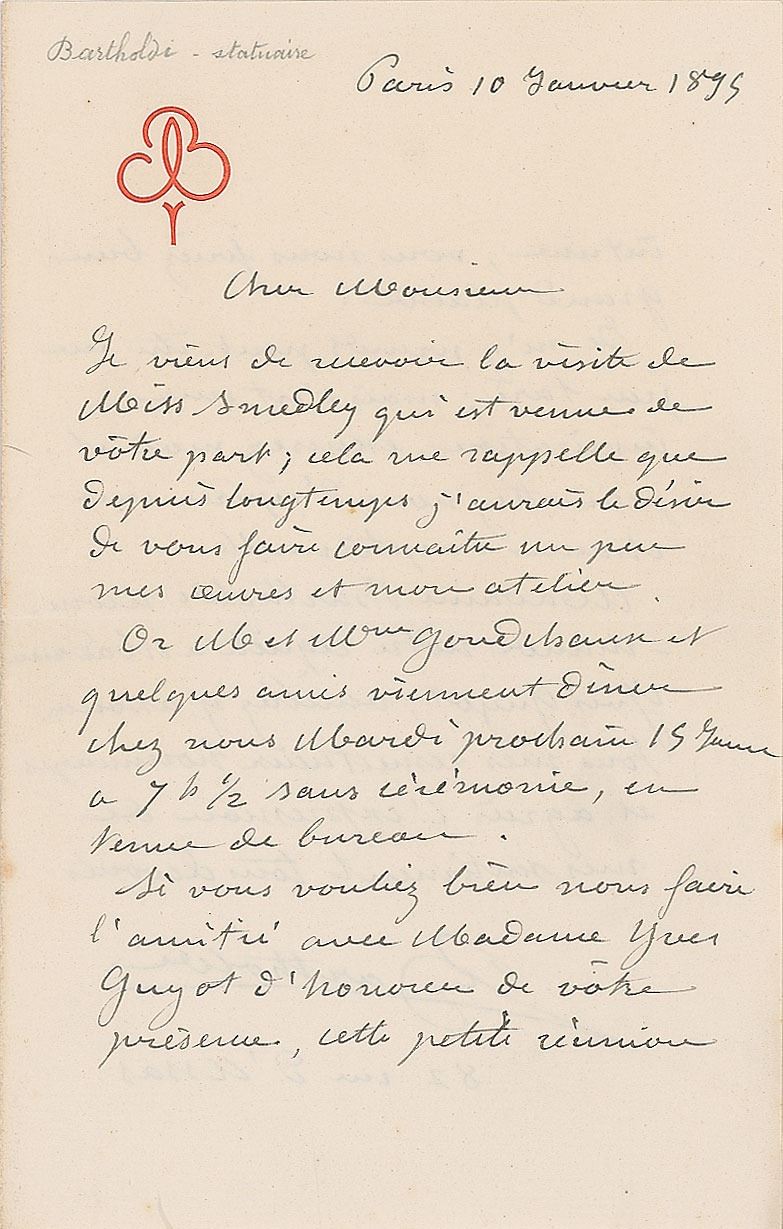 ALS in French, signed “Bartholdi,” one page both sides, 4.5 x 7, personal letterhead, January 10, 1895. Letter to a gentleman, in full (translated): "I come to receive the visit of Miss Smedley who came from you; it reminds me that for a long time I would have wanted to let you know a bit about my works and my workshop. However Mr. and Mrs. Goudchaun and a few friends come to dine with us Tuesday, January 15th at 7 1/2 hours without ceremony, in office attire. If you would be so kind as to make friends with Madame Yves Guyot to honor your presence, this intimate little meeting, you would be very happy. I may be doing it a little late; but it is an inspiration, excuse me and allow us to hope an exceptional chance. Madame Bartholdi recommends your request to Madame Yves Guyot; please assure all my respectful tributes and accept the expression of my all devoted feelings." In fine condition.