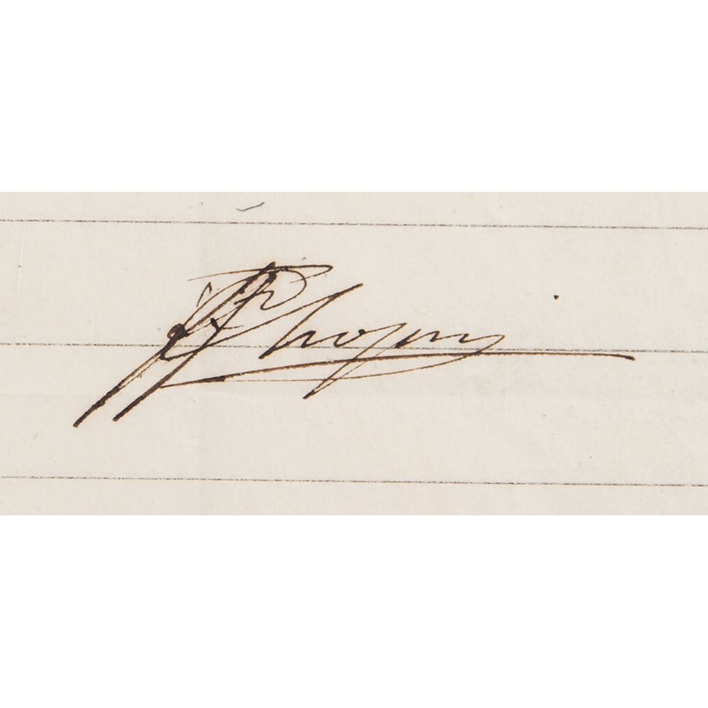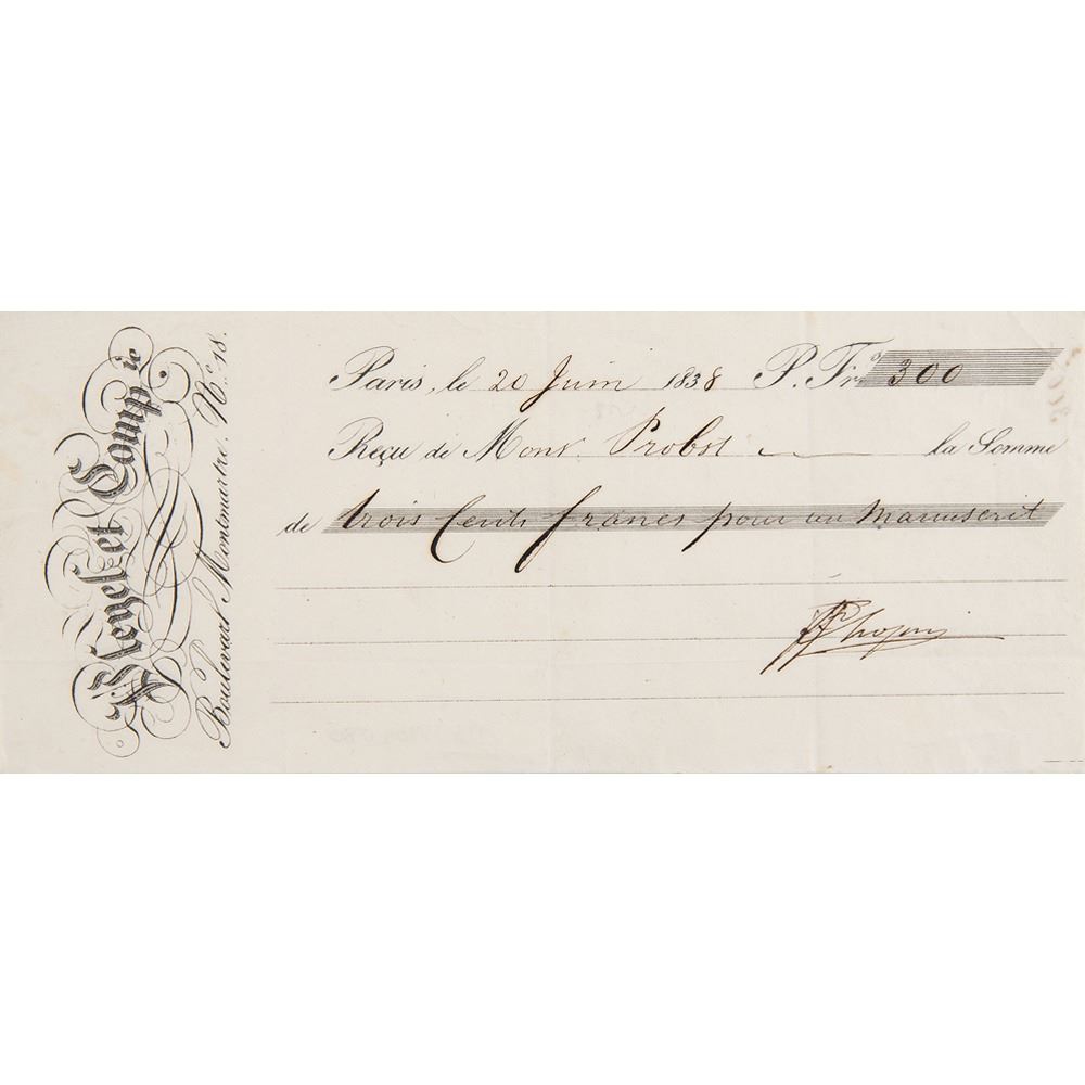 Choice partly-printed DS in French, signed “F. Chopin,” one page, 8 x 3.5, June 20, 1838. Receipt from the Paris firm Pleyel et Comp., completed in another hand and signed at the conclusion by Frederic Chopin, acknowledging (translated): "Received from Mons. Probst the sum of three hundred francs for a manuscript." In fine condition.