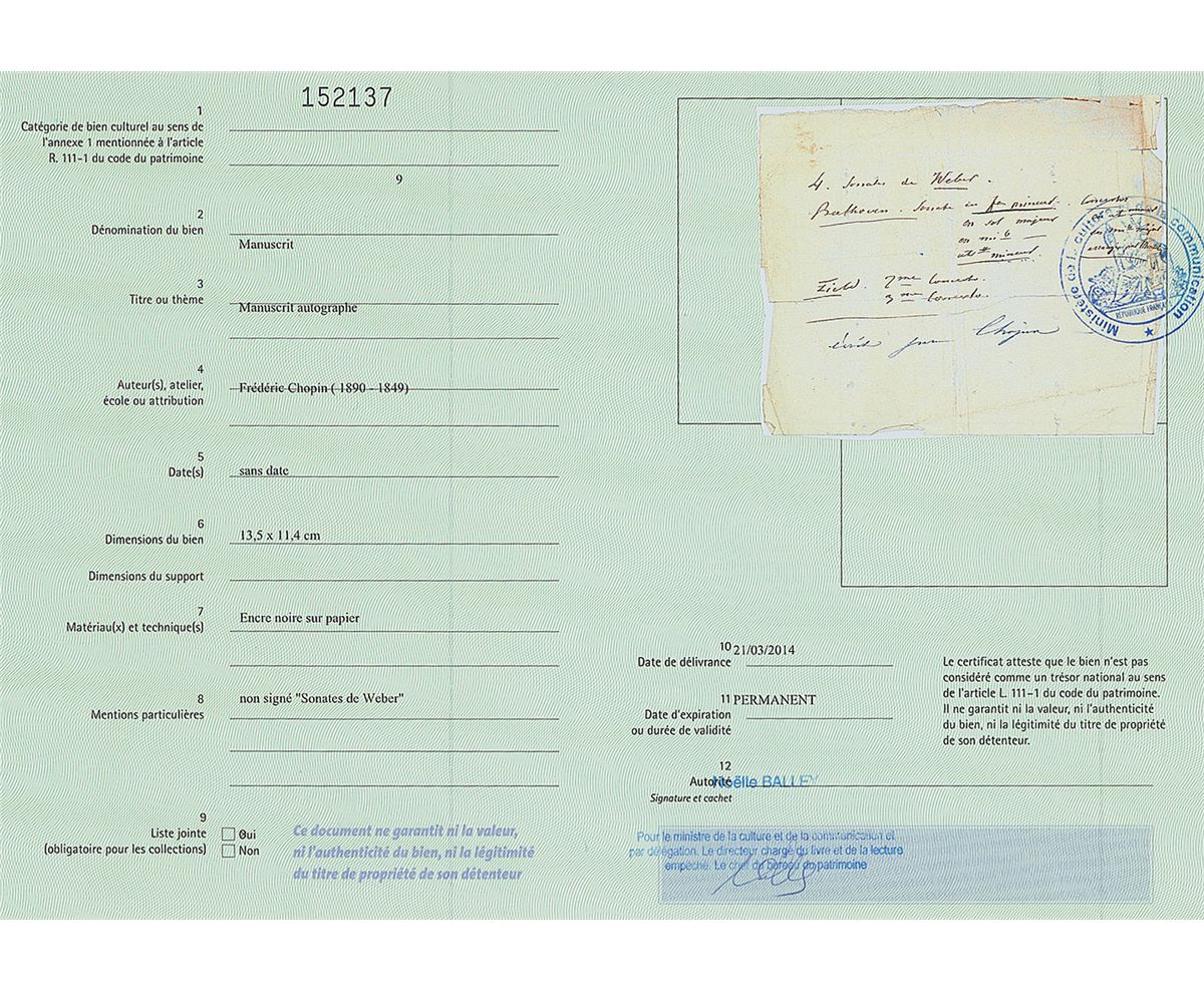 Polish composer (1810–1849) considered one of the great masters of Romantic music. Exceedingly rare handwritten notes in French, unsigned, one page, 5.25 x 4.25, no date. Chopin pens seven lines, seemingly concerning a concert program. In part: “4. Sonatas Weber…Beethoven Sonata…primeur Concertos…Field 2nd Concerto…3rd Concerto.” An identification notation in another hand is penned below. Intersecting folds with a partial separation to a horizontal fold (passing through the last line of Chopin’s writing), heavy overall creases, and a few edge tears, otherwise very good condition. Accompanied by an export certificate from the French Ministry of Culture. This brief note was presumably prepared for a concert program or perhaps a pupil, and lists works by composers greatly admired by Chopin—Carl Maria von Weber, Ludwig van Beethoven, and John Field. Chopin is rare in any format, and this is a magnificent piece with crisp writing and extraordinary musical associations.