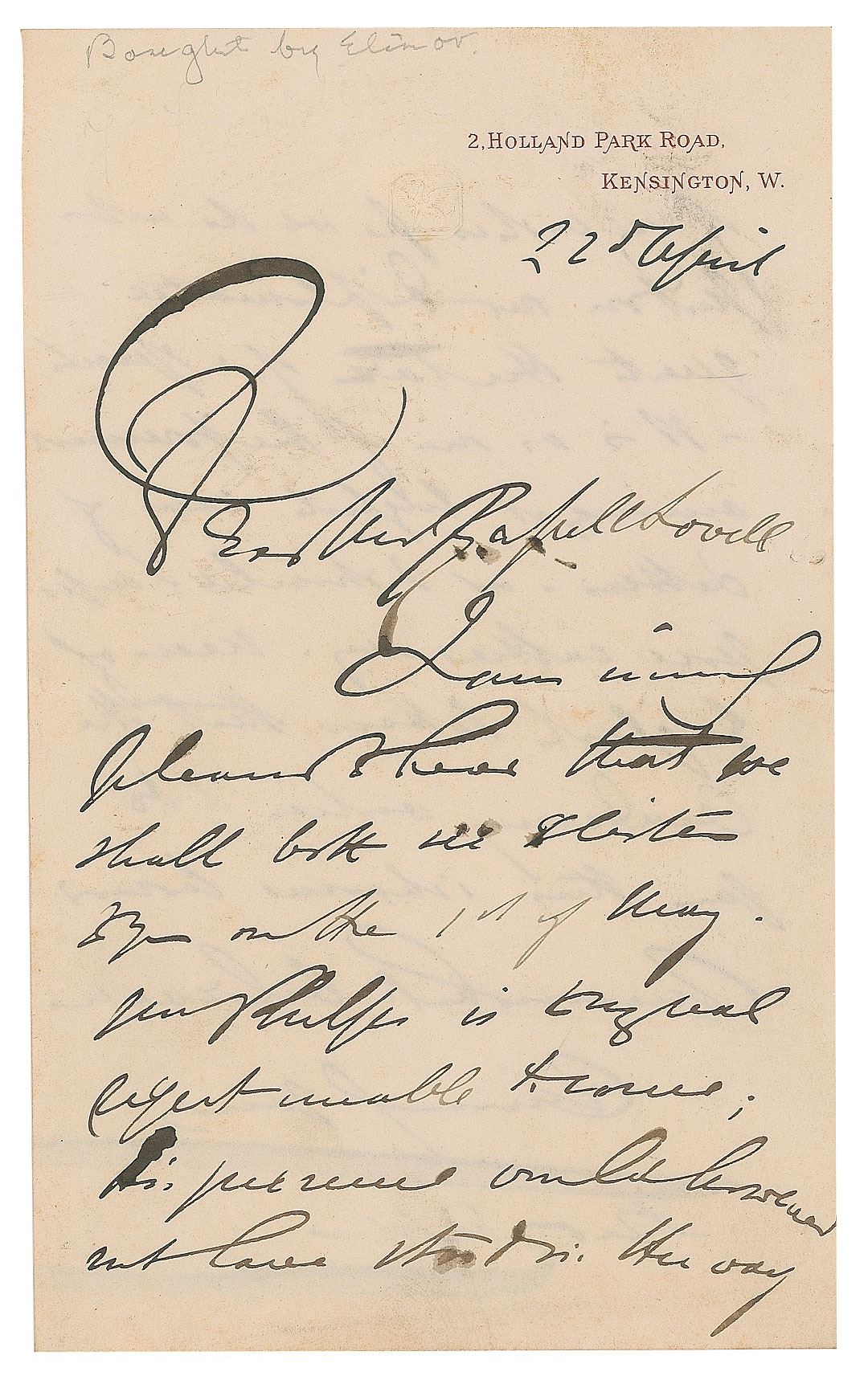 English painter and sculptor (1830–1896) associated with the Pre-Raphaelite Brotherhood. Two letters by Leighton: an ALS signed "Always yours in art, Fred. Leighton," three pages on two adjoining sheets, personal letterhead, 4.5 x 7, no date, to pianist and composer Charles Halle, in part: "May I hope that you will cement the kindness of coming years & play at my studio again this year also? I have had a talk with Joachim whose time during his too short stay is already almost filled up, and he finds that he has the 25th (afternoon)…free. I so trust it may chance that you too are free on that day"; and an ALS signed "Fred. Leighton," one page both sides, 4.5 x 7, April 22, [no year], regarding upcoming plans with "diplomatic guests." In overall fine condition.