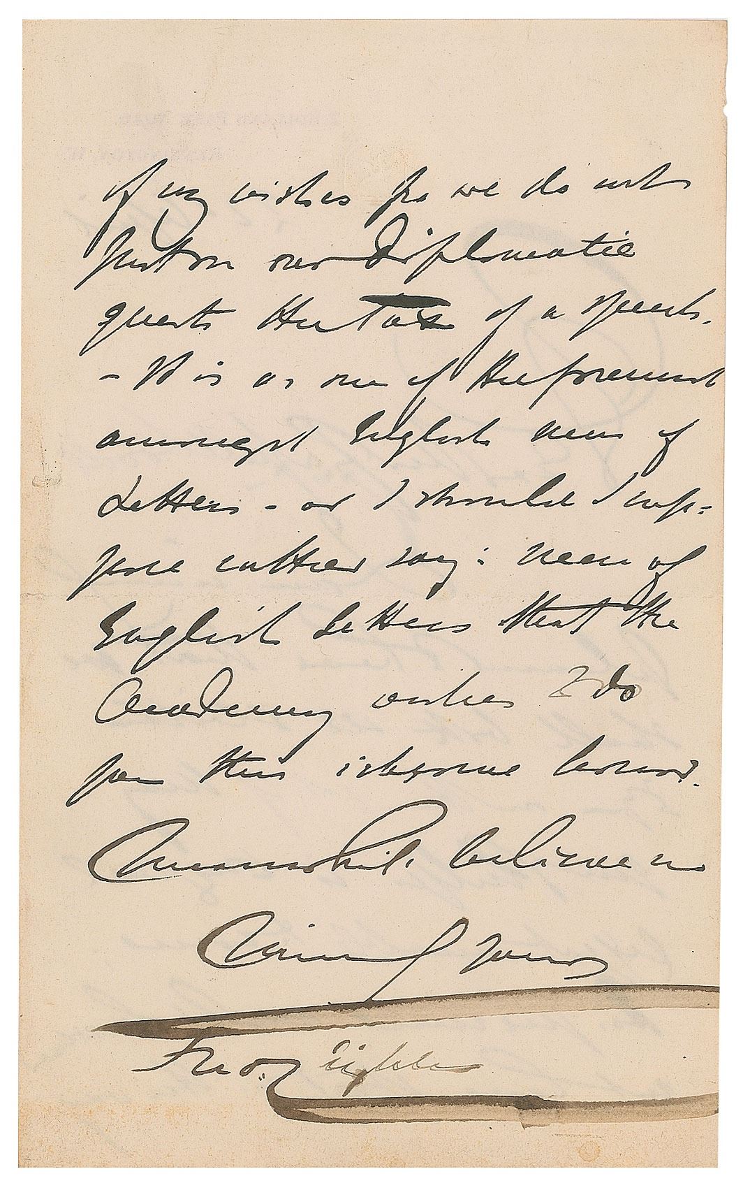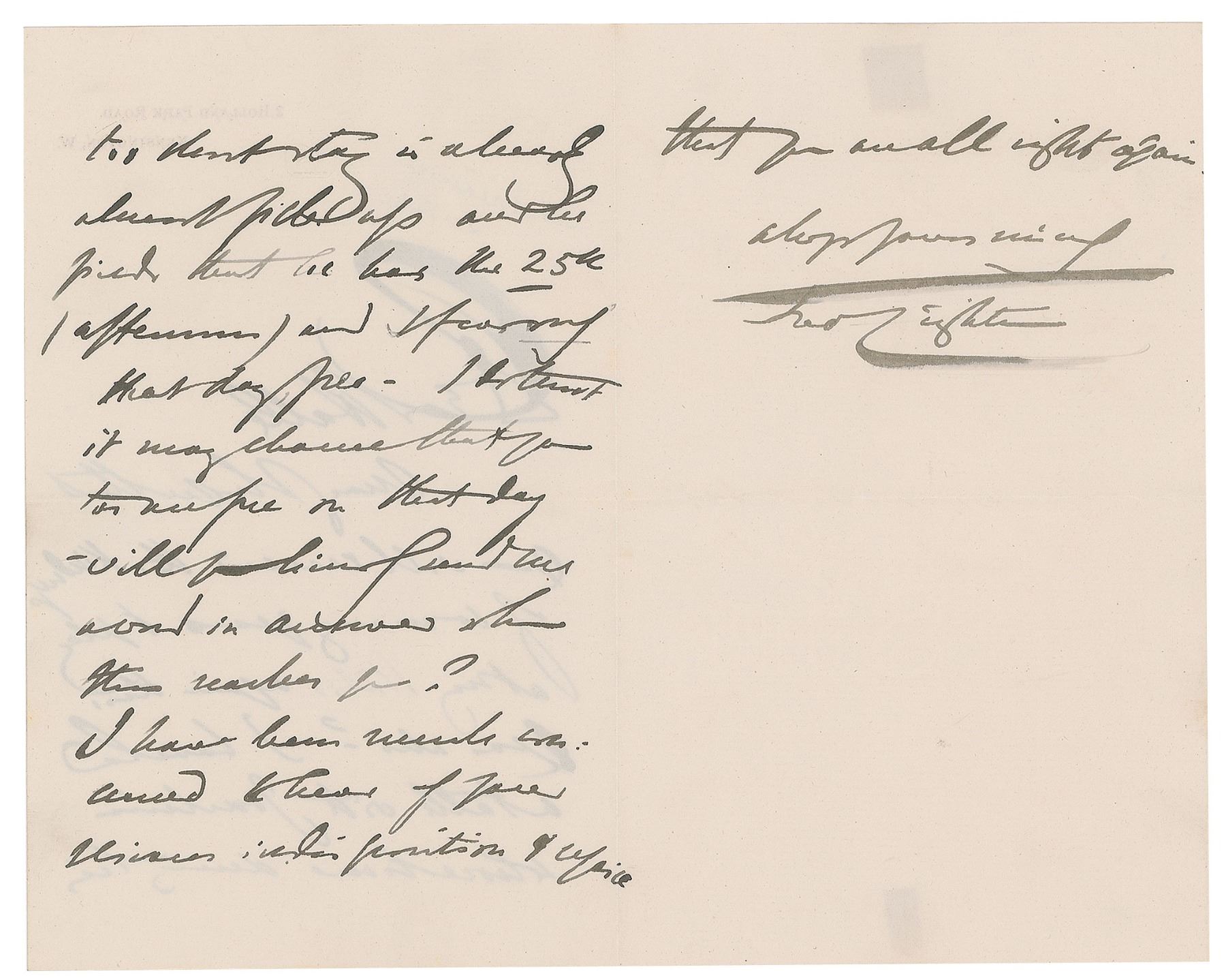 English painter and sculptor (1830–1896) associated with the Pre-Raphaelite Brotherhood. Two letters by Leighton: an ALS signed "Always yours in art, Fred. Leighton," three pages on two adjoining sheets, personal letterhead, 4.5 x 7, no date, to pianist and composer Charles Halle, in part: "May I hope that you will cement the kindness of coming years & play at my studio again this year also? I have had a talk with Joachim whose time during his too short stay is already almost filled up, and he finds that he has the 25th (afternoon)…free. I so trust it may chance that you too are free on that day"; and an ALS signed "Fred. Leighton," one page both sides, 4.5 x 7, April 22, [no year], regarding upcoming plans with "diplomatic guests." In overall fine condition.
