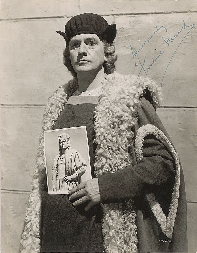 Vintage glossy 7.5 x 9.75 Gainsborough Pictures publicity photo of March as Christopher Columbus, signed in fountain pen. Lightly trimmed edges, some light creases, and mild curling to vertical edges, otherwise fine condition.