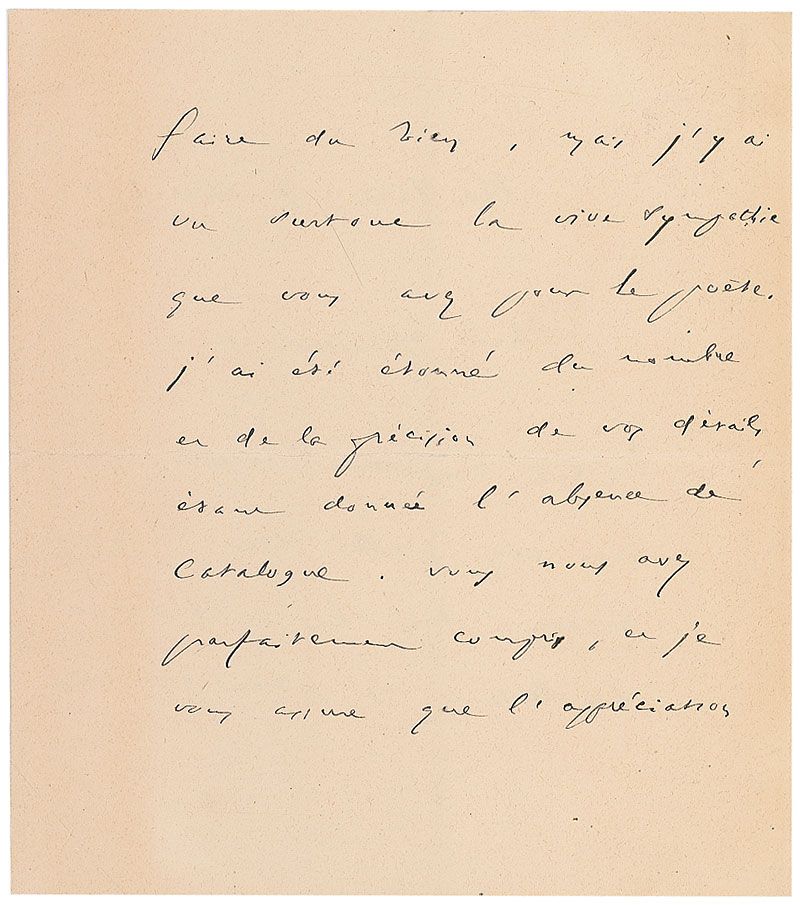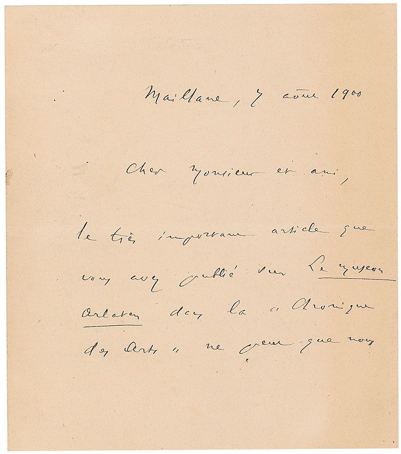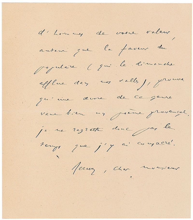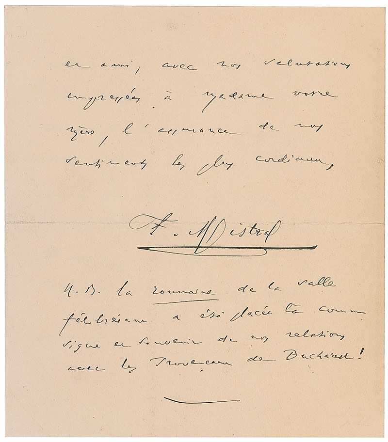 French poet (1830–1914) who shared the 1904 Nobel Prize in Literature. ALS in French, signed “F. Mistral,” four pages on two adjoining sheets, 5 x 6, August 7, 1900. Letter to Clement-Janin. In full (translated): “The very important article you published on the Museon Arleton (Arles Museum) in the ‘Chronique des Arts’ can only do good for us. Above all, I saw in it your keen sympathy for the poet. I was astonished by the quality and quantity of the details you gave even though you didn’t have the catalog. You have understood us perfectly, and I assure you that being appreciated by men of your value as well as the favorable interest of the general public (which turns out in great numbers… in our galleries) proves that an undertaking of this kind is well worth a poem in the Provencal language and I therefore don’t regret the time I devoted to it.” After his signature he adds, “N. B. The Romanian Woman of the Felibrienne gallery has been put there as a token of our memory of our relations with the Provencal people of Bucharest!” In fine condition, with a central horizontal fold through top of signature and some mild toning. Accompanied by the original mailing envelope. Mistral affirmed the relationship between Romanian and Provencal with his poem ‘To Romania.’