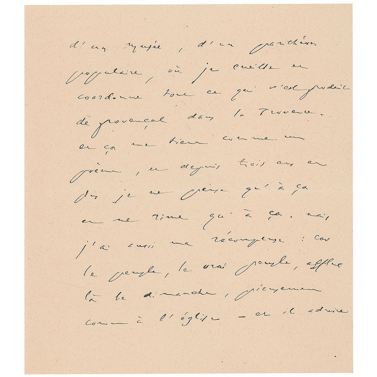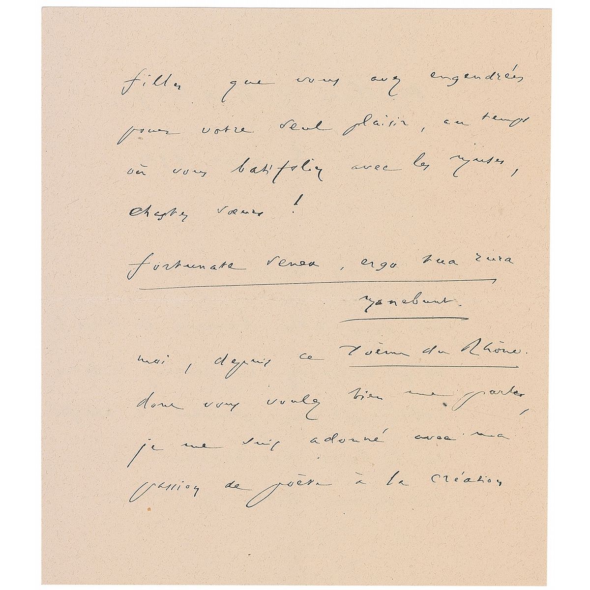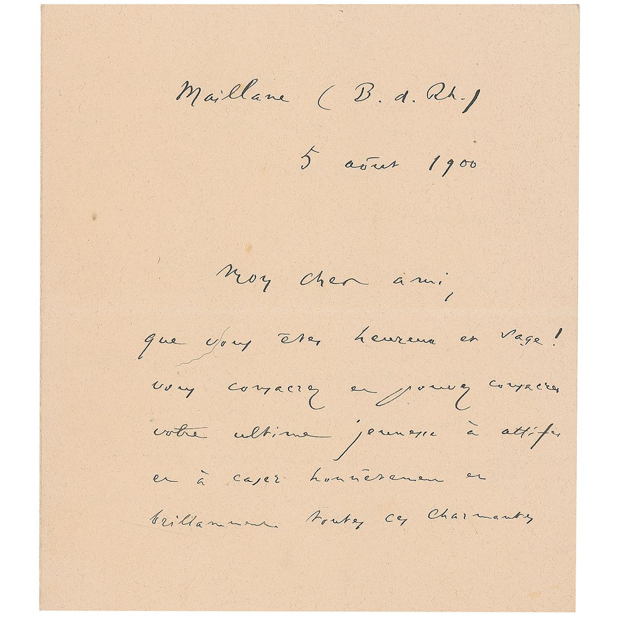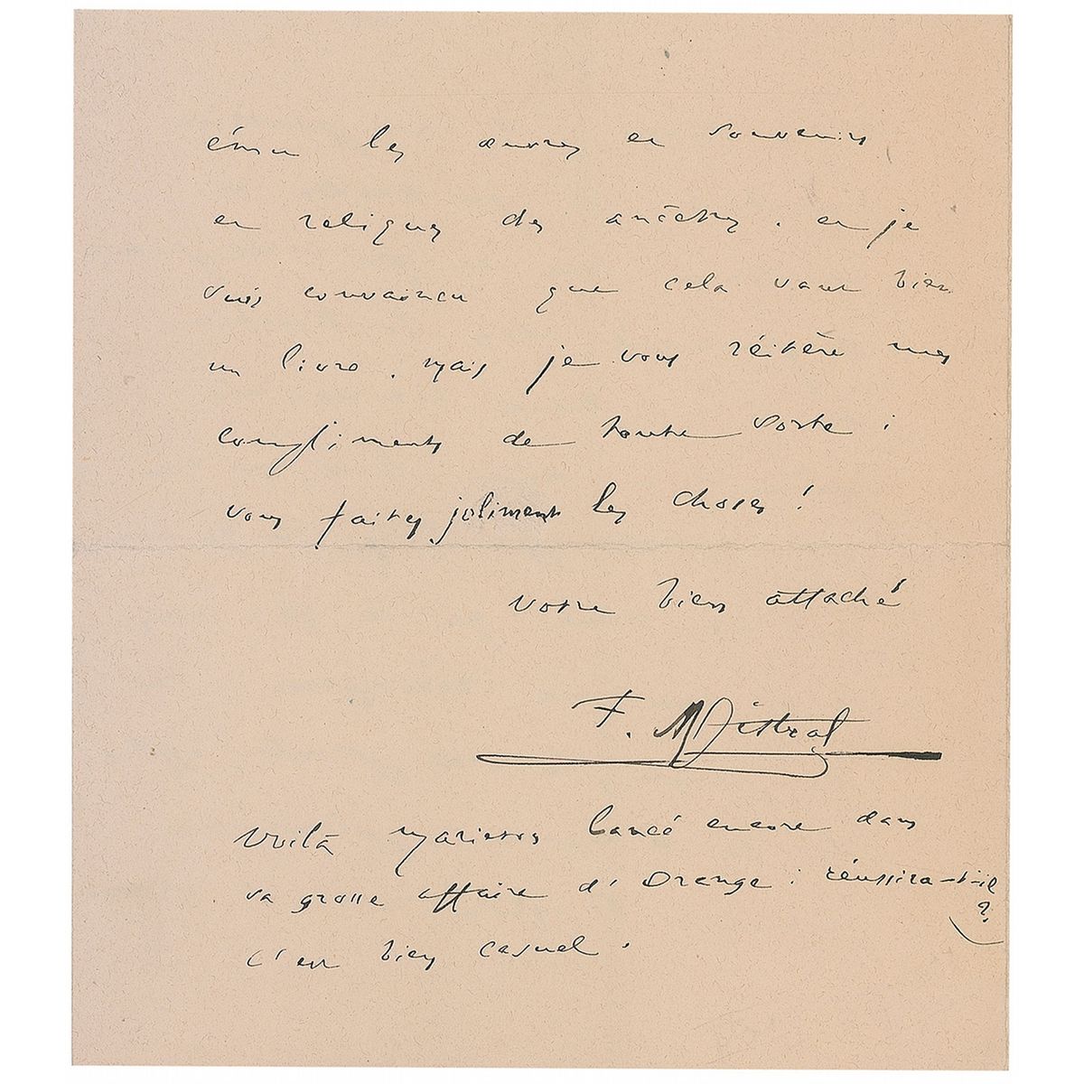 French poet (1830–1914) who shared the 1904 Nobel Prize in Literature. Untranslated ALS in French, signed “F. Mistral,” four pages on two adjoining sheets, 5 x 5.75, August 5, 1900. In fine condition.