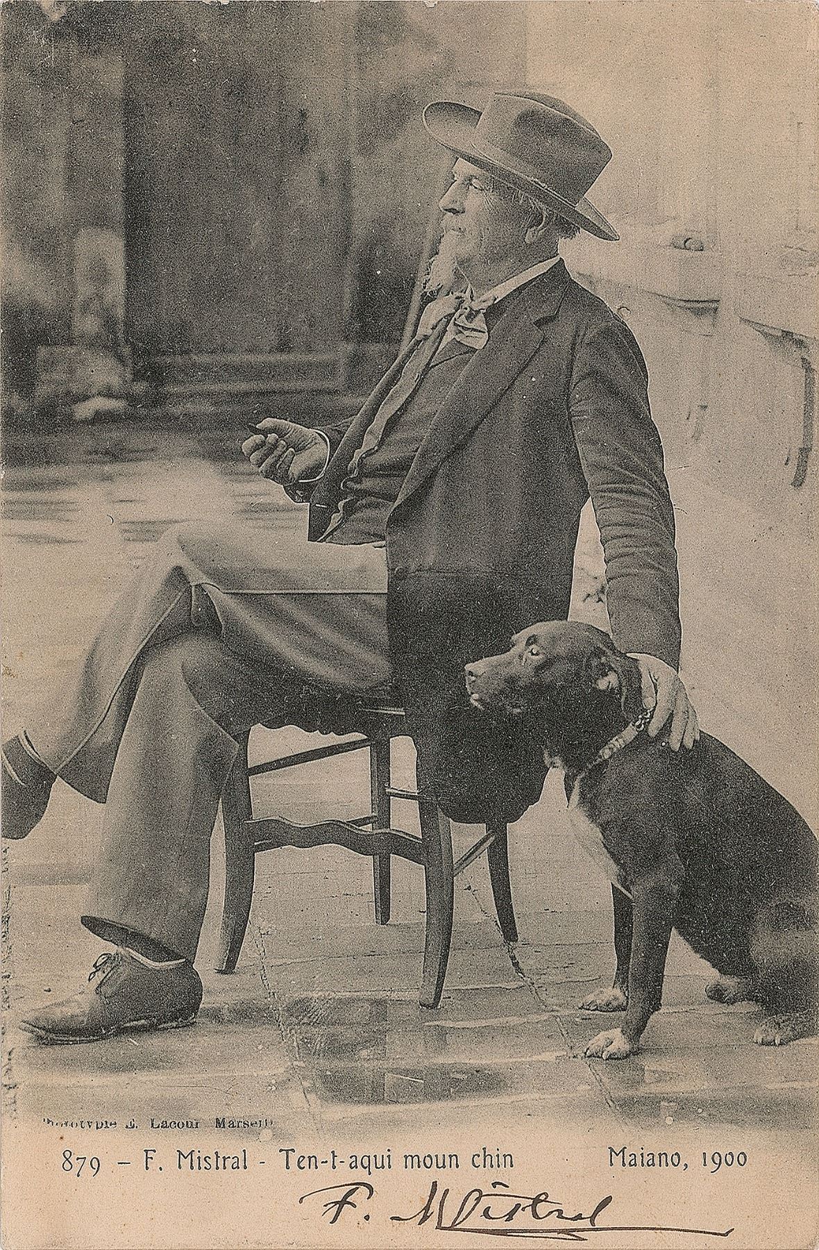 French poet (1830-1914) who shared the 1904 Nobel Prize in Literature. Wonderful matte-finish 3.5 x 5.25 postcard photo of Mistral seated, smoking, and petting his dog, signed in the lower border in black ink, F. Mistral." Collector's notations on reverse indicate that the signature was obtained in Arles on May 7, 1908. In fine condition, with a light crease to the upper background. Mistral received the 1904 Nobel Prize in Literature 'in recognition of the fresh originality and true inspiration of his poetic production, which faithfully reflects the natural scenery and native spirit of his people, and, in addition, his significant work as a Provençal philologist.'