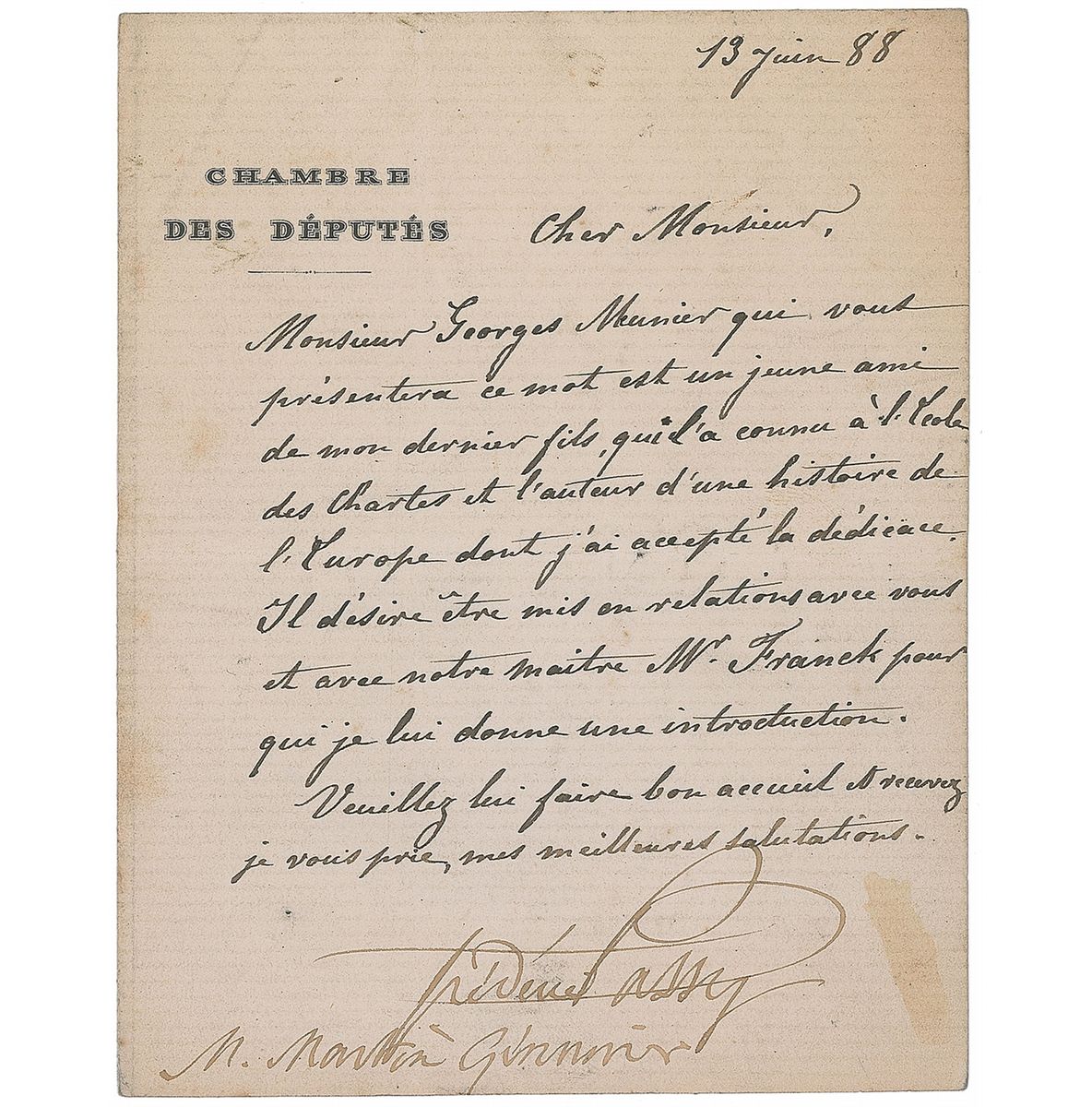 French economist (1822–1912) and a joint winner (together with Henry Dunant) of the first Nobel Peace Prize awarded in 1901. Untranslated LS in French, one page, 4 x 5.25, Chambre des Deputes letterhead, June 13, 1888. Light scattered stains and toning, otherwise fine condition.