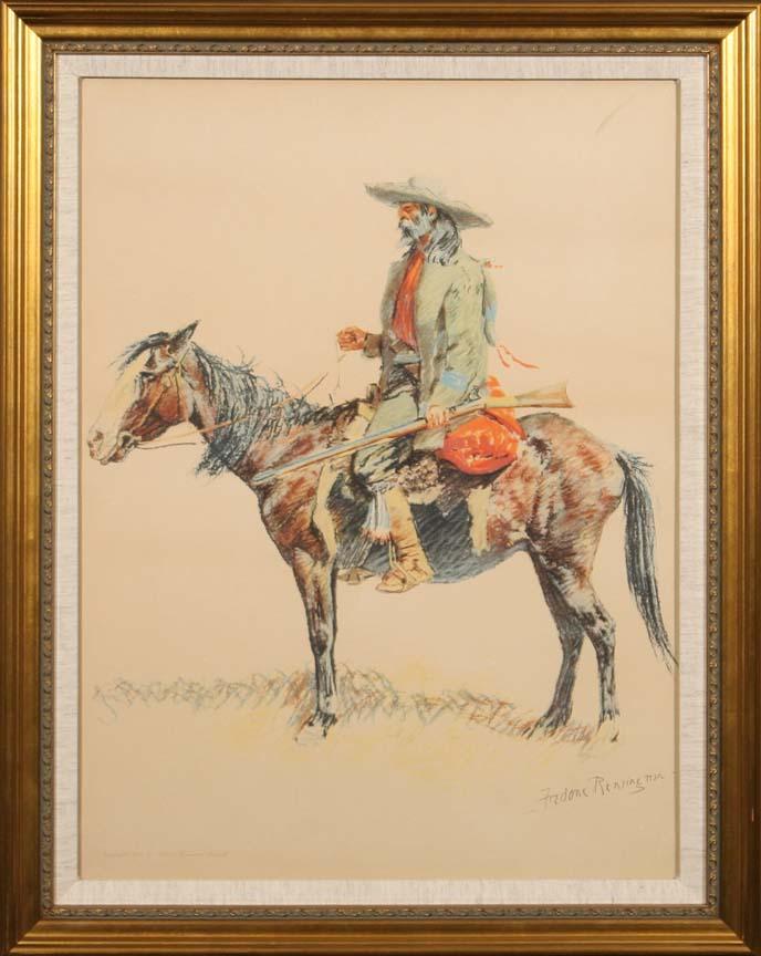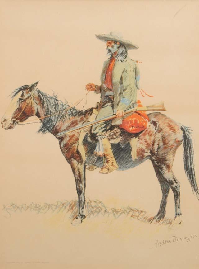 Frederic Remington (1861-1909) . The Buckskinner. 20" x 14 ½" chromolithograph. Signed in plate. Copyright 1904 by Robert Howard Russell. (est $2,000-3,000). For condition reports please visit: www.auctioninsantafe.com/cr2011.pdf