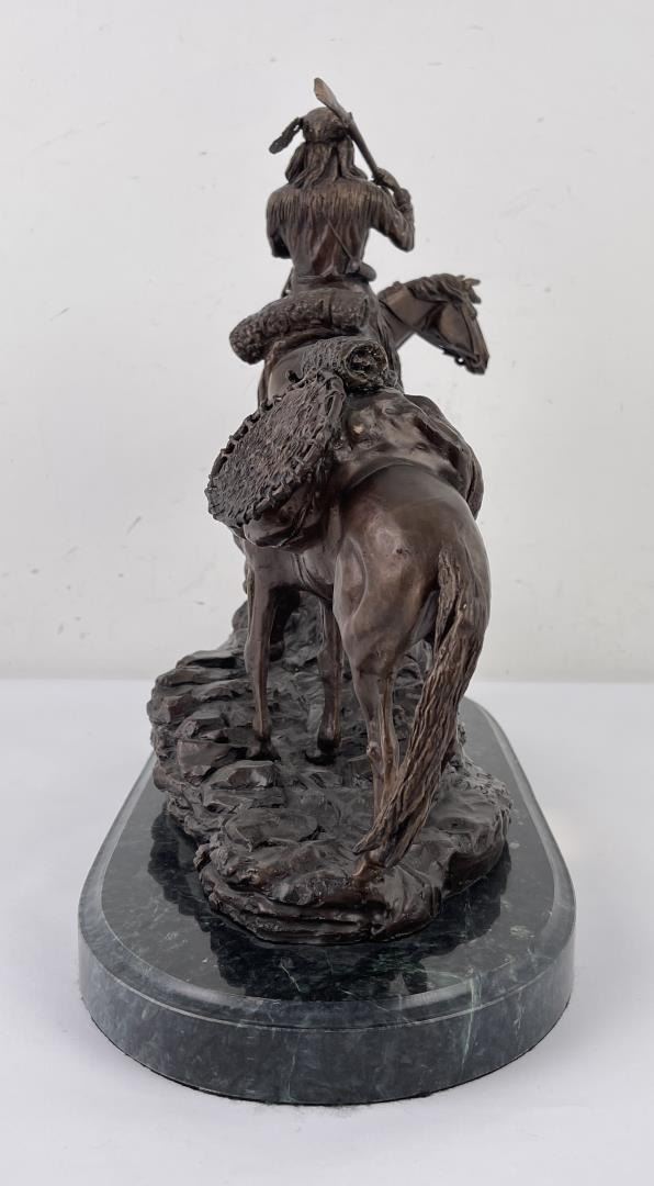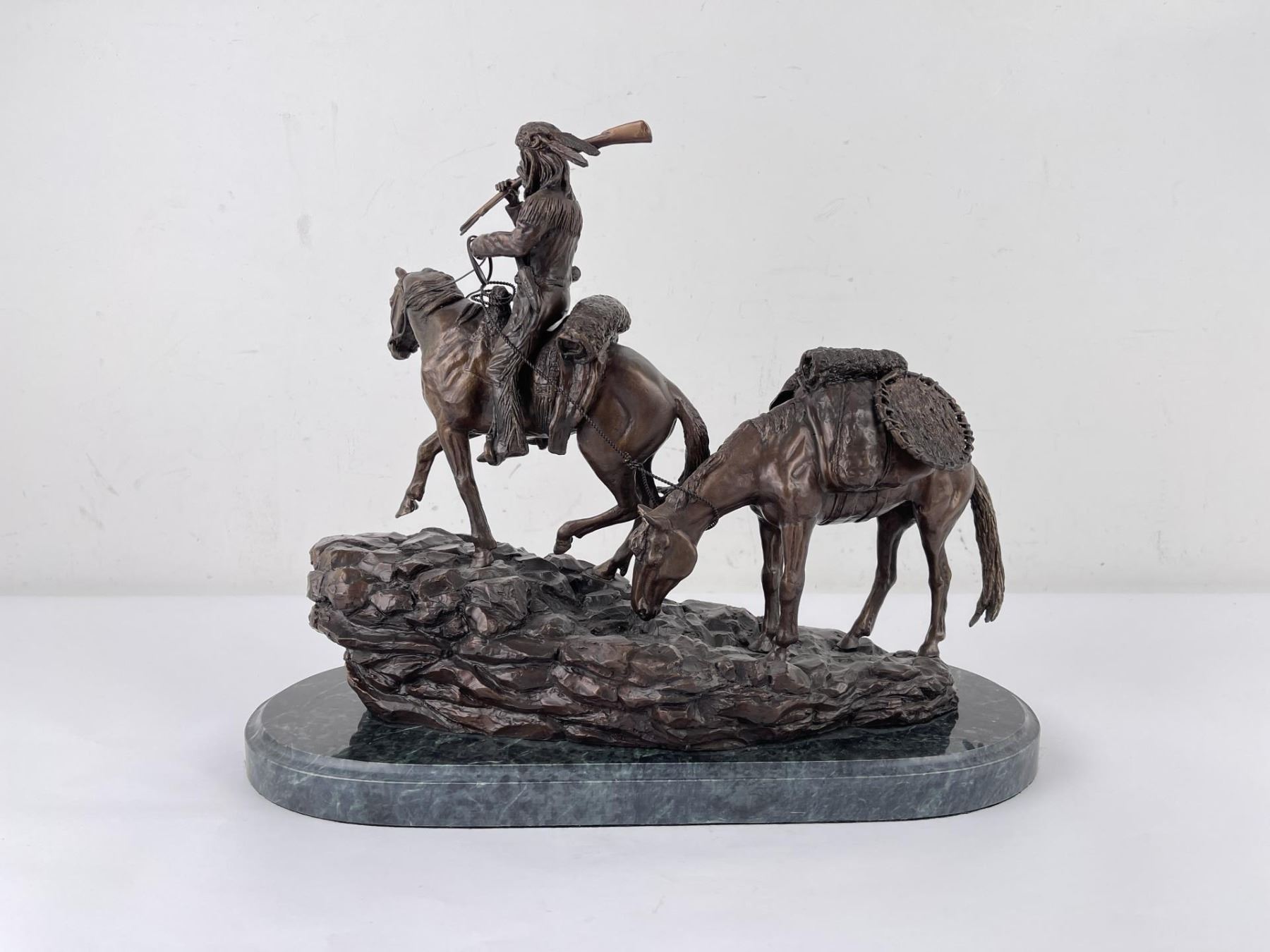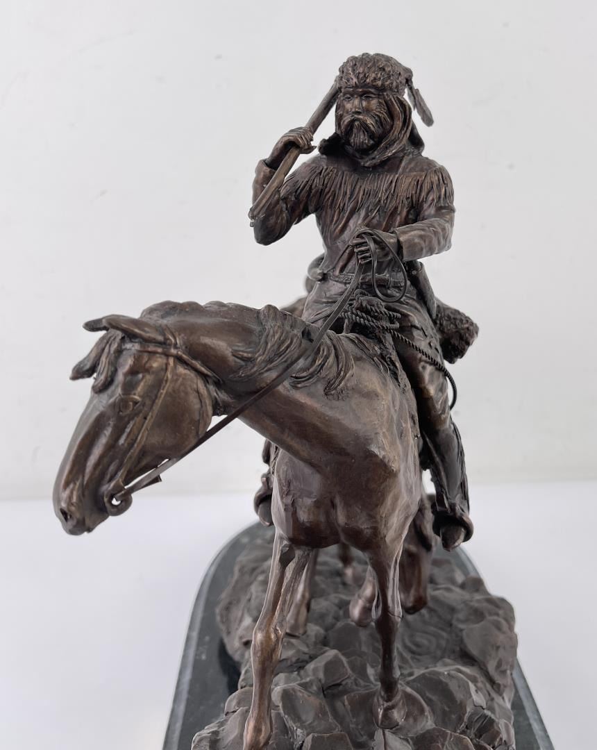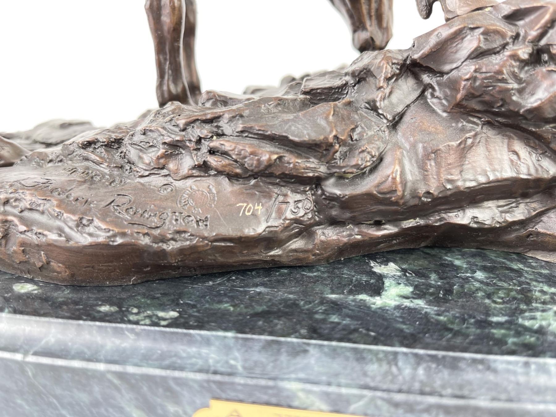 19" long, 15" tall. After Frederic Remington. In his lifetime polymath Frederic Remington was the most successful and famous Western American artist. His immense talents included excelling as an illustrator, author, sculptor, and fine artist. His was a life tragically cut short. Born on October 4, 1861 in Canton, a small berg in bucolic upper state New York, he was much influenced by his father Seth Pierpont Remington, a Republican journalist who founded the St. Lawrence Plaindealer. His father had been a captain in the Civil War, and in 1870 President Ulysses S. Grant appointed him United States Collector of the Port of Ogdensburg, New York. In 1876 young Frederic enrolled at Highland Military Academy in Worcester, Massachusetts where he studied for the next two years. Two years later he enrolled at Yale for one year to study in the School of Fine Arts. His two loves were art and football. Only three months into school, he published his first illustration in the on-campus newspaper Yale Courant. On the gridiron he was a natural, demonstrating great strength and agility. Like Theodore Roosevelt, Remington also enjoyed boxing. A year later he met his future wife Eva Caten from Gloversville, New York. After the death of Remington’s father from tuberculosis on February 18, 1879, Eva rejected his first marriage proposal. Floundering, Remington headed to the American West to find himself—much like Theodore Roosevelt did when his mother and wife died on the same day. That led to a trip to Montana where he completed a number of sketches. Invigorated by his Western experiences, in February 1883 he headed to Kansas and with part of his inheritance bought a 160 acre sheep ranch near Peabody, Kansas. That failed adventure lasted about a year, and he then relocated to Kansas City, Missouri where Eva would join him as his wife. Yet he squandered the rest of his inheritance on a saloon there. After more illustrations were sold to Harper’s Weekly, in 1885 the Remingtons moved to New York City, and in 1886 he attended the Art Students League. By then Remington was earning $1,200 a year, twice the income of a school teacher. Other magazines such as St. Nicholas and Outing also published his art. His work certainly impressed a young Theodore Roosevelt who was chronicling his life in Medora—now in North Dakota—for a serial that ran in The Century Magazine. It was very common at the time for authors to serialize their works in magazines before they were published in book form. In the fall of 1887 Remington was commissioned to illustrate the magazine stories which ended up in Roosevelt’s 1888 classic book Ranch Life and the Hunting Trail. Early on, a lasting friendship between the two was cemented through these publications. By 1889 he had garnered national notoriety as one of the most accomplished illustrators in the country. He was a national celebrity. In 1889 his monumental canvas A Dash for the Timber was exhibited at the National Academy of Design. The New York Times reported, "The picture at the Autumn exhibition of the Academy of Design before which stands the largest number of people is Frederic Remington’s Dash for the Timber." A Silver medal for Last Lull in the Fight followed at the Exposition Universelle in Paris. In 1891 the National Academy of Design elected Remington as an Associate member. Yet he was never admitted as National Academician, despite support from fellow artists Gilbert Gaul, Childe Hassam, and others. His financial success allowed the Remingtons to move into a grand home he named Ednion Algonquin for "a place where I live in New Rochelle, New York. A young Norman Rockwell would someday paint in his studio. Through his travels, Remington embraced social Darwinism survival of the fittest that championed the U.S. military’s domination of the inferior Native Americans. Theodore Roosevelt, George Armstrong Custer, and Remington along with most other Americans—idolized Charles Darwin. As early as 1888 Remington started contributing short stories along with illustrations to magazines. His writings teemed with romantic Western stories chalk full of drama and violence. Initially, they presented the cavalryman as the hero and the Indian as the villain, especially when the Indian had been tainted with the vices of the white man. His West was the "frontier model where the fittest were rugged individuals from northern Europe and white Americans. Even though he was an accomplished author and painter, perhaps his greatest talent was as a sculptor. His bronzes are more famous and collectible than any other Western American artist. And yet his bronze repertoire was completed in just fourteen years. Starting in order of modeling, they are: The Broncho Buster, The Wounded Bunkie, The Wicked Pony, The Scalp, The Norther, The Cheyenne, The Buffalo Signal, Coming Through the Rye, The Mountain Man, The Sergeant, Paleolithic Man, Savage, Polo, The Rattlesnake, Dragoons 1850, The Outlaw, The Horse Thief, The Buffalo Horse, The Cowboy, Trooper of the Plains 1868, The Broncho Buster (large), and The Stampede. His Coming Through the Rye was widely viewed by the public at two world’s fairs. A New Jersey artisan in 1904 was commissioned by Remington to produce a heroic size plaster of the sculpture for the 1904 Louisiana Purchase Exposition in St. Louis, Missouri (called Off the Trail). It was then shipped to Portland, Oregon the next year for the Lewis and Clark Exposition and titled Shooting Up the Town. The Cowboy—his only monumental bronze—was commissioned in 1905 by the Fairmount Park Art Association in Philadelphia. The twelve feet high bronze was shipped to Philadelphia in May 1908 and unveiled in the park as The Mounted Cowboy. In 1900 Remington turned to Riccardo Bertelli at Roman Bronze Works in Brooklyn to cast his bronzes by the lost-wax casting process which allowed higher detail in the finished product. The Norther that year was his first bronze by this method. The Chey