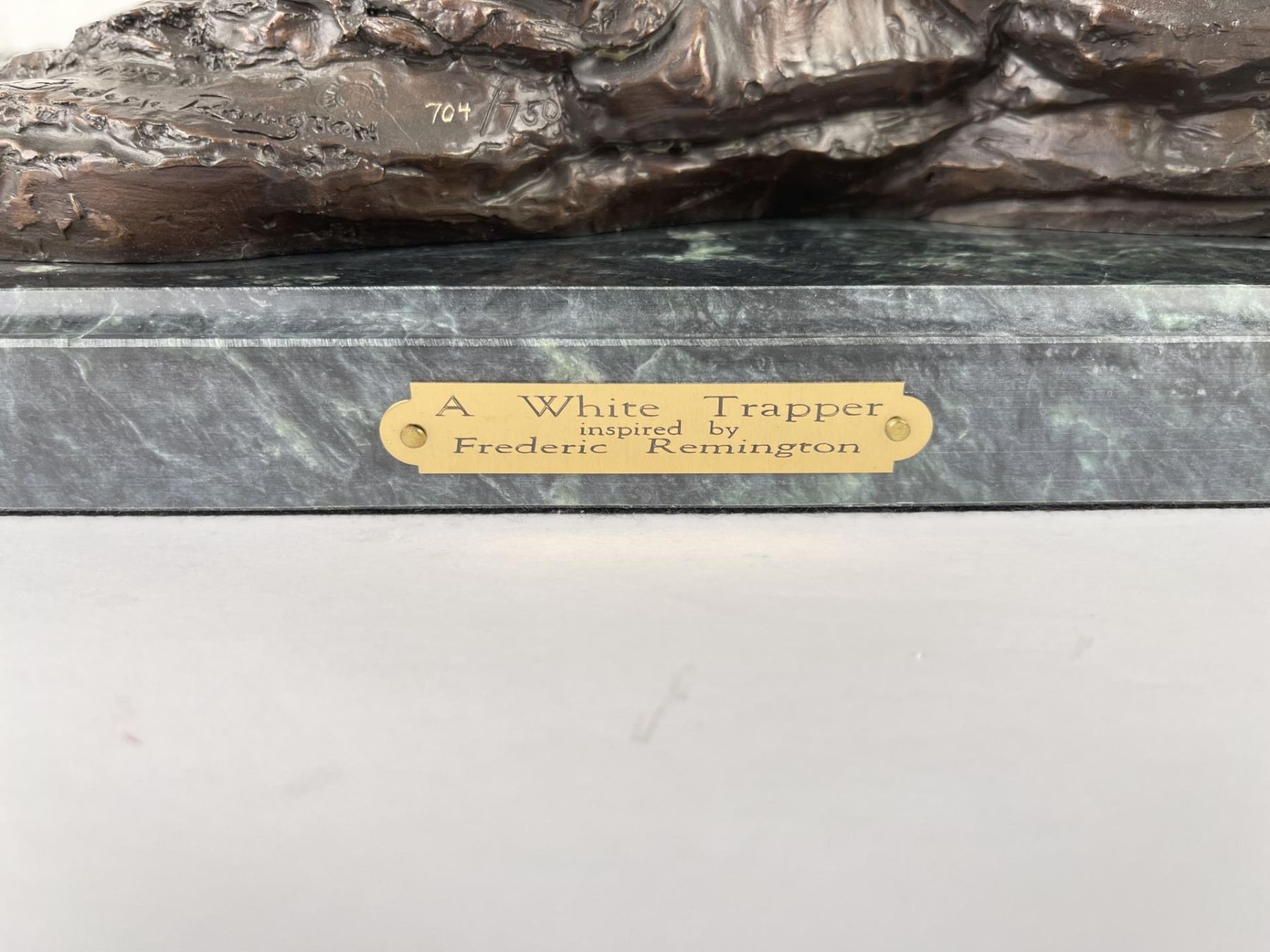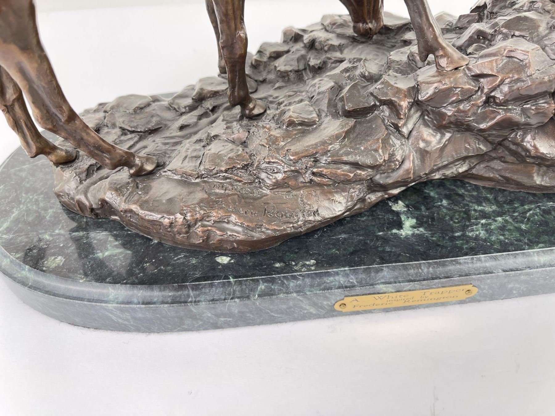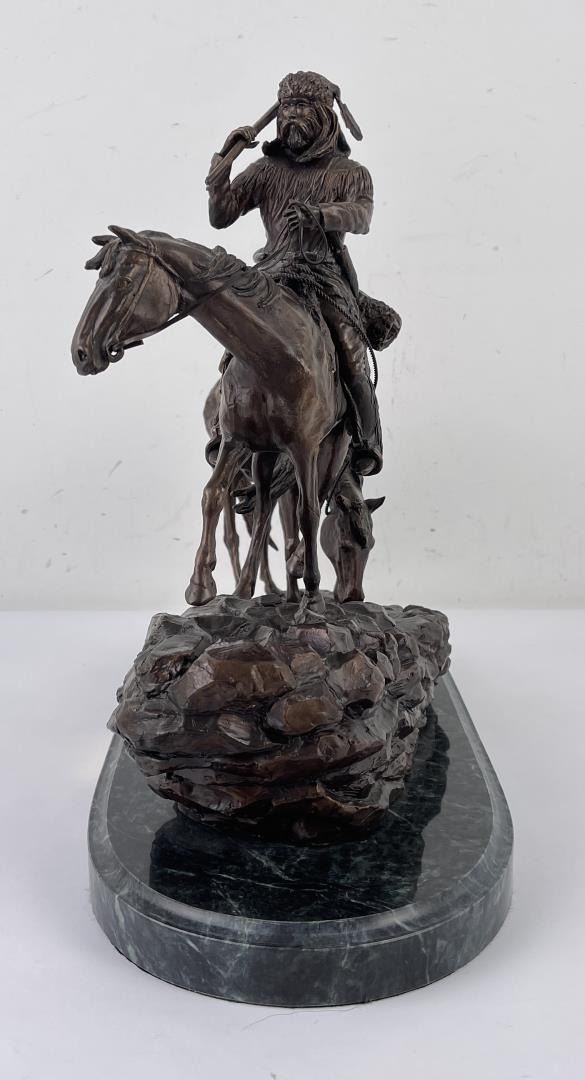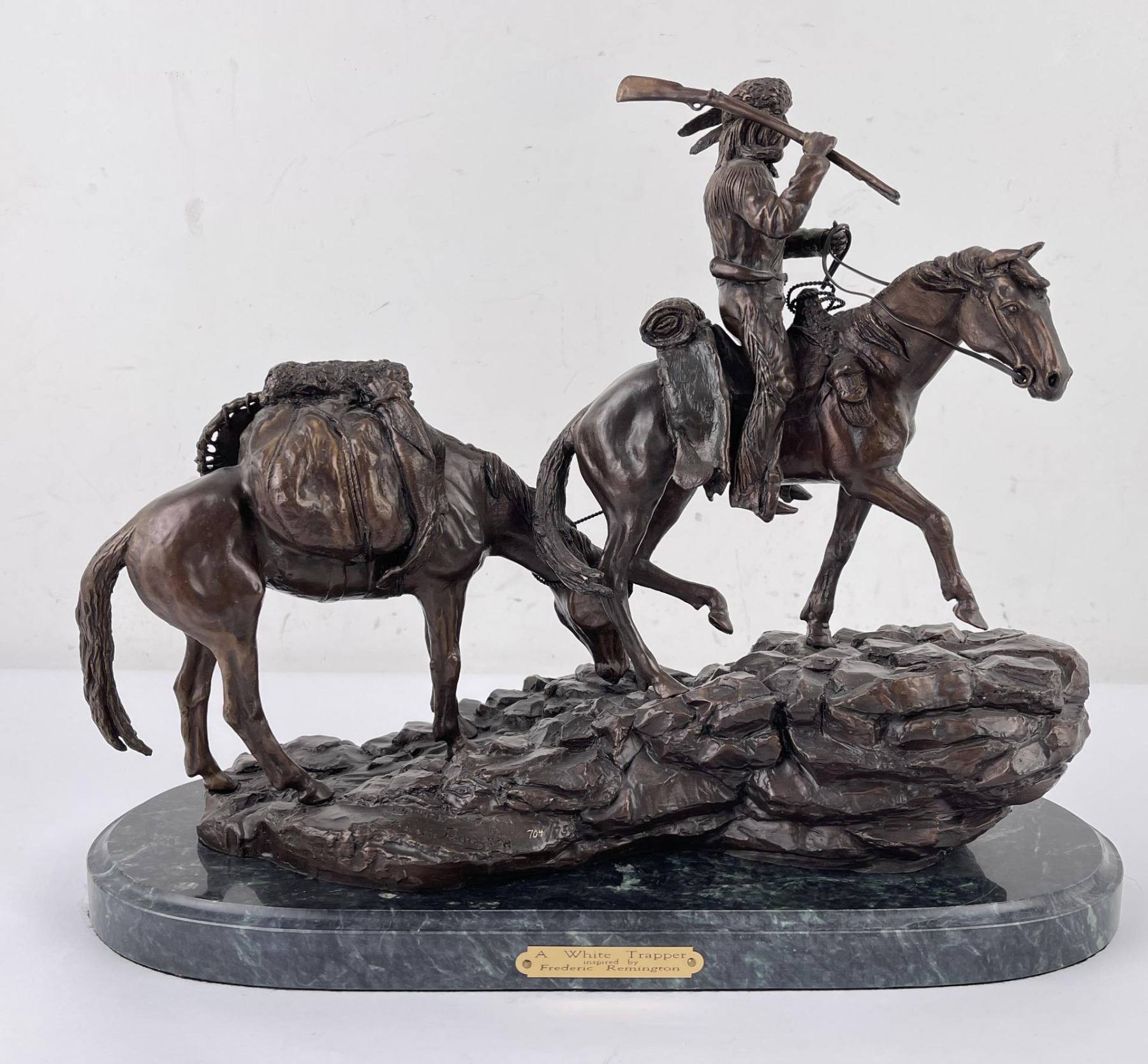 19" long, 15" tall. After Frederic Remington. In his lifetime polymath Frederic Remington was the most successful and famous Western American artist. His immense talents included excelling as an illustrator, author, sculptor, and fine artist. His was a life tragically cut short. Born on October 4, 1861 in Canton, a small berg in bucolic upper state New York, he was much influenced by his father Seth Pierpont Remington, a Republican journalist who founded the St. Lawrence Plaindealer. His father had been a captain in the Civil War, and in 1870 President Ulysses S. Grant appointed him United States Collector of the Port of Ogdensburg, New York. In 1876 young Frederic enrolled at Highland Military Academy in Worcester, Massachusetts where he studied for the next two years. Two years later he enrolled at Yale for one year to study in the School of Fine Arts. His two loves were art and football. Only three months into school, he published his first illustration in the on-campus newspaper Yale Courant. On the gridiron he was a natural, demonstrating great strength and agility. Like Theodore Roosevelt, Remington also enjoyed boxing. A year later he met his future wife Eva Caten from Gloversville, New York. After the death of Remington’s father from tuberculosis on February 18, 1879, Eva rejected his first marriage proposal. Floundering, Remington headed to the American West to find himself—much like Theodore Roosevelt did when his mother and wife died on the same day. That led to a trip to Montana where he completed a number of sketches. Invigorated by his Western experiences, in February 1883 he headed to Kansas and with part of his inheritance bought a 160 acre sheep ranch near Peabody, Kansas. That failed adventure lasted about a year, and he then relocated to Kansas City, Missouri where Eva would join him as his wife. Yet he squandered the rest of his inheritance on a saloon there. After more illustrations were sold to Harper’s Weekly, in 1885 the Remingtons moved to New York City, and in 1886 he attended the Art Students League. By then Remington was earning $1,200 a year, twice the income of a school teacher. Other magazines such as St. Nicholas and Outing also published his art. His work certainly impressed a young Theodore Roosevelt who was chronicling his life in Medora—now in North Dakota—for a serial that ran in The Century Magazine. It was very common at the time for authors to serialize their works in magazines before they were published in book form. In the fall of 1887 Remington was commissioned to illustrate the magazine stories which ended up in Roosevelt’s 1888 classic book Ranch Life and the Hunting Trail. Early on, a lasting friendship between the two was cemented through these publications. By 1889 he had garnered national notoriety as one of the most accomplished illustrators in the country. He was a national celebrity. In 1889 his monumental canvas A Dash for the Timber was exhibited at the National Academy of Design. The New York Times reported, "The picture at the Autumn exhibition of the Academy of Design before which stands the largest number of people is Frederic Remington’s Dash for the Timber." A Silver medal for Last Lull in the Fight followed at the Exposition Universelle in Paris. In 1891 the National Academy of Design elected Remington as an Associate member. Yet he was never admitted as National Academician, despite support from fellow artists Gilbert Gaul, Childe Hassam, and others. His financial success allowed the Remingtons to move into a grand home he named Ednion Algonquin for "a place where I live in New Rochelle, New York. A young Norman Rockwell would someday paint in his studio. Through his travels, Remington embraced social Darwinism survival of the fittest that championed the U.S. military’s domination of the inferior Native Americans. Theodore Roosevelt, George Armstrong Custer, and Remington along with most other Americans—idolized Charles Darwin. As early as 1888 Remington started contributing short stories along with illustrations to magazines. His writings teemed with romantic Western stories chalk full of drama and violence. Initially, they presented the cavalryman as the hero and the Indian as the villain, especially when the Indian had been tainted with the vices of the white man. His West was the "frontier model where the fittest were rugged individuals from northern Europe and white Americans. Even though he was an accomplished author and painter, perhaps his greatest talent was as a sculptor. His bronzes are more famous and collectible than any other Western American artist. And yet his bronze repertoire was completed in just fourteen years. Starting in order of modeling, they are: The Broncho Buster, The Wounded Bunkie, The Wicked Pony, The Scalp, The Norther, The Cheyenne, The Buffalo Signal, Coming Through the Rye, The Mountain Man, The Sergeant, Paleolithic Man, Savage, Polo, The Rattlesnake, Dragoons 1850, The Outlaw, The Horse Thief, The Buffalo Horse, The Cowboy, Trooper of the Plains 1868, The Broncho Buster (large), and The Stampede. His Coming Through the Rye was widely viewed by the public at two world’s fairs. A New Jersey artisan in 1904 was commissioned by Remington to produce a heroic size plaster of the sculpture for the 1904 Louisiana Purchase Exposition in St. Louis, Missouri (called Off the Trail). It was then shipped to Portland, Oregon the next year for the Lewis and Clark Exposition and titled Shooting Up the Town. The Cowboy—his only monumental bronze—was commissioned in 1905 by the Fairmount Park Art Association in Philadelphia. The twelve feet high bronze was shipped to Philadelphia in May 1908 and unveiled in the park as The Mounted Cowboy. In 1900 Remington turned to Riccardo Bertelli at Roman Bronze Works in Brooklyn to cast his bronzes by the lost-wax casting process which allowed higher detail in the finished product. The Norther that year was his first bronze by this method. The Chey
