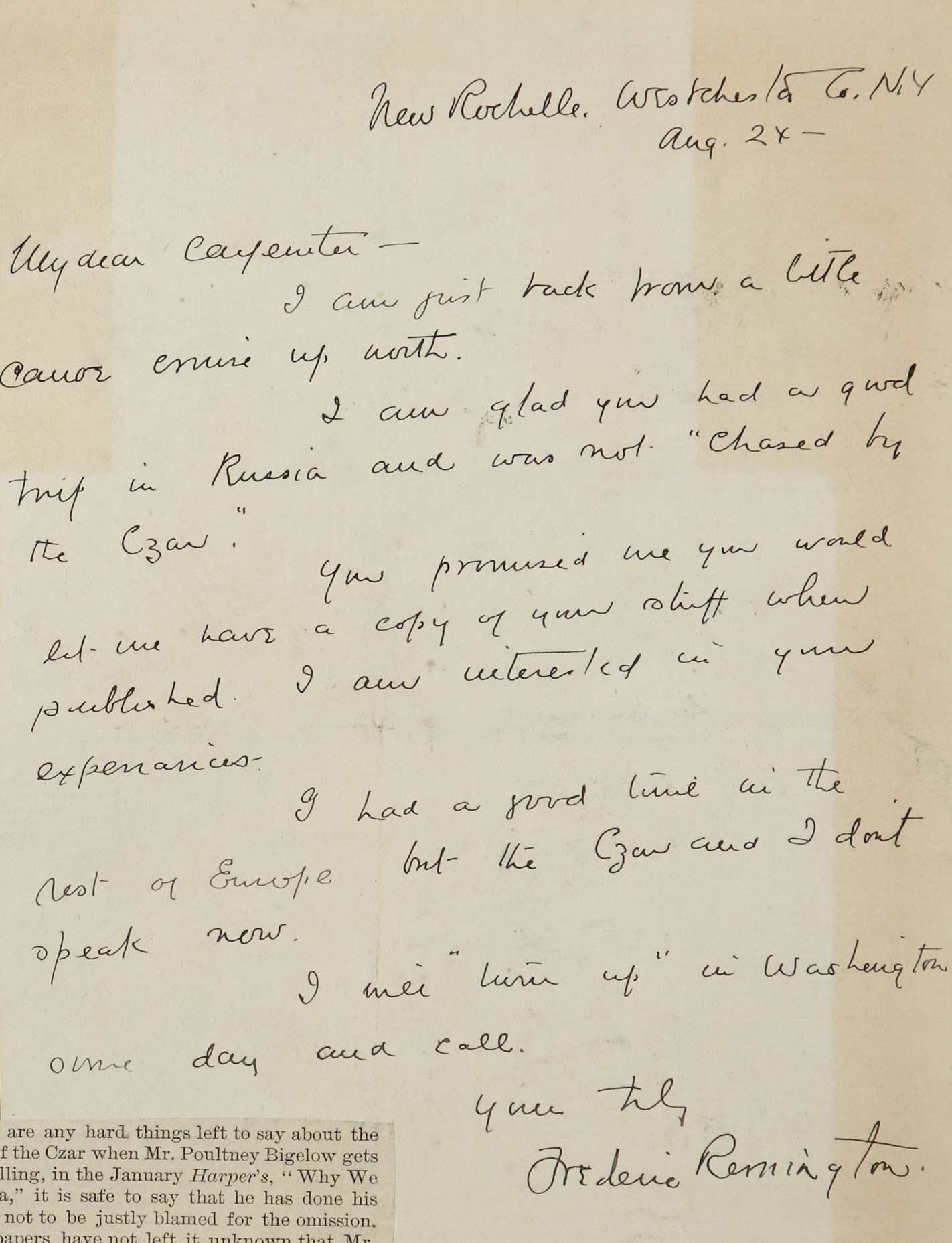 Frederic Remington autograph letter signed to his friend ''Carpenter'' from New Rochelle, New York dated 24 August [no year]. Charming letter reads in part, ''...I am just back from a little canoe cruise up north. I am glad you had a good trip in Russia and was not 'Chased by the Czar'...I had a good time in the rest of Europe but the Czar and I don't speak now...Yours truly, Frederic Remington.'' Single page affixed to paperboard with along with related clippings and paper. Letter also toned; overall good condition.