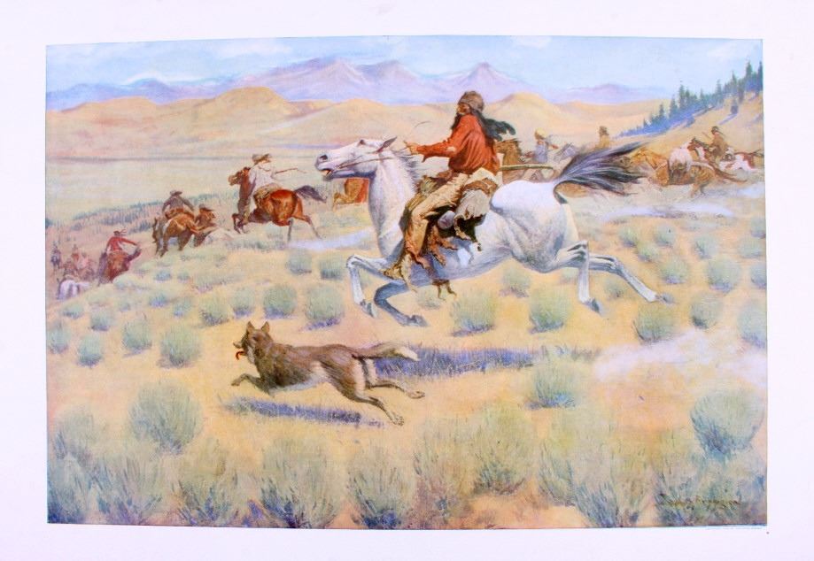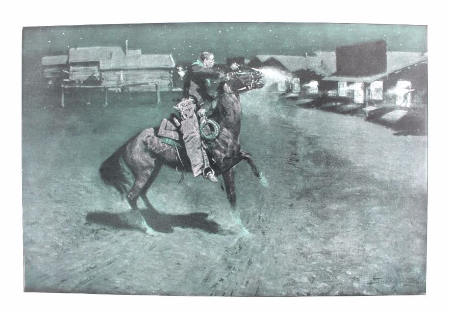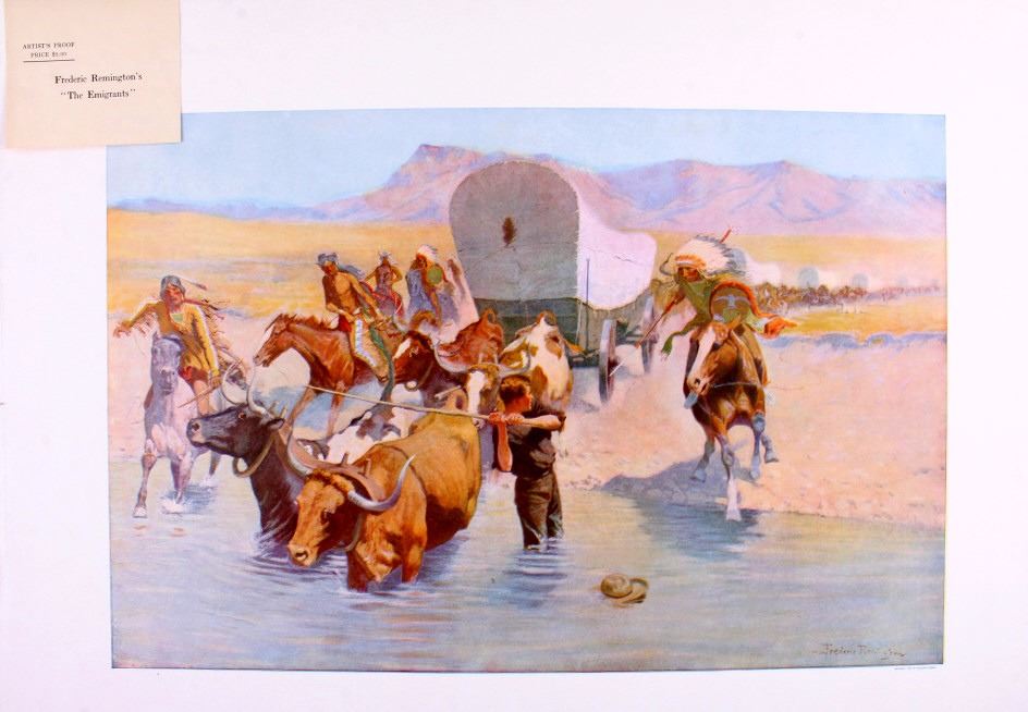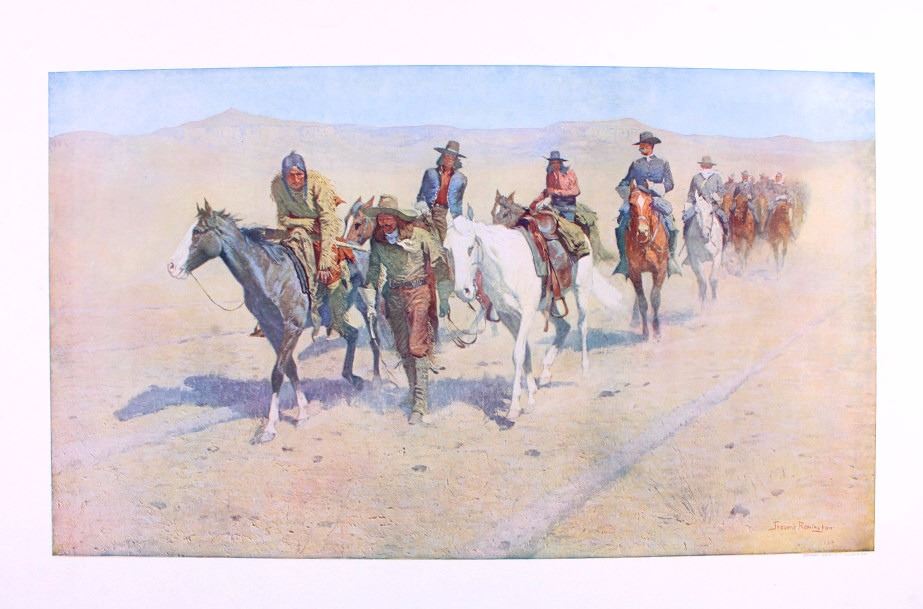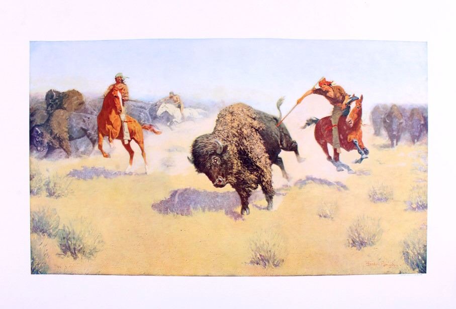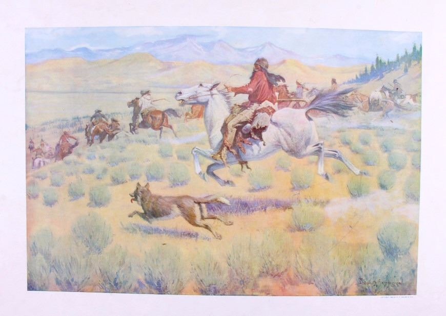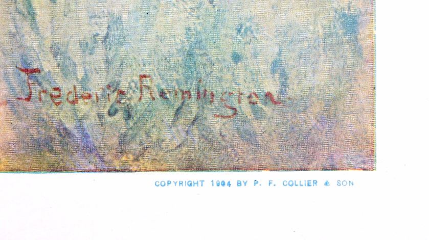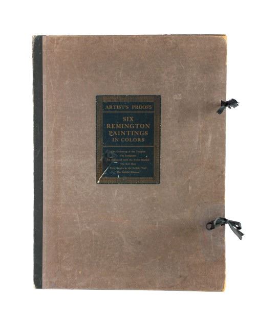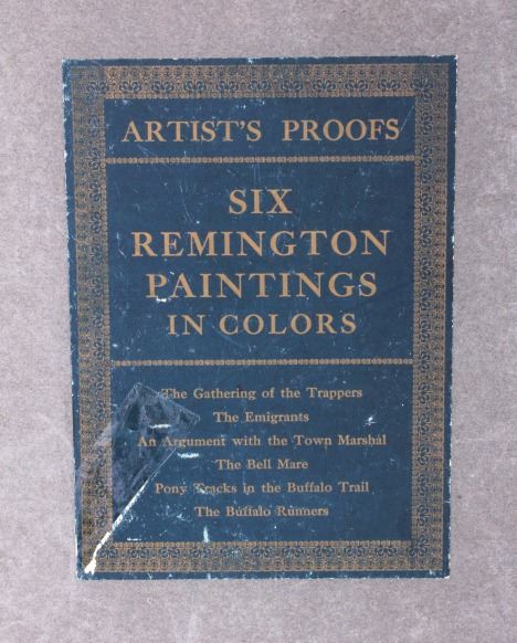 This is a RARE Frederic Remington's "Artist's Proofs; Six Remington Paintings in Colors" portfolio published in 1894. The portfolio includes six lithographs of Remington's paintings "The Gathering of the Trappers"(2), "The Emigrants", "An Argument with the Town Marshal", "Pony tracks in the Buffalo Trail" and "The Buffalo Runners". The set is missing "The Bell Mare" but contains two of the "The Gathering of the Trappers". Each of the lithographs is marked "Copyright 1894 by P.F. Collier & Son". Frederic Remington is perhaps the greatest Western artist in history. His original works of art easily command a sale price of more than $500,000. These RARE lithographs were made during Remington's lifetime and show good overall condition. Each one measures 17.75" x 23.75".