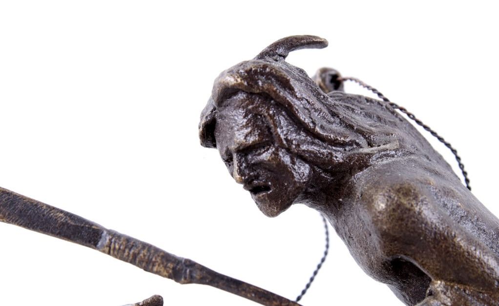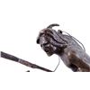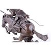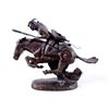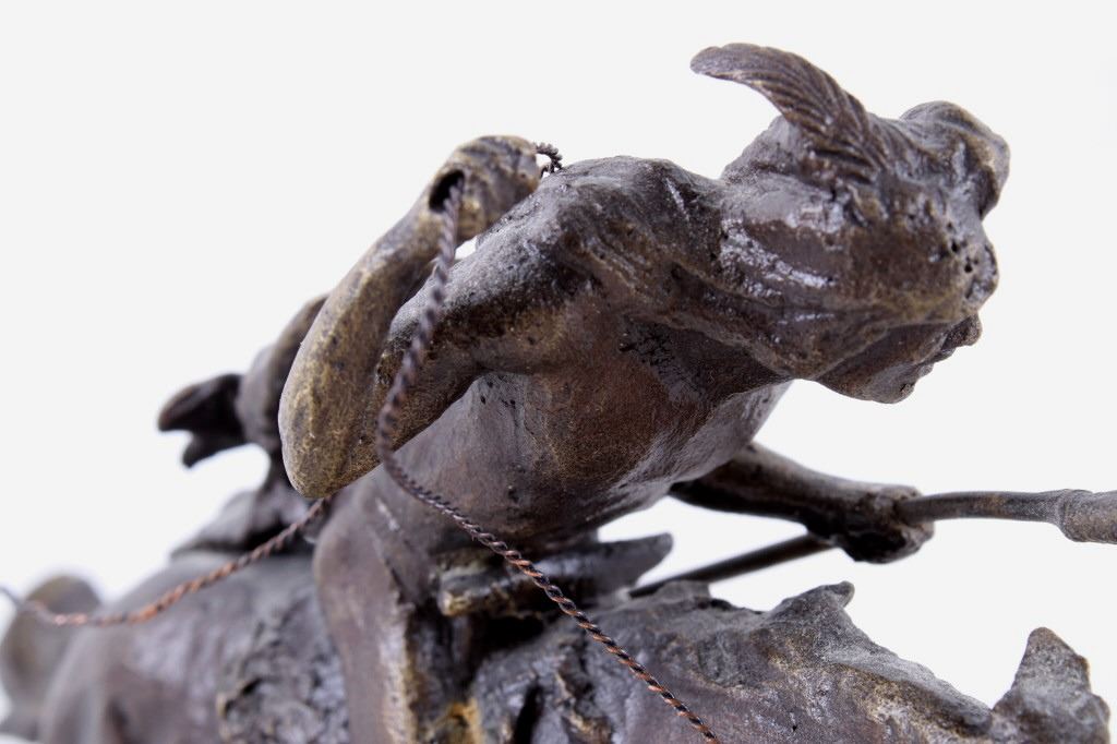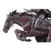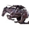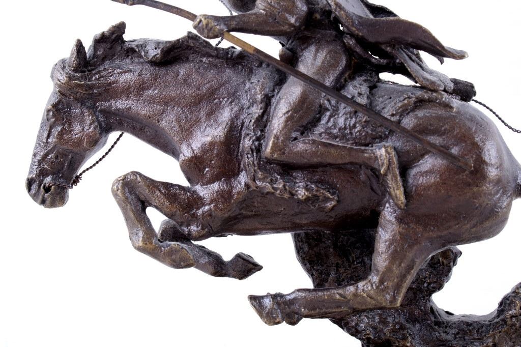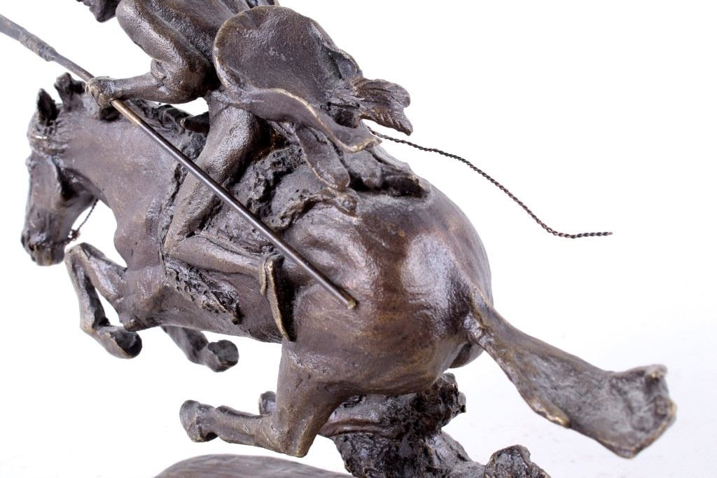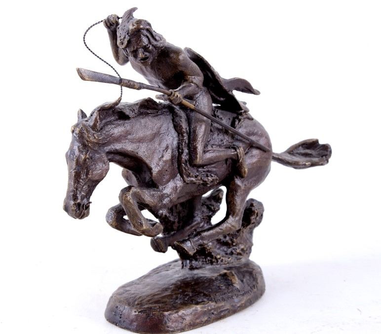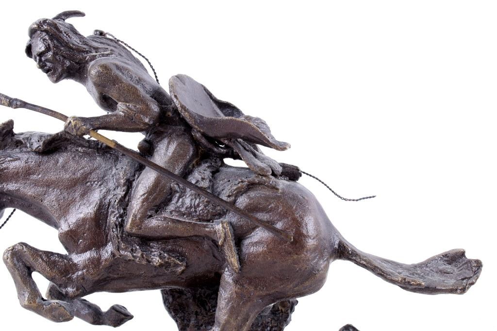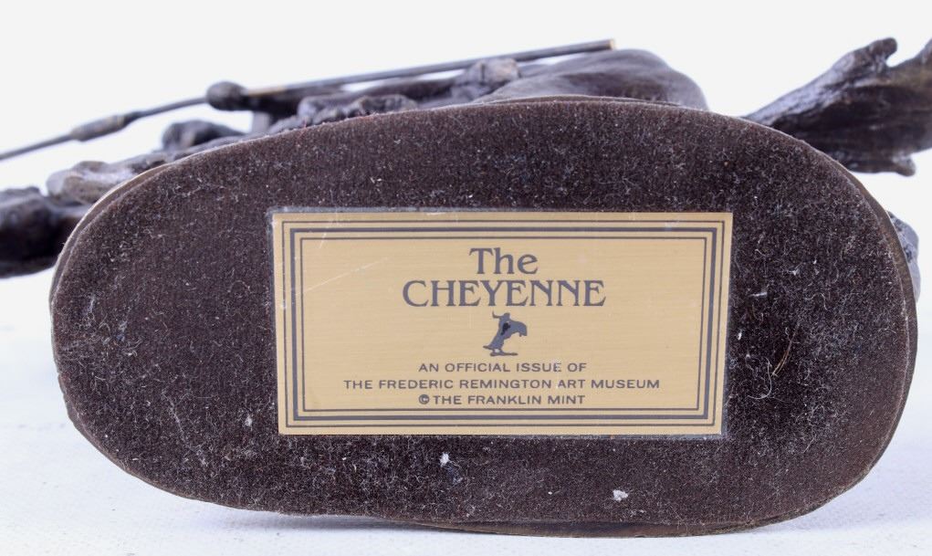 This lot features casting of a Frederic Remington Bronze called "The Cheyenne". The piece depicts a Cheyenne warrior riding in full stride atop his war horse; engraved into the base is "Copyright Frederick Remington". On the bottom of the piece is a brass plate identifying the casting as being "An official issue of the Frederick Remington Art Museum © The Franklin Mint." The sculpture is in good condition. The piece measures 5 3/4"" H x 7" L x 2 1/8" W