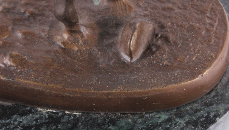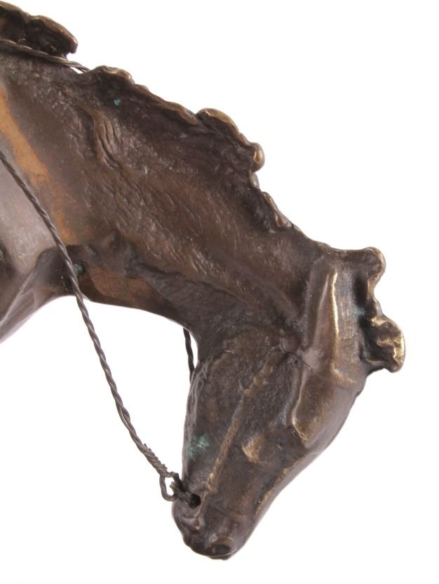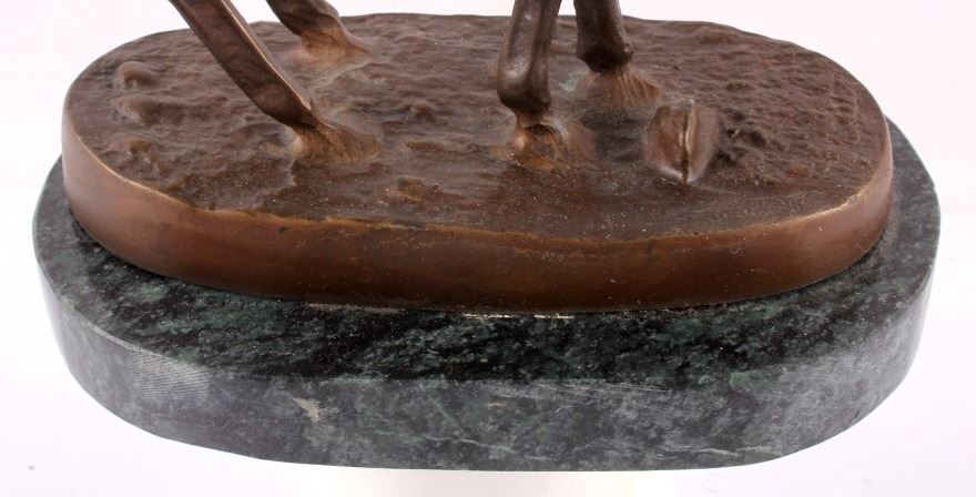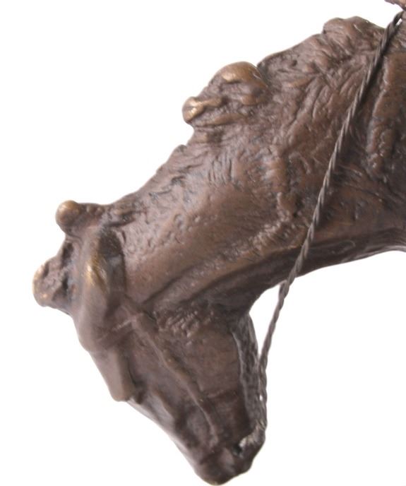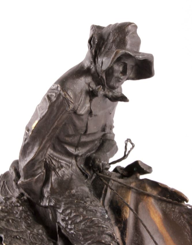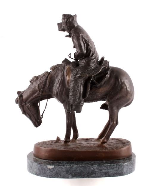 This is a Frederic Remigton bronze sculpture. The piece is titled "Norther" and shows a cowboy and his horse facing adverse conditions as they travel along the trail. The piece is marked "Frederic Remington" and was made after his lifetime. The sculpture is in good condition. It measures 4" x 6" and is 8" tall.