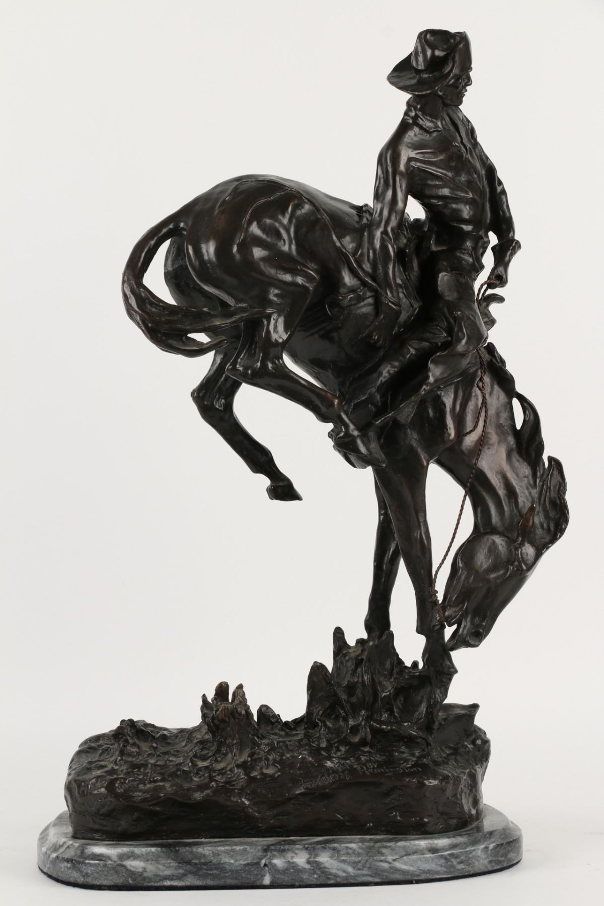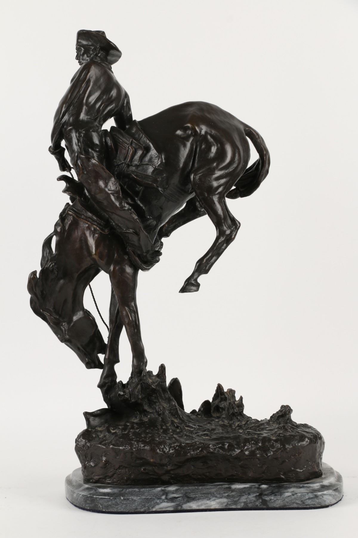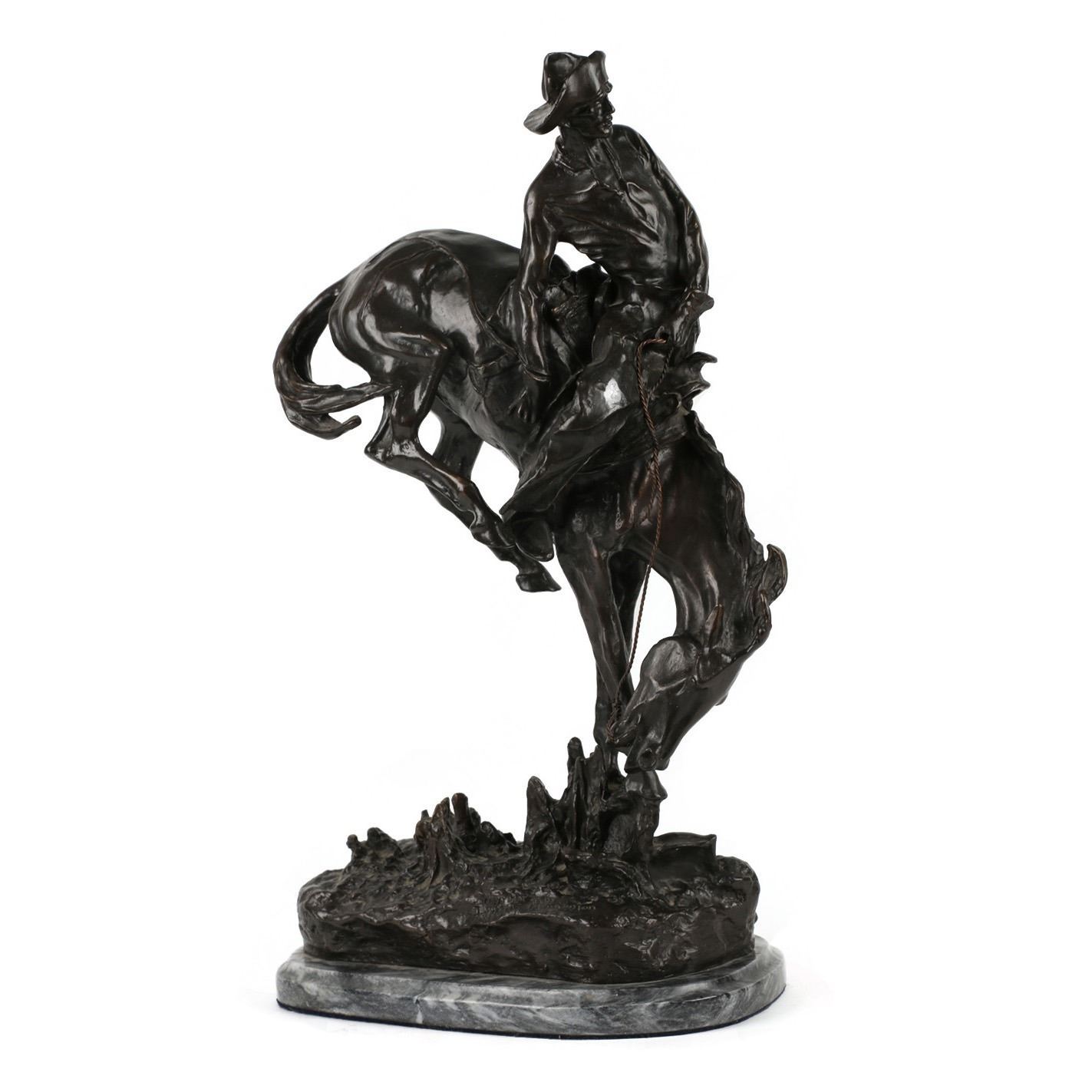Lot 172 - American. 20th century reproduction. Stands on granite plinth. Incised signature, base. Cowboy on horseback. 22.5" x 13" x 8". $1000-1200.