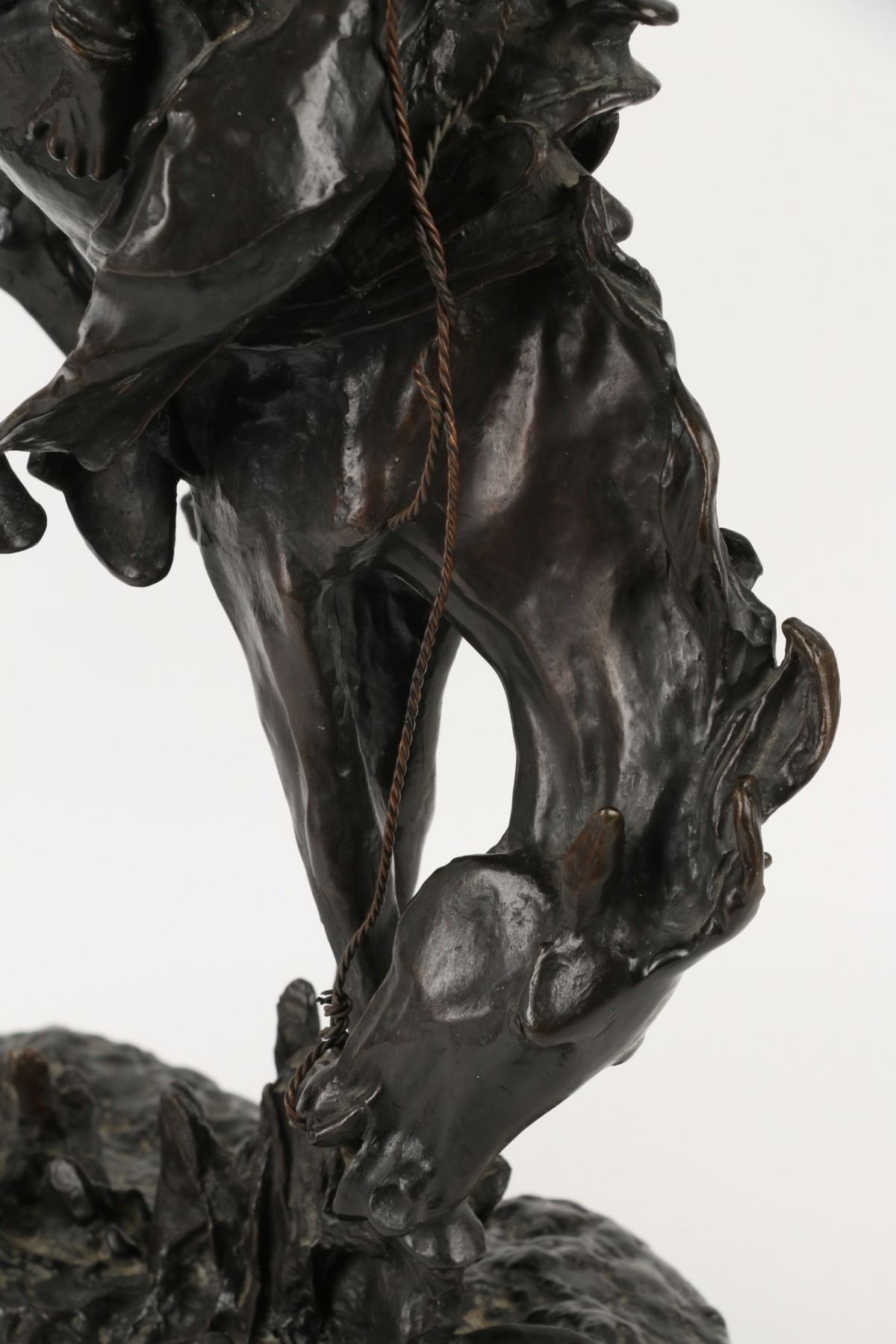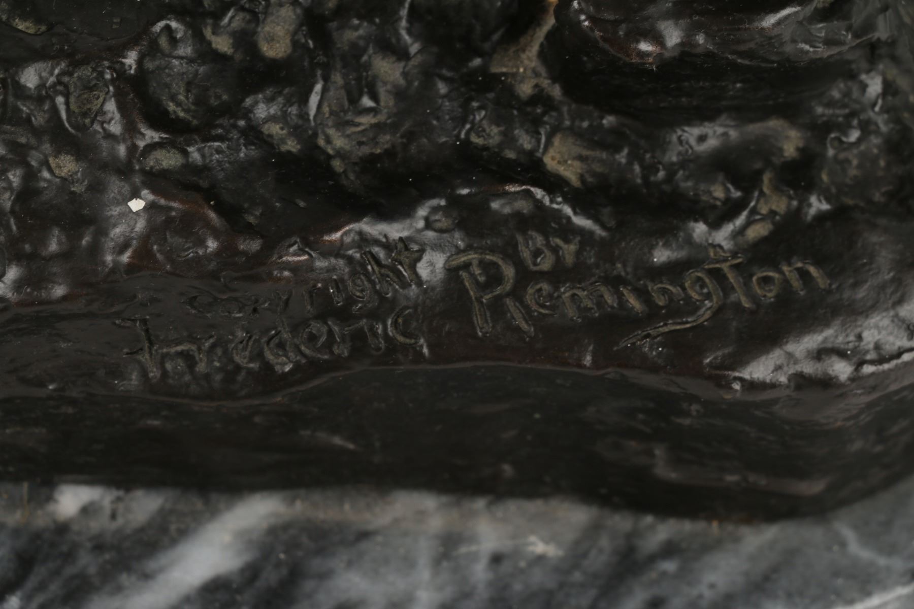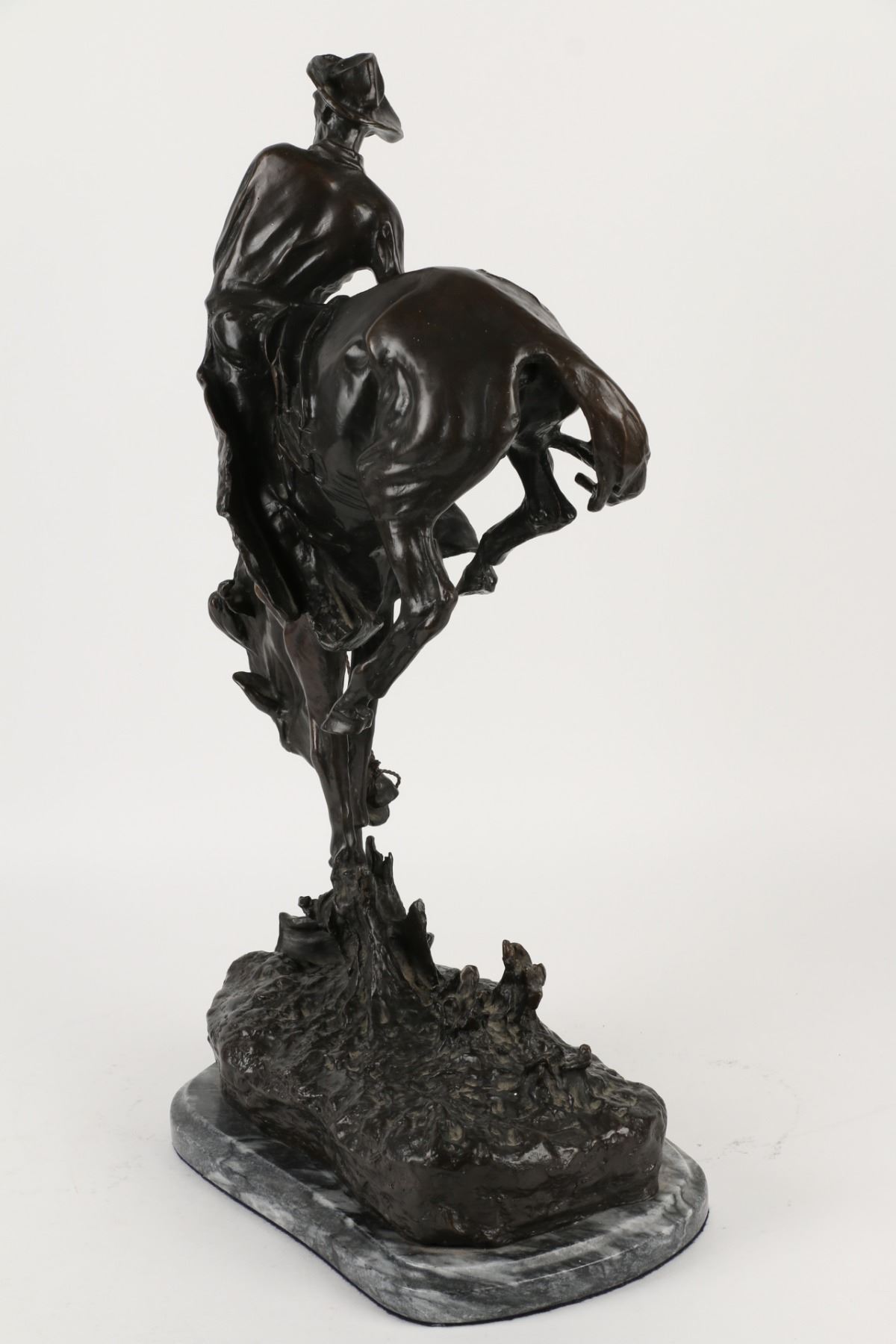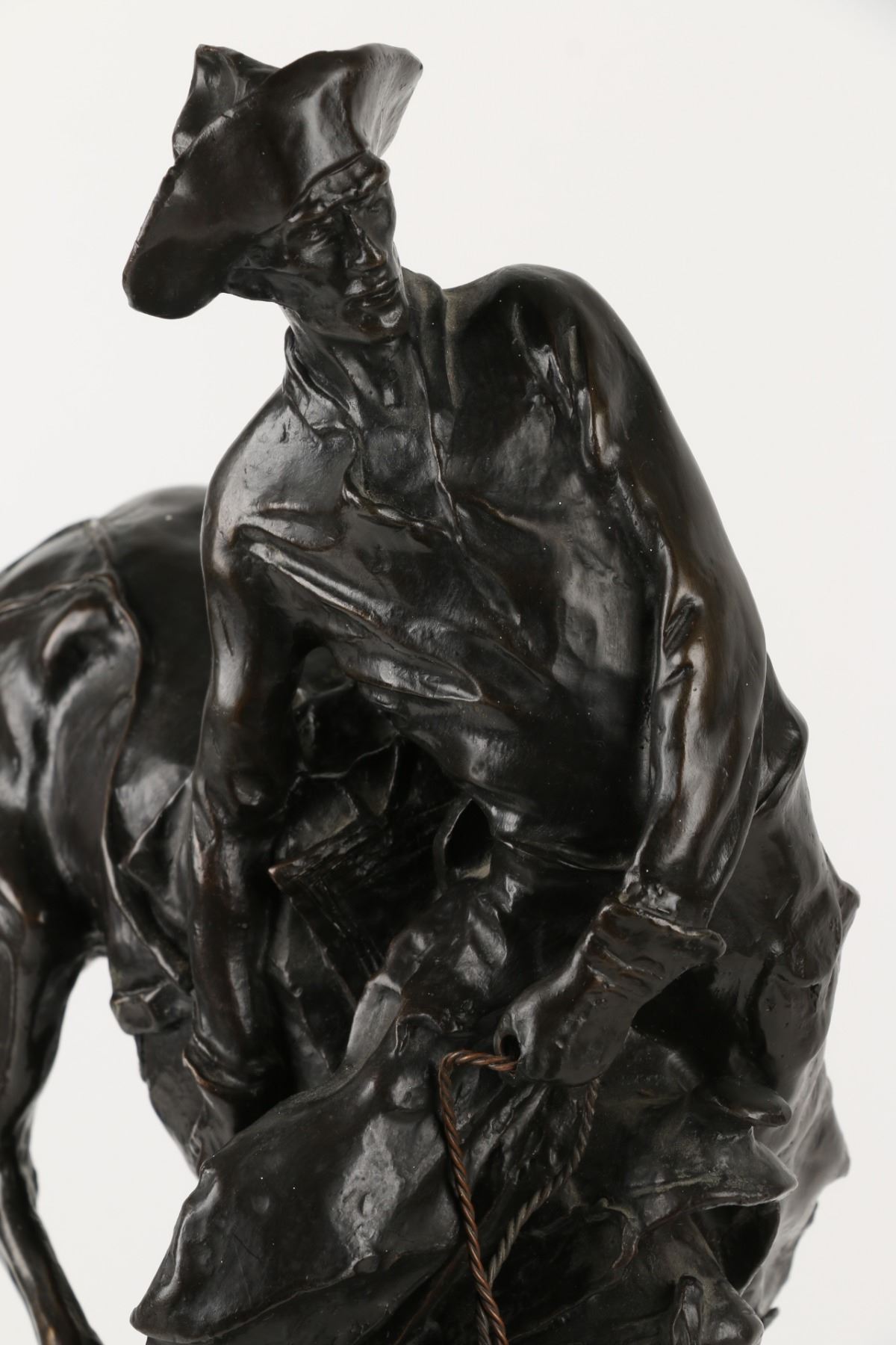 Lot 172 - American. 20th century reproduction. Stands on granite plinth. Incised signature, base. Cowboy on horseback. 22.5" x 13" x 8". $1000-1200.
