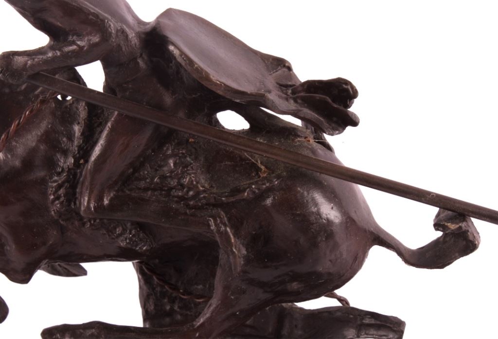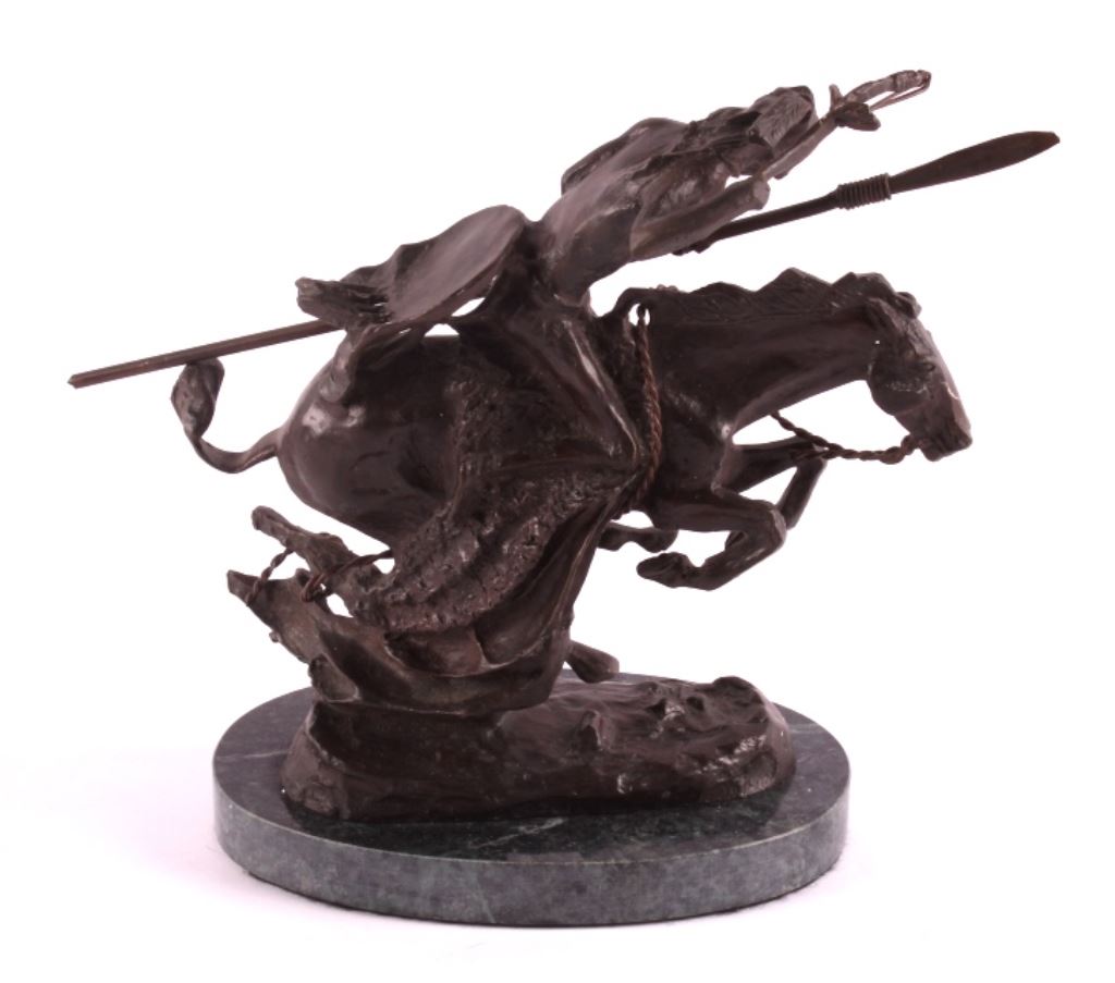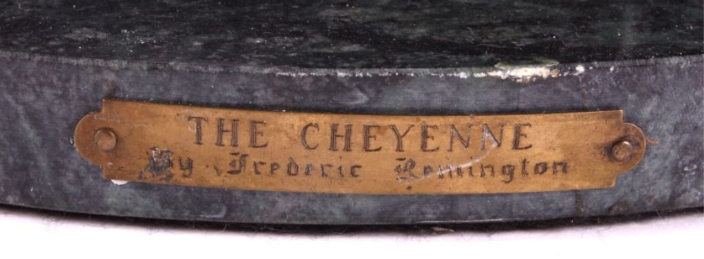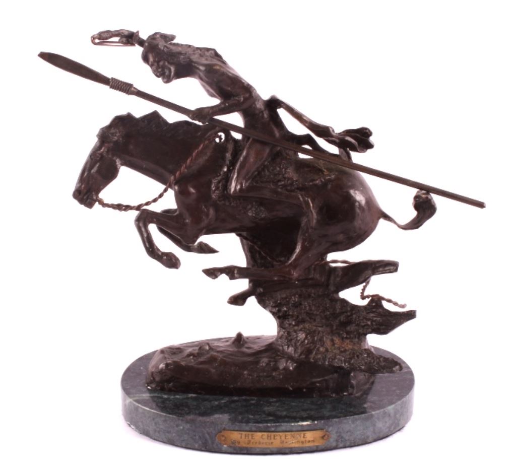 This is a Frederic Remington bronze. It is titled "The Cheyenne". This piece is cast in solid bronze. It shows a Cheyenne warrior riding in full stride atop his war horse. The bronze shows the Frederic Remington signature. The bronze sculpture is in good condition. It measures 4.5" x 10" and is 8.75" tall.