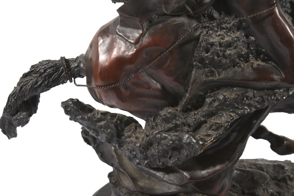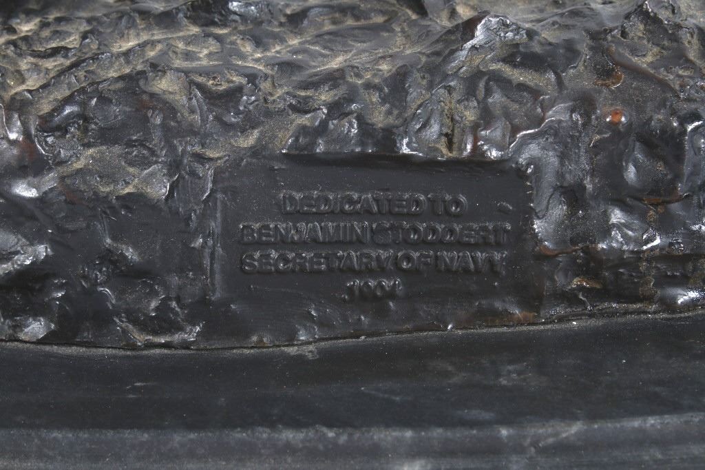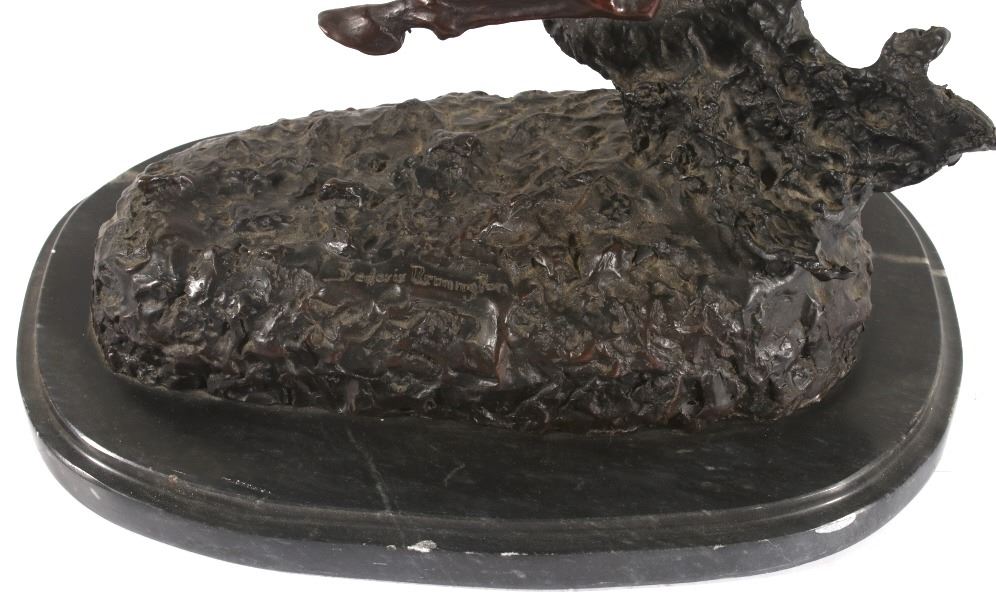 Featured in this lot we have a Frederic Remington bronze sculpture titled "Cheyenne". The sculpture depicts a Cheyenne warrior riding in full stride atop his war horse with a spear in one hand and a riding crop in the other. The piece is cast out of solid bronze and is signed across the top reading "Frederic Remington". The bronze is marked across the back reading "Dedicated to Benjamin Stoddert Secretary of Navy 1904". The piece shows good condition overall and is mounted on a black marble base. The sculpture measures 21 1/2" tall by 20" tall overall with the base measuring 10 1/2" wide by 16" long.