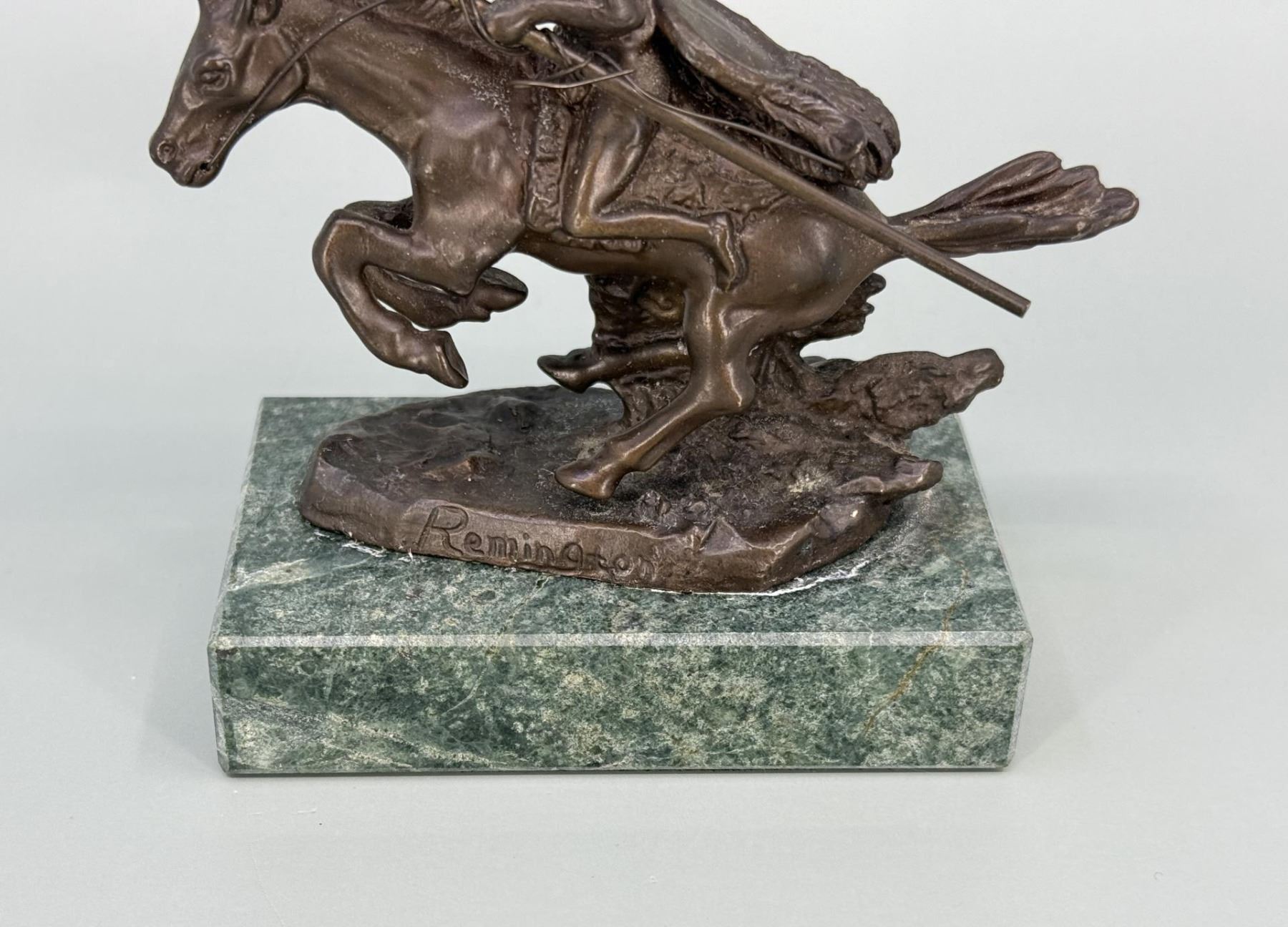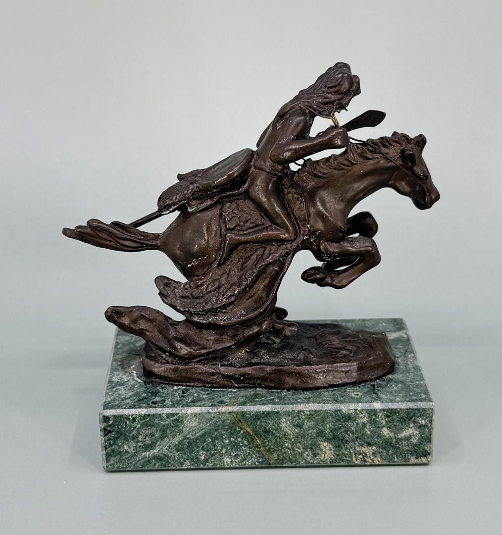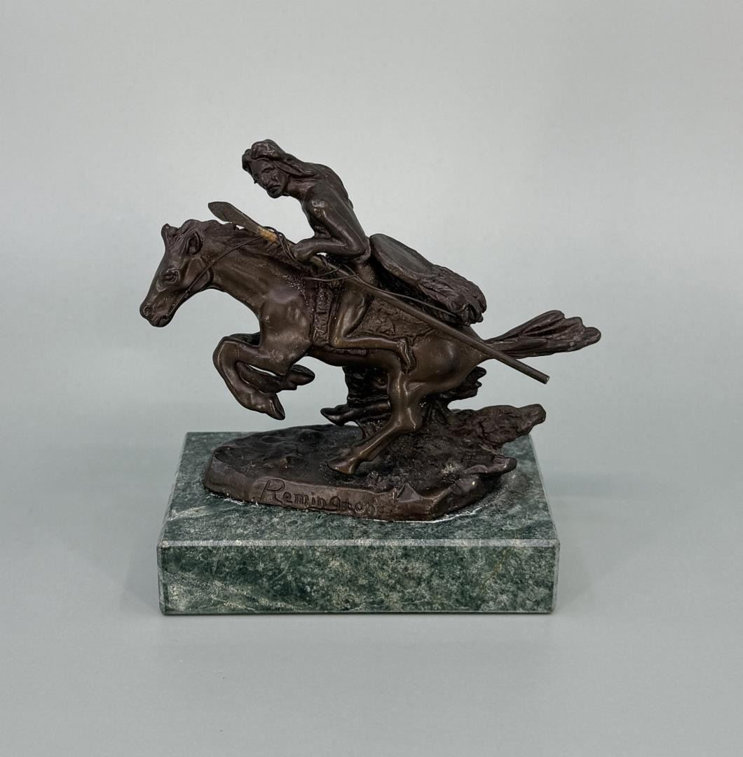 Title is Cheyenne. 4" by 3 3/4" by 2". Frederic Sackrider Remington (1861 - 1909) was active/lived in New York, Kansas, Connecticut. Frederic Remington is known for Western painting and sculpture, illustration. In his lifetime polymath Frederic Remington was the most successful and famous Western American artist. His immense talents included excelling as an illustrator, author, sculptor, and fine artist. His was a life tragically cut short. Born on October 4, 1861 in Canton, a small berg in bucolic upper state New York, he was much influenced by his father Seth Pierpont Remington, a Republican journalist who founded the St. Lawrence Plaindealer. His father had been a captain in the Civil War, and in 1870 President Ulysses S. Grant appointed him United States Collector of the Port of Ogdensburg, New York. In 1876 young Frederic enrolled at Highland Military Academy in Worcester, Massachusetts where he studied for the next two years. Two years later he enrolled at Yale for one year to study in the School of Fine Arts. His two loves were art and football. Only three months into school, he published his first illustration in the on-campus newspaper Yale Courant. On the gridiron he was a natural, demonstrating great strength and agility. Like Theodore Roosevelt, Remington also enjoyed boxing. A year later he met his future wife Eva Caten from Gloversville, New York. After the death of Remington’s father from tuberculosis on February 18, 1879, Eva rejected his first marriage proposal. Floundering, Remington headed to the American West to find himself—much like Theodore Roosevelt did when his mother and wife died on the same day. That led to a trip to Montana where he completed a number of sketches. Invigorated by his Western experiences, in February 1883 he headed to Kansas and with part of his inheritance bought a 160 acre sheep ranch near Peabody, Kansas. That failed adventure lasted about a year, and he then relocated to Kansas City, Missouri where Eva would join him as his wife. Yet he squandered the rest of his inheritance on a saloon there. After more illustrations were sold to Harper’s Weekly, in 1885 the Remingtons moved to New York City, and in 1886 he attended the Art Students League. By then Remington was earning $1,200 a year, twice the income of a school teacher. Other magazines such as St. Nicholas and Outing also published his art. His work certainly impressed a young Theodore Roosevelt who was chronicling his life in Medora—now in North Dakota—for a serial that ran in The Century Magazine. It was very common at the time for authors to serialize their works in magazines before they were published in book form. In the fall of 1887 Remington was commissioned to illustrate the magazine stories which ended up in Roosevelt’s 1888 classic book Ranch Life and the Hunting Trail. Early on, a lasting friendship between the two was cemented through these publications. By 1889 he had garnered national notoriety as one of the most accomplished illustrators in the country. He was a national celebrity. In 1889 his monumental canvas A Dash for the Timber was exhibited at the National Academy of Design. The New York Times reported, "The picture at the Autumn exhibition of the Academy of Design before which stands the largest number of people is Frederic Remington’s Dash for the Timber." A Silver medal for Last Lull in the Fight followed at the Exposition Universelle in Paris. In 1891 the National Academy of Design elected Remington as an Associate member. Yet he was never admitted as National Academician, despite support from fellow artists Gilbert Gaul, Childe Hassam, and others. His financial success allowed the Remingtons to move into a grand home he named Ednion Algonquin for "a place where I live in New Rochelle, New York. A young Norman Rockwell would someday paint in his studio. Through his travels, Remington embraced social Darwinism survival of the fittest that championed the U.S. military’s domination of the inferior Native Americans. Theodore Roosevelt, George Armstrong Custer, and Remington along with most other Americans—idolized Charles Darwin. As early as 1888 Remington started contributing short stories along with illustrations to magazines. His writings teemed with romantic Western stories chalk full of drama and violence. Initially, they presented the cavalryman as the hero and the Indian as the villain, especially when the Indian had been tainted with the vices of the white man. His West was the "frontier model where the fittest were rugged individuals from northern Europe and white Americans. Even though he was an accomplished author and painter, perhaps his greatest talent was as a sculptor. His bronzes are more famous and collectible than any other Western American artist. And yet his bronze repertoire was completed in just fourteen years. Starting in order of modeling, they are: The Broncho Buster, The Wounded Bunkie, The Wicked Pony, The Scalp, The Norther, The Cheyenne, The Buffalo Signal, Coming Through the Rye, The Mountain Man, The Sergeant, Paleolithic Man, Savage, Polo, The Rattlesnake, Dragoons 1850, The Outlaw, The Horse Thief, The Buffalo Horse, The Cowboy, Trooper of the Plains 1868, The Broncho Buster (large), and The Stampede. His Coming Through the Rye was widely viewed by the public at two world’s fairs. A New Jersey artisan in 1904 was commissioned by Remington to produce a heroic size plaster of the sculpture for the 1904 Louisiana Purchase Exposition in St. Louis, Missouri (called Off the Trail). It was then shipped to Portland, Oregon the next year for the Lewis and Clark Exposition and titled Shooting Up the Town. The Cowboy—his only monumental bronze—was commissioned in 1905 by the Fairmount Park Art Association in Philadelphia. The twelve feet high bronze was shipped to Philadelphia in May 1908 and unveiled in the park as The Mounted Cowboy. In 1900 Remington turned to Riccardo Bertelli at Roman Bronze Works in Brooklyn to cast