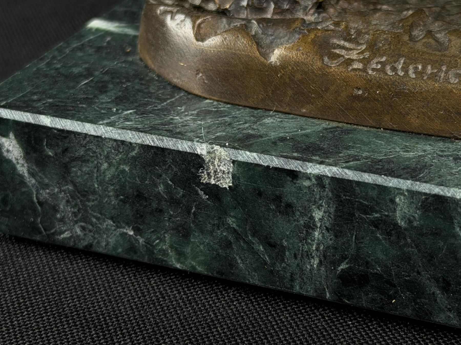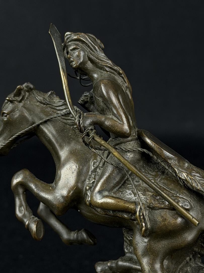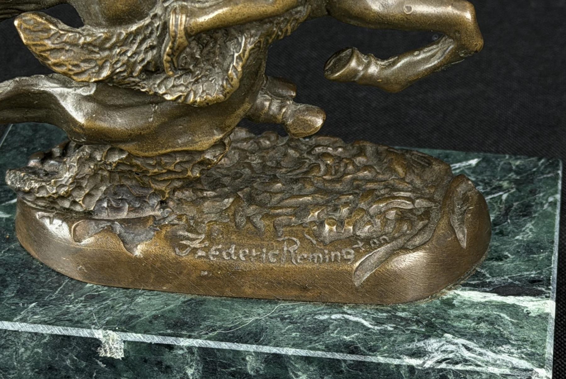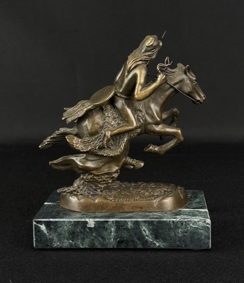 Title is Cheyenne. 5 3/8" by 4 1/2" by 2 3/4". Frederic Sackrider Remington (1861 - 1909) was active/lived in New York, Kansas, Connecticut. Frederic Remington is known for Western painting and sculpture, illustration. In his lifetime polymath Frederic Remington was the most successful and famous Western American artist. His immense talents included excelling as an illustrator, author, sculptor, and fine artist. His was a life tragically cut short. Born on October 4, 1861 in Canton, a small berg in bucolic upper state New York, he was much influenced by his father Seth Pierpont Remington, a Republican journalist who founded the St. Lawrence Plaindealer. His father had been a captain in the Civil War, and in 1870 President Ulysses S. Grant appointed him United States Collector of the Port of Ogdensburg, New York. In 1876 young Frederic enrolled at Highland Military Academy in Worcester, Massachusetts where he studied for the next two years. Two years later he enrolled at Yale for one year to study in the School of Fine Arts. His two loves were art and football. Only three months into school, he published his first illustration in the on-campus newspaper Yale Courant. On the gridiron he was a natural, demonstrating great strength and agility. Like Theodore Roosevelt, Remington also enjoyed boxing. A year later he met his future wife Eva Caten from Gloversville, New York. After the death of Remington’s father from tuberculosis on February 18, 1879, Eva rejected his first marriage proposal. Floundering, Remington headed to the American West to find himself—much like Theodore Roosevelt did when his mother and wife died on the same day. That led to a trip to Montana where he completed a number of sketches. Invigorated by his Western experiences, in February 1883 he headed to Kansas and with part of his inheritance bought a 160 acre sheep ranch near Peabody, Kansas. That failed adventure lasted about a year, and he then relocated to Kansas City, Missouri where Eva would join him as his wife. Yet he squandered the rest of his inheritance on a saloon there. After more illustrations were sold to Harper’s Weekly, in 1885 the Remingtons moved to New York City, and in 1886 he attended the Art Students League. By then Remington was earning $1,200 a year, twice the income of a school teacher. Other magazines such as St. Nicholas and Outing also published his art. His work certainly impressed a young Theodore Roosevelt who was chronicling his life in Medora—now in North Dakota—for a serial that ran in The Century Magazine. It was very common at the time for authors to serialize their works in magazines before they were published in book form. In the fall of 1887 Remington was commissioned to illustrate the magazine stories which ended up in Roosevelt’s 1888 classic book Ranch Life and the Hunting Trail. Early on, a lasting friendship between the two was cemented through these publications. By 1889 he had garnered national notoriety as one of the most accomplished illustrators in the country. He was a national celebrity. In 1889 his monumental canvas A Dash for the Timber was exhibited at the National Academy of Design. The New York Times reported, "The picture at the Autumn exhibition of the Academy of Design before which stands the largest number of people is Frederic Remington’s Dash for the Timber." A Silver medal for Last Lull in the Fight followed at the Exposition Universelle in Paris. In 1891 the National Academy of Design elected Remington as an Associate member. Yet he was never admitted as National Academician, despite support from fellow artists Gilbert Gaul, Childe Hassam, and others. His financial success allowed the Remingtons to move into a grand home he named Ednion Algonquin for "a place where I live in New Rochelle, New York. A young Norman Rockwell would someday paint in his studio. Through his travels, Remington embraced social Darwinism survival of the fittest that championed the U.S. military’s domination of the inferior Native Americans. Theodore Roosevelt, George Armstrong Custer, and Remington along with most other Americans—idolized Charles Darwin. As early as 1888 Remington started contributing short stories along with illustrations to magazines. His writings teemed with romantic Western stories chalk full of drama and violence. Initially, they presented the cavalryman as the hero and the Indian as the villain, especially when the Indian had been tainted with the vices of the white man. His West was the "frontier model where the fittest were rugged individuals from northern Europe and white Americans. Even though he was an accomplished author and painter, perhaps his greatest talent was as a sculptor. His bronzes are more famous and collectible than any other Western American artist. And yet his bronze repertoire was completed in just fourteen years. Starting in order of modeling, they are: The Broncho Buster, The Wounded Bunkie, The Wicked Pony, The Scalp, The Norther, The Cheyenne, The Buffalo Signal, Coming Through the Rye, The Mountain Man, The Sergeant, Paleolithic Man, Savage, Polo, The Rattlesnake, Dragoons 1850, The Outlaw, The Horse Thief, The Buffalo Horse, The Cowboy, Trooper of the Plains 1868, The Broncho Buster (large), and The Stampede. His Coming Through the Rye was widely viewed by the public at two world’s fairs. A New Jersey artisan in 1904 was commissioned by Remington to produce a heroic size plaster of the sculpture for the 1904 Louisiana Purchase Exposition in St. Louis, Missouri (called Off the Trail). It was then shipped to Portland, Oregon the next year for the Lewis and Clark Exposition and titled Shooting Up the Town. The Cowboy—his only monumental bronze—was commissioned in 1905 by the Fairmount Park Art Association in Philadelphia. The twelve feet high bronze was shipped to Philadelphia in May 1908 and unveiled in the park as The Mounted Cowboy. In 1900 Remington turned to Riccardo Bertelli at Roman Bronze Works in Brooklyn
