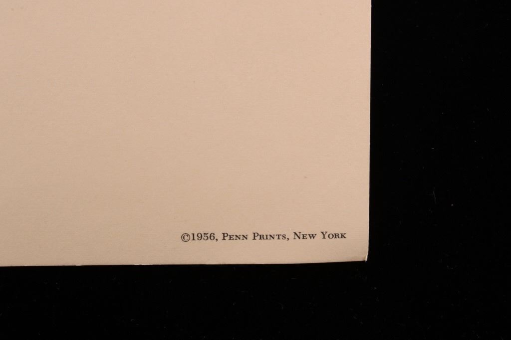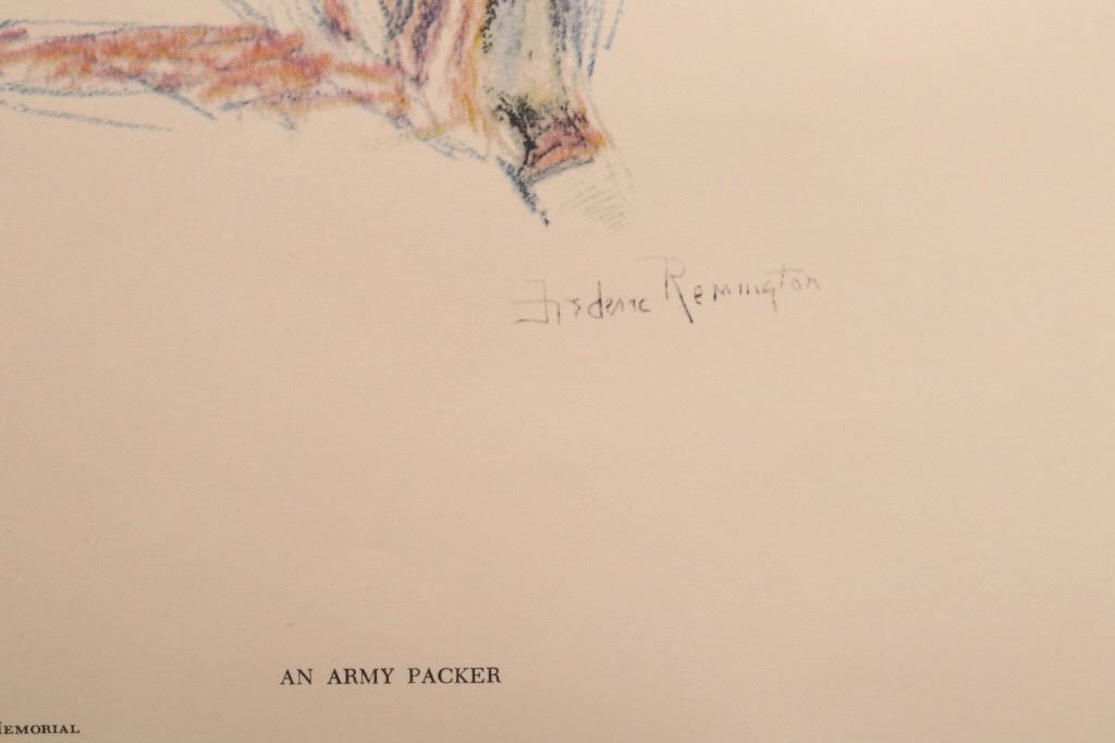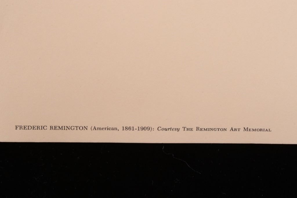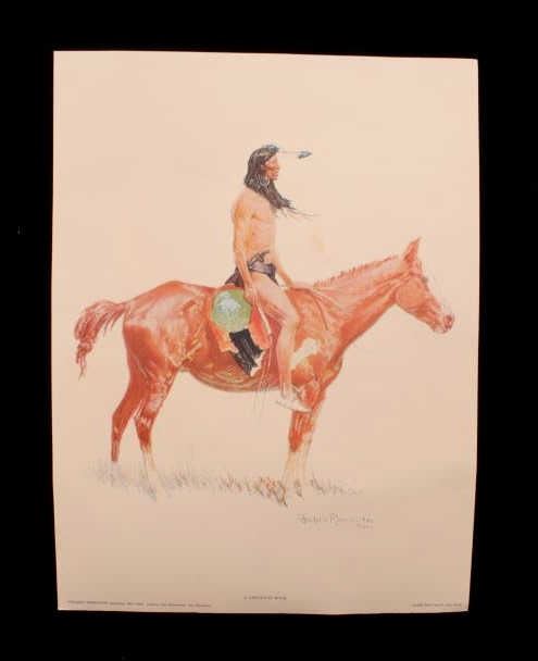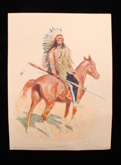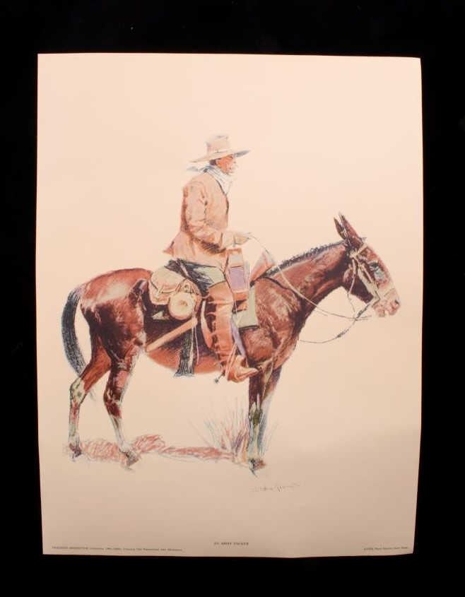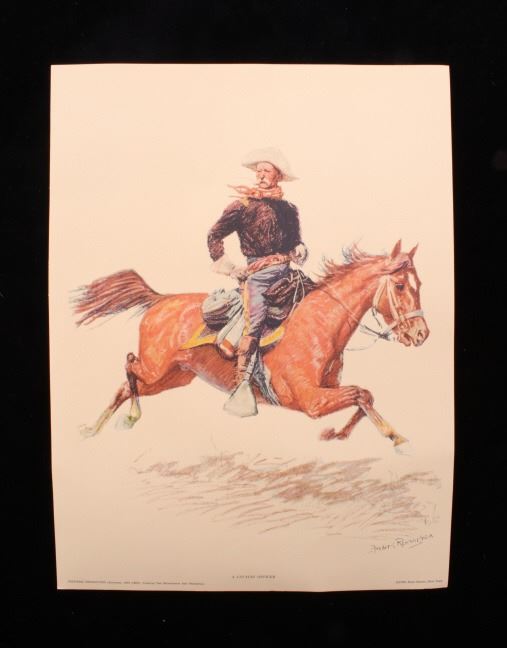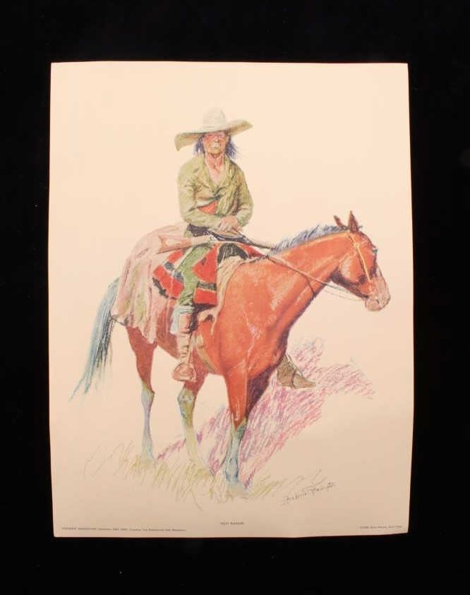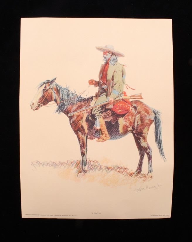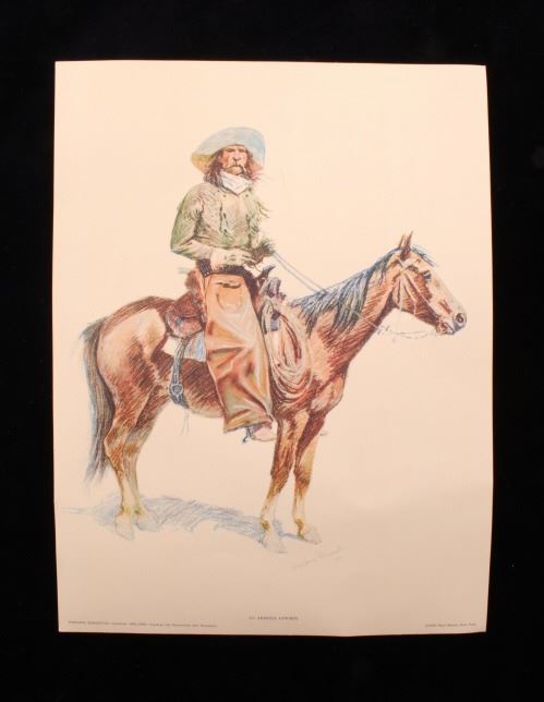 Featured in this lot is this portfolio of Frederic Remington prints titled "Buckskins". The portfolio contains eight prints. Included in this portfolio are "A Breed", “An Arizona Cowboy", "A Cavalry Officer", “An Army Packer", "A Trapper", "Old Ramon", "A Sioux Chief", and "A Cheyenne Buck". Each print is marked "1956 Penn Press". The condition of this portfolio of prints is good, with no obvious signs of damage. The measurements of this portfolio prints are 12 1/4 x 16 1/4".