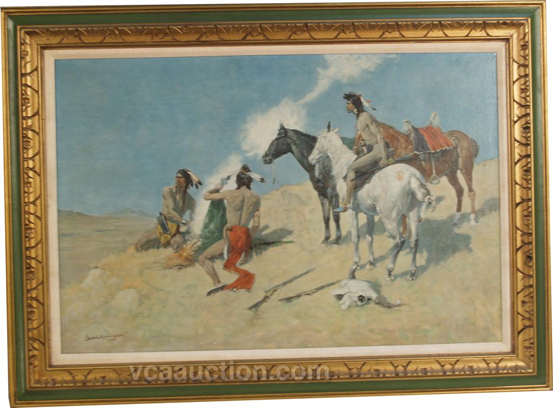 Frederic Remington Print On Canvas depicts indians on the plaines in frame - 44" x 32"
