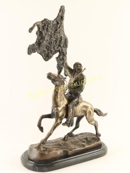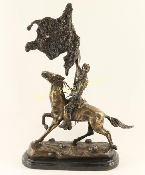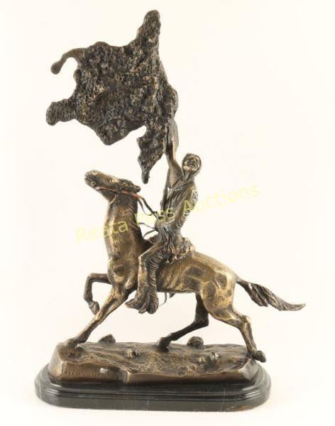 Restirke brass "Buffalo Signal" sculpture. Measures 15"x9"x4" on marble base. Some small chips, otherwise good.