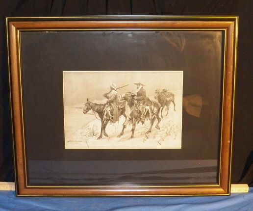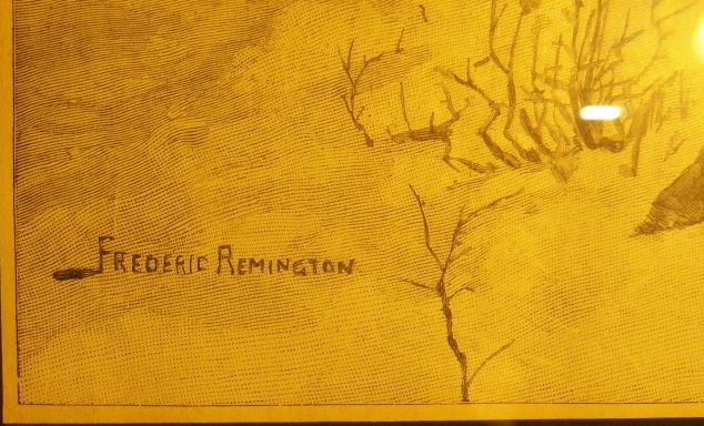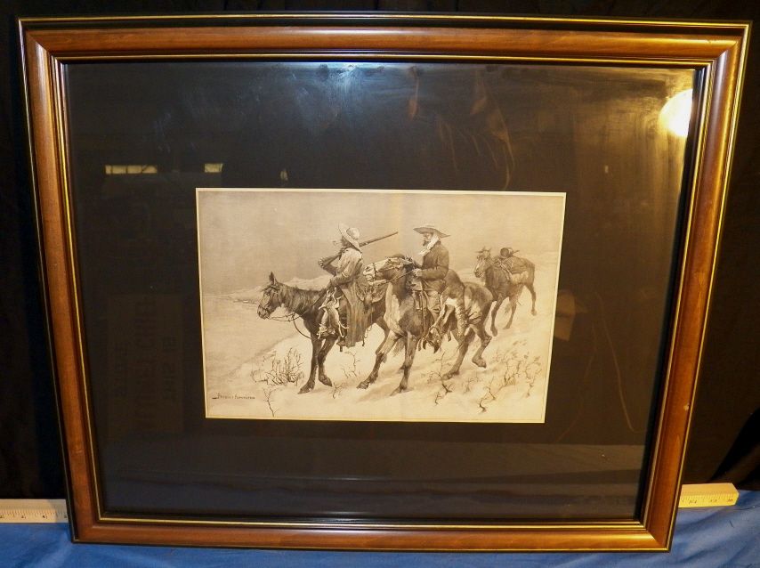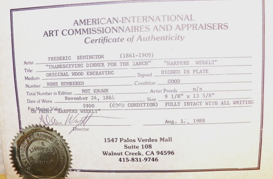 Frederic Remington (Thanksgiving Dinner for the Ranch) Original Wood Engraving Signed in Plate Date of work 1888. This is out of the Harpers Weekly