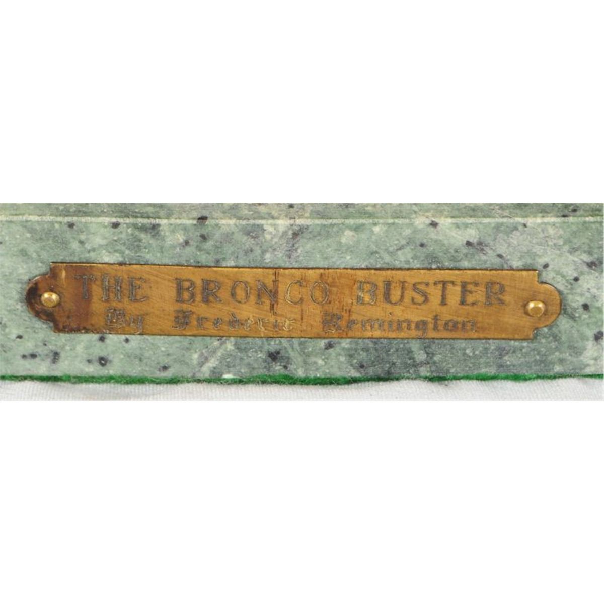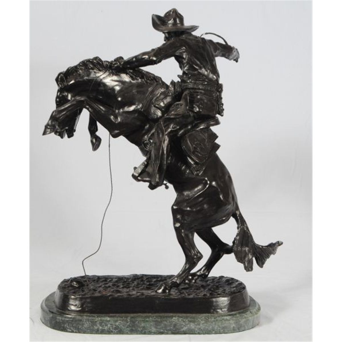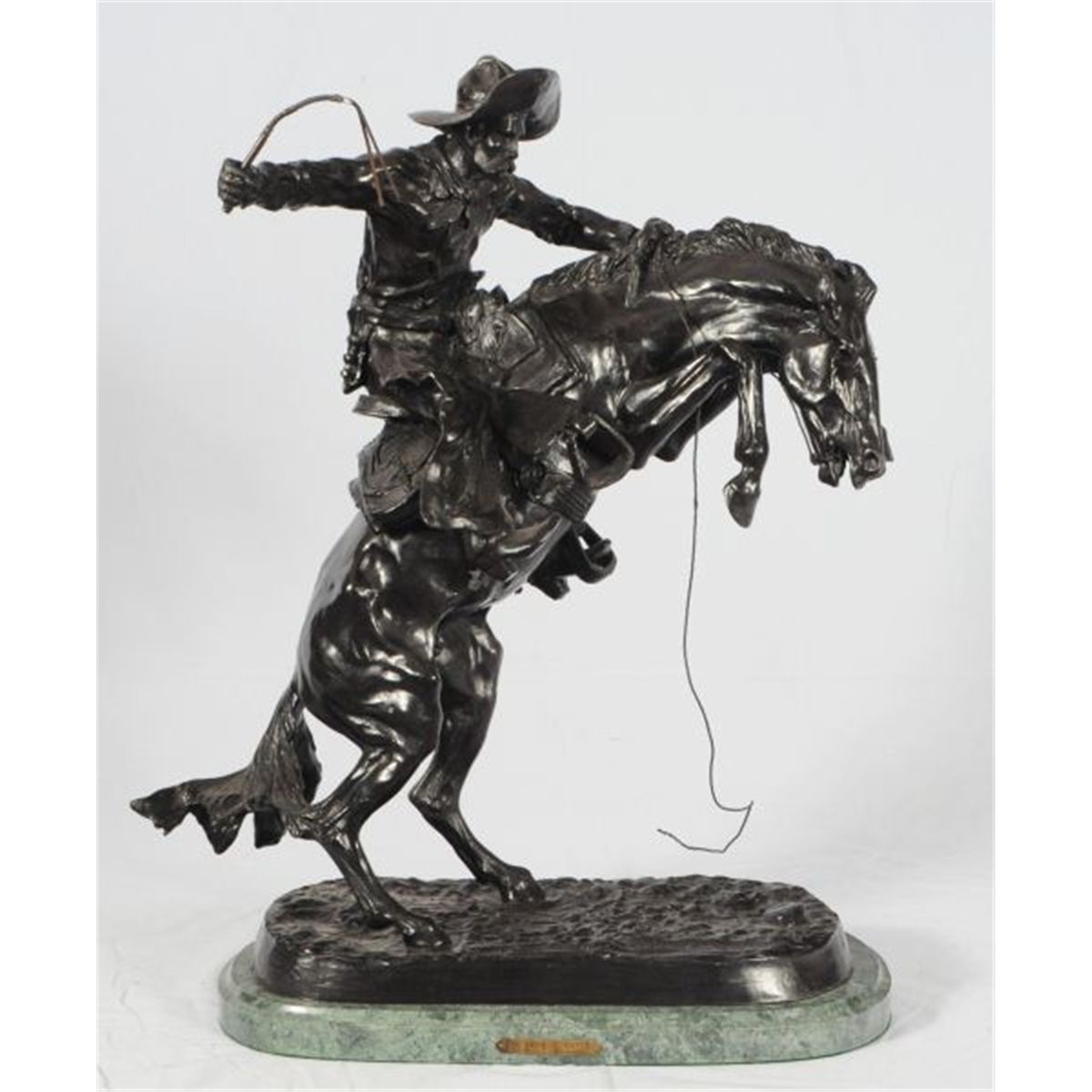 Frederic Remington "The Bronc Buster" Bronze on Marble Base. Founders Authorized Edition No. 9/100. Measures 19" long x 11" deep x 25" tall.