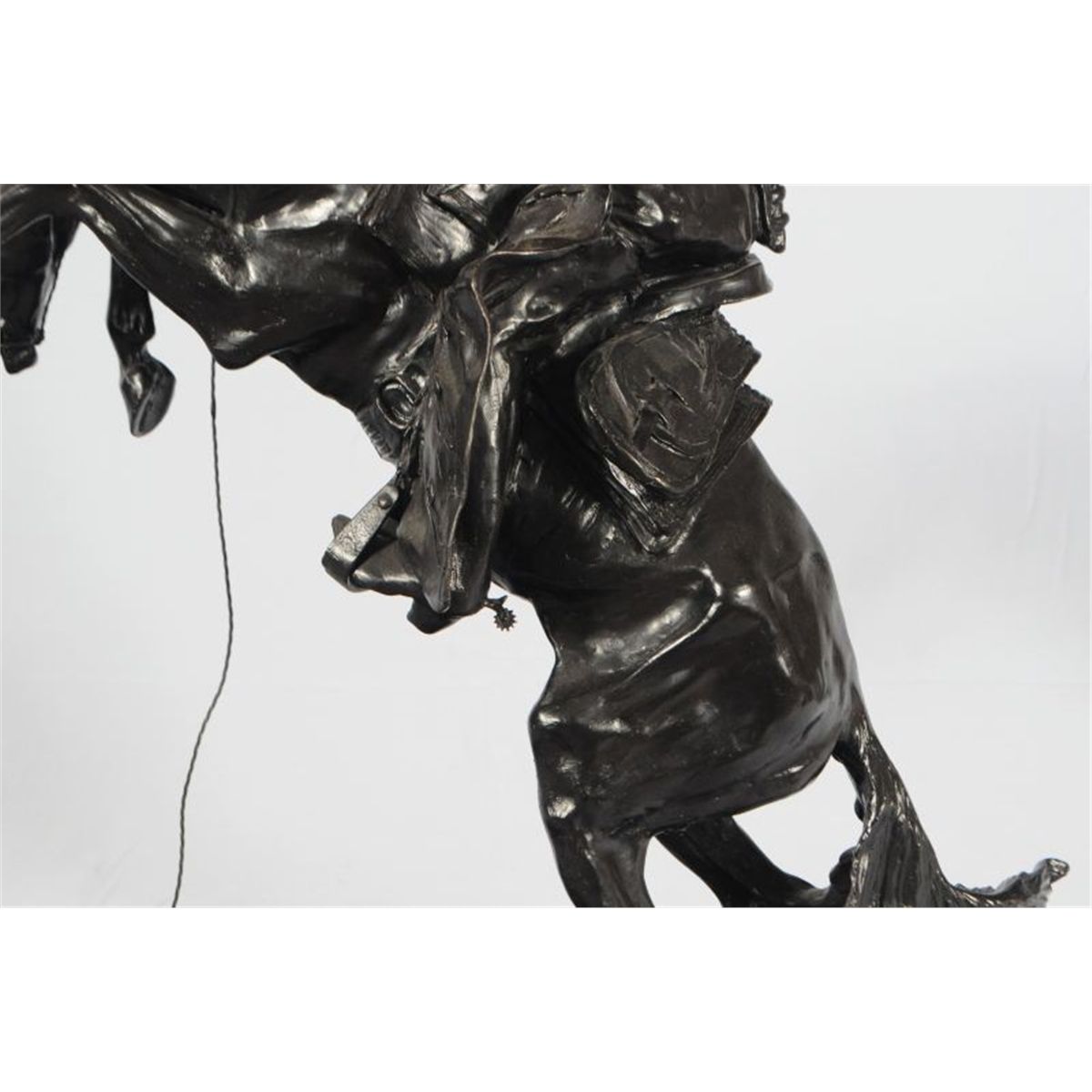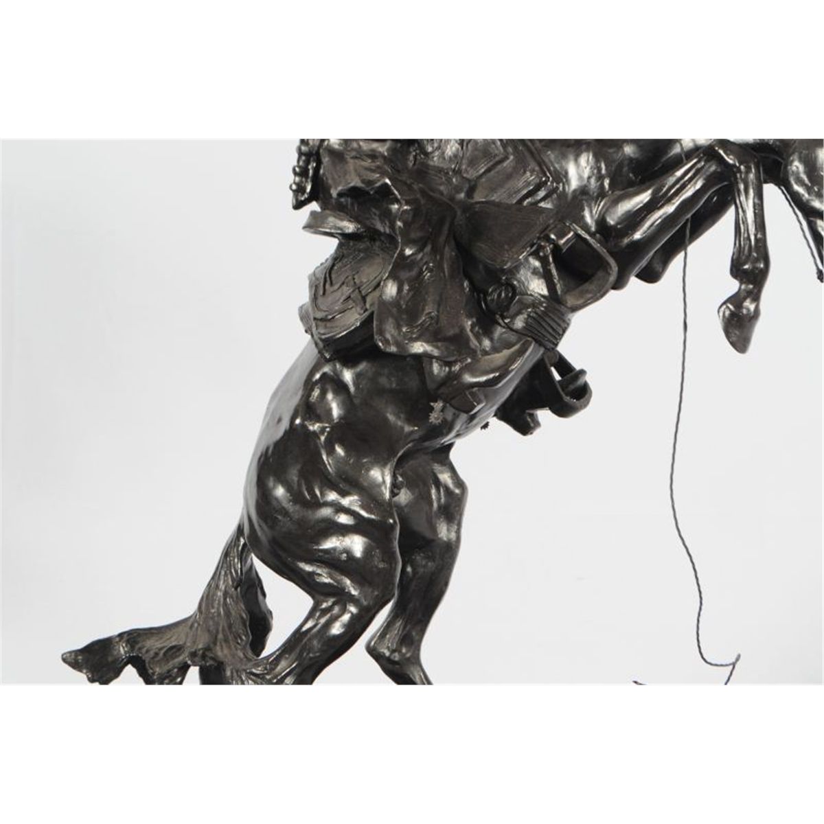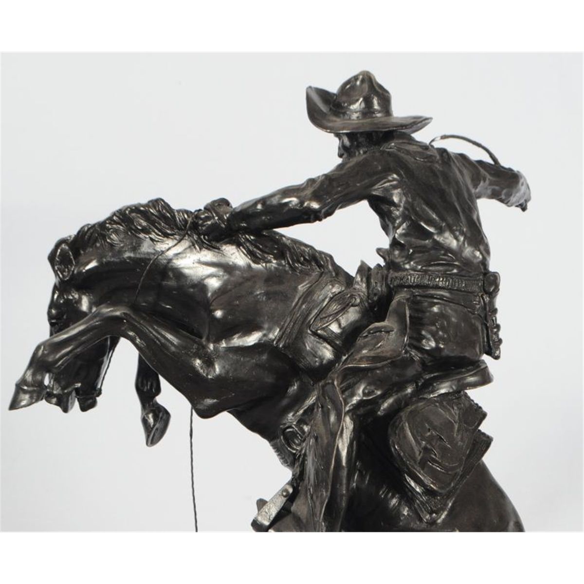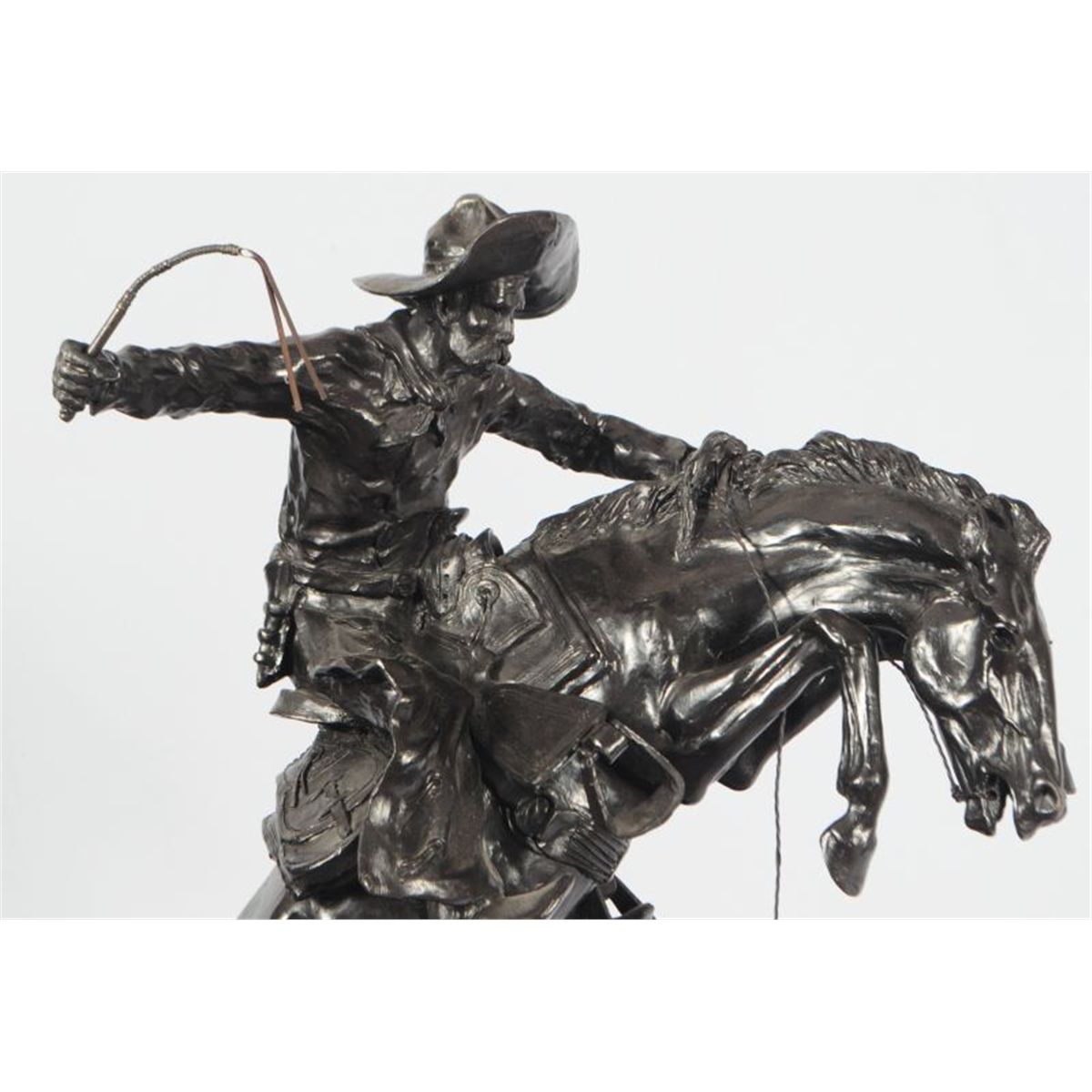 Frederic Remington "The Bronc Buster" Bronze on Marble Base. Founders Authorized Edition No. 9/100. Measures 19" long x 11" deep x 25" tall.