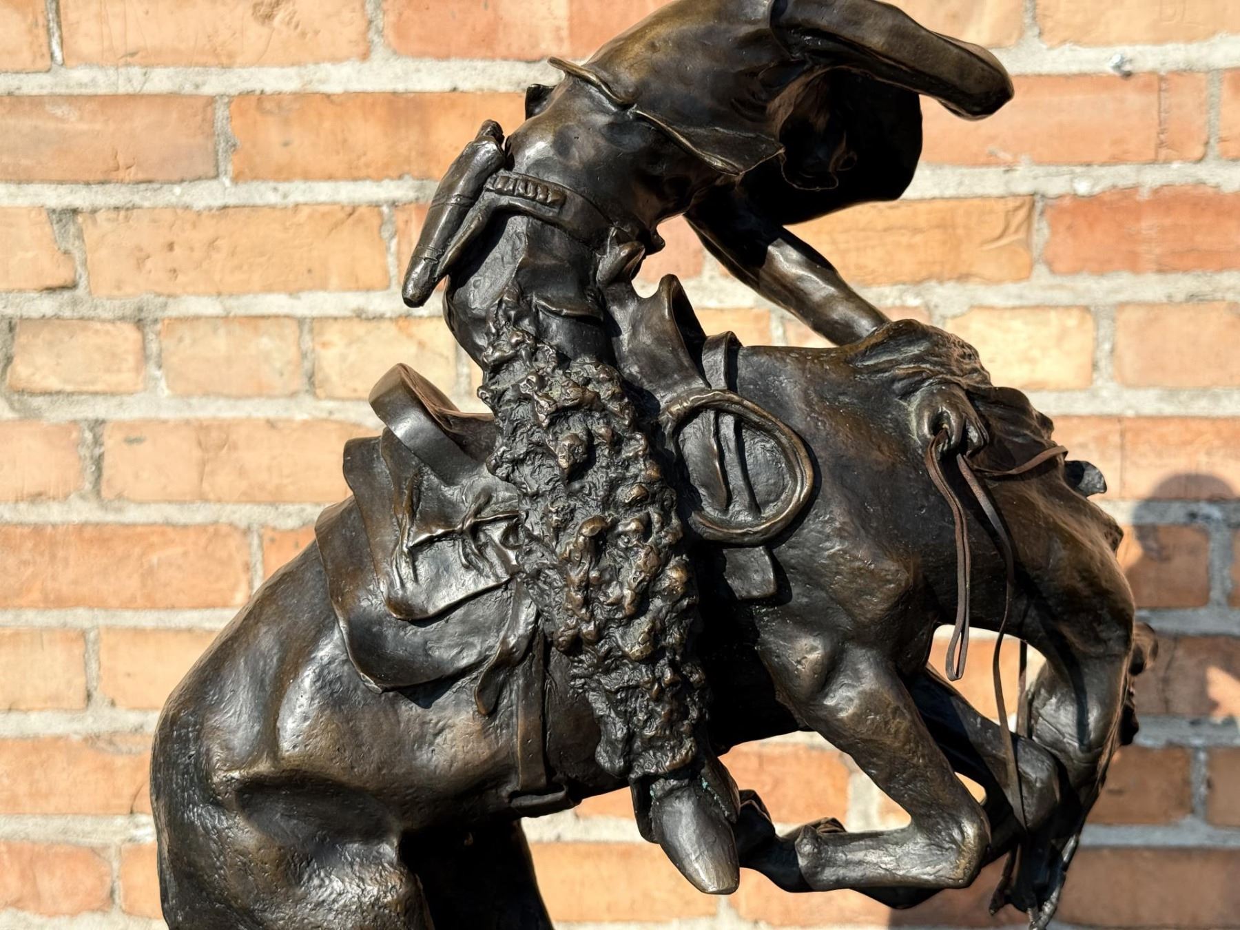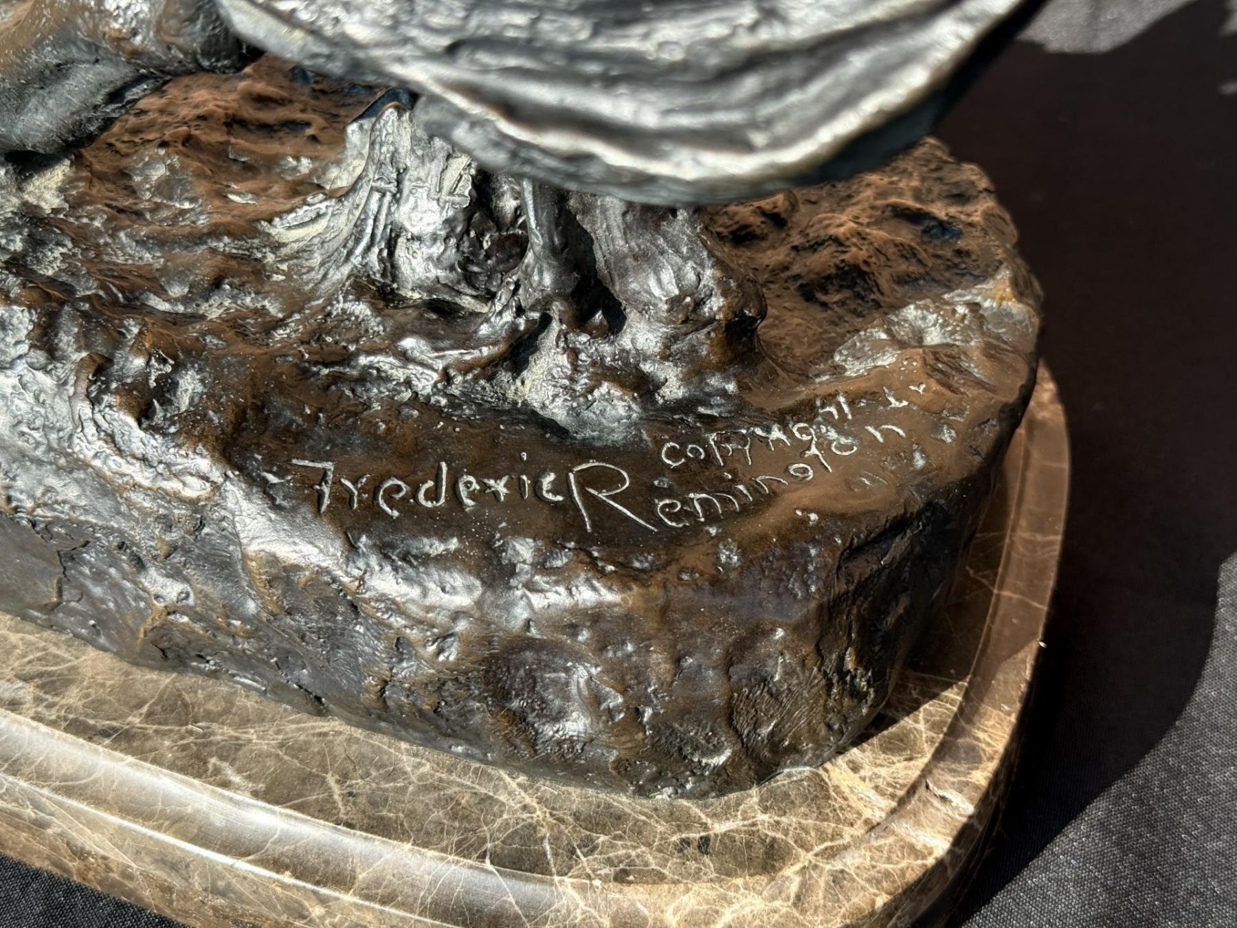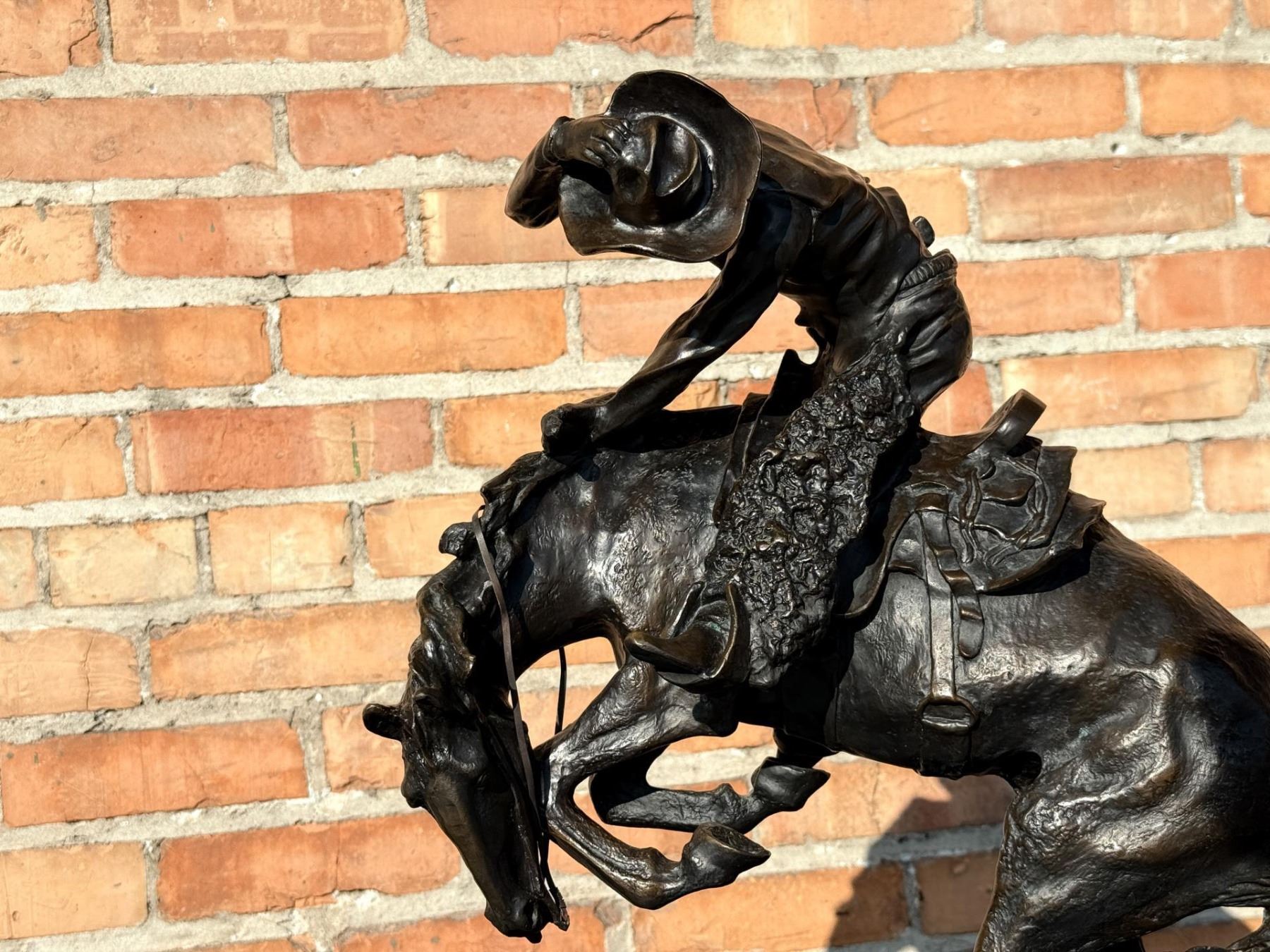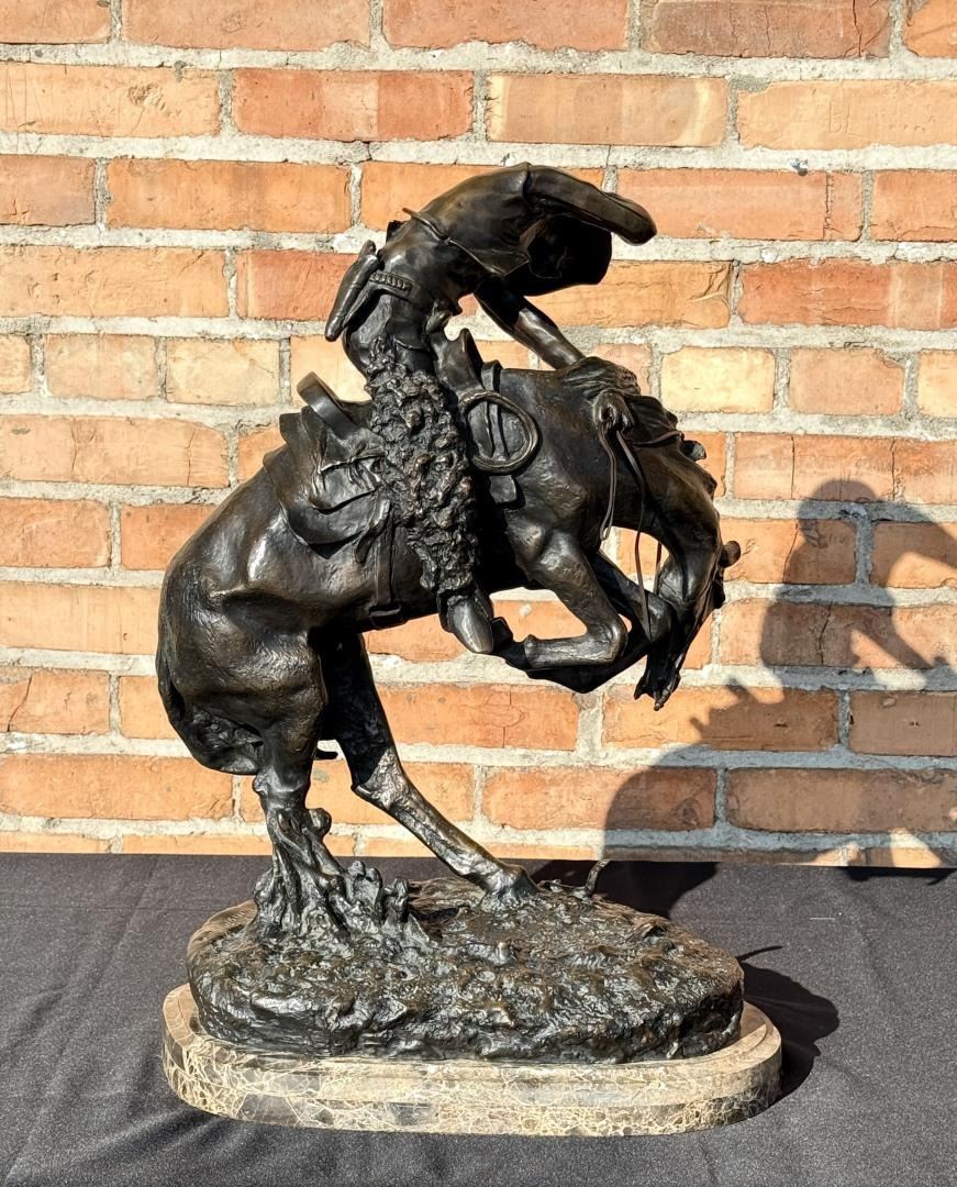 Title is The Rattlesnake. 23" tall, 16 3/4" long by 11 1/4" wide. 73 pounds. Frederic Sackrider Remington (1861 - 1909) was active/lived in New York, Kansas, Connecticut. Frederic Remington is known for Western painting and sculpture, illustration. In his lifetime polymath Frederic Remington was the most successful and famous Western American artist. His immense talents included excelling as an illustrator, author, sculptor, and fine artist. His was a life tragically cut short. Born on October 4, 1861 in Canton, a small berg in bucolic upper state New York, he was much influenced by his father Seth Pierpont Remington, a Republican journalist who founded the St. Lawrence Plaindealer. His father had been a captain in the Civil War, and in 1870 President Ulysses S. Grant appointed him United States Collector of the Port of Ogdensburg, New York. In 1876 young Frederic enrolled at Highland Military Academy in Worcester, Massachusetts where he studied for the next two years. Two years later he enrolled at Yale for one year to study in the School of Fine Arts. His two loves were art and football. Only three months into school, he published his first illustration in the on-campus newspaper Yale Courant. On the gridiron he was a natural, demonstrating great strength and agility. Like Theodore Roosevelt, Remington also enjoyed boxing. A year later he met his future wife Eva Caten from Gloversville, New York. After the death of Remington’s father from tuberculosis on February 18, 1879, Eva rejected his first marriage proposal. Floundering, Remington headed to the American West to find himself—much like Theodore Roosevelt did when his mother and wife died on the same day. That led to a trip to Montana where he completed a number of sketches. Invigorated by his Western experiences, in February 1883 he headed to Kansas and with part of his inheritance bought a 160 acre sheep ranch near Peabody, Kansas. That failed adventure lasted about a year, and he then relocated to Kansas City, Missouri where Eva would join him as his wife. Yet he squandered the rest of his inheritance on a saloon there. After more illustrations were sold to Harper’s Weekly, in 1885 the Remingtons moved to New York City, and in 1886 he attended the Art Students League. By then Remington was earning $1,200 a year, twice the income of a school teacher. Other magazines such as St. Nicholas and Outing also published his art. His work certainly impressed a young Theodore Roosevelt who was chronicling his life in Medora—now in North Dakota—for a serial that ran in The Century Magazine. It was very common at the time for authors to serialize their works in magazines before they were published in book form. In the fall of 1887 Remington was commissioned to illustrate the magazine stories which ended up in Roosevelt’s 1888 classic book Ranch Life and the Hunting Trail. Early on, a lasting friendship between the two was cemented through these publications. By 1889 he had garnered national notoriety as one of the most accomplished illustrators in the country. He was a national celebrity. In 1889 his monumental canvas A Dash for the Timber was exhibited at the National Academy of Design. The New York Times reported, "The picture at the Autumn exhibition of the Academy of Design before which stands the largest number of people is Frederic Remington’s Dash for the Timber." A Silver medal for Last Lull in the Fight followed at the Exposition Universelle in Paris. In 1891 the National Academy of Design elected Remington as an Associate member. Yet he was never admitted as National Academician, despite support from fellow artists Gilbert Gaul, Childe Hassam, and others. His financial success allowed the Remingtons to move into a grand home he named Ednion Algonquin for "a place where I live in New Rochelle, New York. A young Norman Rockwell would someday paint in his studio. Through his travels, Remington embraced social Darwinism survival of the fittest that championed the U.S. military’s domination of the inferior Native Americans. Theodore Roosevelt, George Armstrong Custer, and Remington along with most other Americans—idolized Charles Darwin. As early as 1888 Remington started contributing short stories along with illustrations to magazines. His writings teemed with romantic Western stories chalk full of drama and violence. Initially, they presented the cavalryman as the hero and the Indian as the villain, especially when the Indian had been tainted with the vices of the white man. His West was the "frontier model where the fittest were rugged individuals from northern Europe and white Americans. Even though he was an accomplished author and painter, perhaps his greatest talent was as a sculptor. His bronzes are more famous and collectible than any other Western American artist. And yet his bronze repertoire was completed in just fourteen years. Starting in order of modeling, they are: The Broncho Buster, The Wounded Bunkie, The Wicked Pony, The Scalp, The Norther, The Cheyenne, The Buffalo Signal, Coming Through the Rye, The Mountain Man, The Sergeant, Paleolithic Man, Savage, Polo, The Rattlesnake, Dragoons 1850, The Outlaw, The Horse Thief, The Buffalo Horse, The Cowboy, Trooper of the Plains 1868, The Broncho Buster (large), and The Stampede. His Coming Through the Rye was widely viewed by the public at two world’s fairs. A New Jersey artisan in 1904 was commissioned by Remington to produce a heroic size plaster of the sculpture for the 1904 Louisiana Purchase Exposition in St. Louis, Missouri (called Off the Trail). It was then shipped to Portland, Oregon the next year for the Lewis and Clark Exposition and titled Shooting Up the Town. The Cowboy—his only monumental bronze—was commissioned in 1905 by the Fairmount Park Art Association in Philadelphia. The twelve feet high bronze was shipped to Philadelphia in May 1908 and unveiled in the park as The Mounted Cowboy. In 1900 Remington turned to Riccardo Bertelli at 