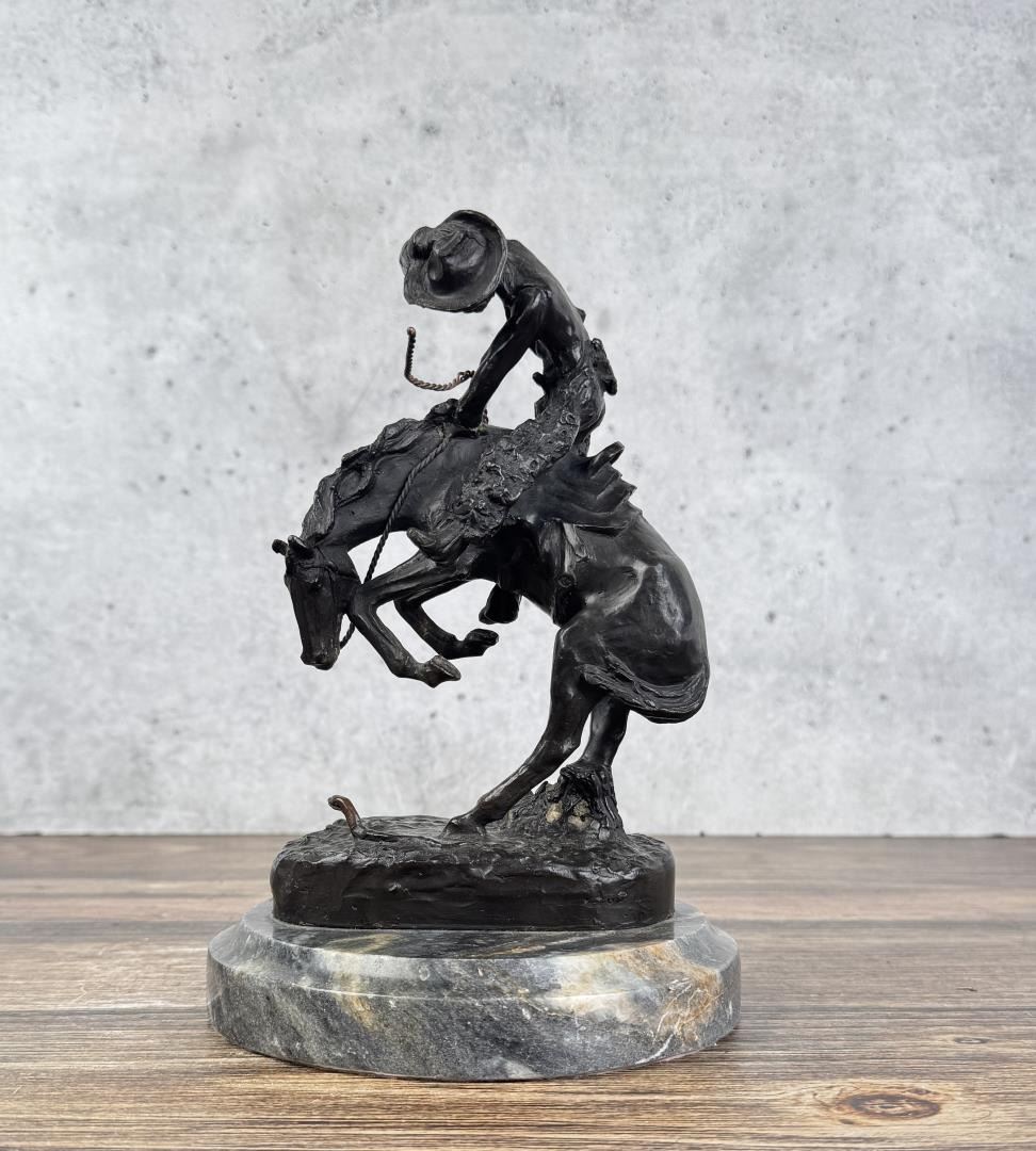Title is The Rattlesnake. 10" by 7" by 7". Frederic Sackrider Remington (1861 - 1909) was active/lived in New York, Kansas, Connecticut. Frederic Remington is known for Western painting and sculpture, illustration. In his lifetime polymath Frederic Remington was the most successful and famous Western American artist. His immense talents included excelling as an illustrator, author, sculptor, and fine artist. His was a life tragically cut short. Born on October 4, 1861 in Canton, a small berg in bucolic upper state New York, he was much influenced by his father Seth Pierpont Remington, a Republican journalist who founded the St. Lawrence Plaindealer. His father had been a captain in the Civil War, and in 1870 President Ulysses S. Grant appointed him United States Collector of the Port of Ogdensburg, New York. In 1876 young Frederic enrolled at Highland Military Academy in Worcester, Massachusetts where he studied for the next two years. Two years later he enrolled at Yale for one year to study in the School of Fine Arts. His two loves were art and football. Only three months into school, he published his first illustration in the on-campus newspaper Yale Courant. On the gridiron he was a natural, demonstrating great strength and agility. Like Theodore Roosevelt, Remington also enjoyed boxing. A year later he met his future wife Eva Caten from Gloversville, New York. After the death of Remington’s father from tuberculosis on February 18, 1879, Eva rejected his first marriage proposal. Floundering, Remington headed to the American West to find himself—much like Theodore Roosevelt did when his mother and wife died on the same day. That led to a trip to Montana where he completed a number of sketches. Invigorated by his Western experiences, in February 1883 he headed to Kansas and with part of his inheritance bought a 160 acre sheep ranch near Peabody, Kansas. That failed adventure lasted about a year, and he then relocated to Kansas City, Missouri where Eva would join him as his wife. Yet he squandered the rest of his inheritance on a saloon there. After more illustrations were sold to Harper’s Weekly, in 1885 the Remingtons moved to New York City, and in 1886 he attended the Art Students League. By then Remington was earning $1,200 a year, twice the income of a school teacher. Other magazines such as St. Nicholas and Outing also published his art. His work certainly impressed a young Theodore Roosevelt who was chronicling his life in Medora—now in North Dakota—for a serial that ran in The Century Magazine. It was very common at the time for authors to serialize their works in magazines before they were published in book form. In the fall of 1887 Remington was commissioned to illustrate the magazine stories which ended up in Roosevelt’s 1888 classic book Ranch Life and the Hunting Trail. Early on, a lasting friendship between the two was cemented through these publications. By 1889 he had garnered national notoriety as one of the most accomplished illustrators in the country. He was a national celebrity. In 1889 his monumental canvas A Dash for the Timber was exhibited at the National Academy of Design. The New York Times reported, "The picture at the Autumn exhibition of the Academy of Design before which stands the largest number of people is Frederic Remington’s Dash for the Timber." A Silver medal for Last Lull in the Fight followed at the Exposition Universelle in Paris. In 1891 the National Academy of Design elected Remington as an Associate member. Yet he was never admitted as National Academician, despite support from fellow artists Gilbert Gaul, Childe Hassam, and others. His financial success allowed the Remingtons to move into a grand home he named Ednion Algonquin for "a place where I live in New Rochelle, New York. A young Norman Rockwell would someday paint in his studio. Through his travels, Remington embraced social Darwinism survival of the fittest that championed the U.S. military’s domination of the inferior Native Americans. Theodore Roosevelt, George Armstrong Custer, and Remington along with most other Americans—idolized Charles Darwin. As early as 1888 Remington started contributing short stories along with illustrations to magazines. His writings teemed with romantic Western stories chalk full of drama and violence. Initially, they presented the cavalryman as the hero and the Indian as the villain, especially when the Indian had been tainted with the vices of the white man. His West was the "frontier model where the fittest were rugged individuals from northern Europe and white Americans. Even though he was an accomplished author and painter, perhaps his greatest talent was as a sculptor. His bronzes are more famous and collectible than any other Western American artist. And yet his bronze repertoire was completed in just fourteen years. Starting in order of modeling, they are: The Broncho Buster, The Wounded Bunkie, The Wicked Pony, The Scalp, The Norther, The Cheyenne, The Buffalo Signal, Coming Through the Rye, The Mountain Man, The Sergeant, Paleolithic Man, Savage, Polo, The Rattlesnake, Dragoons 1850, The Outlaw, The Horse Thief, The Buffalo Horse, The Cowboy, Trooper of the Plains 1868, The Broncho Buster (large), and The Stampede. His Coming Through the Rye was widely viewed by the public at two world’s fairs. A New Jersey artisan in 1904 was commissioned by Remington to produce a heroic size plaster of the sculpture for the 1904 Louisiana Purchase Exposition in St. Louis, Missouri (called Off the Trail). It was then shipped to Portland, Oregon the next year for the Lewis and Clark Exposition and titled Shooting Up the Town. The Cowboy—his only monumental bronze—was commissioned in 1905 by the Fairmount Park Art Association in Philadelphia. The twelve feet high bronze was shipped to Philadelphia in May 1908 and unveiled in the park as The Mounted Cowboy. In 1900 Remington turned to Riccardo Bertelli at Roman Bronze Works in Brooklyn to 