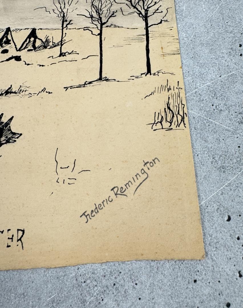 Watercolor study for his work The Hungry Winter. Pen and Ink with Watercolor on Paper. 5 1/4" by 6". PROVENANCE: Martin Lane Historic & Western Americana Lifetime Collection. Frederic Sackrider Remington (1861 - 1909) was active/lived in New York, Kansas, Connecticut. Frederic Remington is known for Western painting and sculpture, illustration. In his lifetime polymath Frederic Remington was the most successful and famous Western American artist. His immense talents included excelling as an illustrator, author, sculptor, and fine artist. His was a life tragically cut short. Born on October 4, 1861 in Canton, a small berg in bucolic upper state New York, he was much influenced by his father Seth Pierpont Remington, a Republican journalist who founded the St. Lawrence Plaindealer. His father had been a captain in the Civil War, and in 1870 President Ulysses S. Grant appointed him United States Collector of the Port of Ogdensburg, New York. In 1876 young Frederic enrolled at Highland Military Academy in Worcester, Massachusetts where he studied for the next two years. Two years later he enrolled at Yale for one year to study in the School of Fine Arts. His two loves were art and football. Only three months into school, he published his first illustration in the on-campus newspaper Yale Courant. On the gridiron he was a natural, demonstrating great strength and agility. Like Theodore Roosevelt, Remington also enjoyed boxing. A year later he met his future wife Eva Caten from Gloversville, New York. After the death of Remington’s father from tuberculosis on February 18, 1879, Eva rejected his first marriage proposal. Floundering, Remington headed to the American West to find himself—much like Theodore Roosevelt did when his mother and wife died on the same day. That led to a trip to Montana where he completed a number of sketches. Invigorated by his Western experiences, in February 1883 he headed to Kansas and with part of his inheritance bought a 160 acre sheep ranch near Peabody, Kansas. That failed adventure lasted about a year, and he then relocated to Kansas City, Missouri where Eva would join him as his wife. Yet he squandered the rest of his inheritance on a saloon there. After more illustrations were sold to Harper’s Weekly, in 1885 the Remingtons moved to New York City, and in 1886 he attended the Art Students League. By then Remington was earning $1,200 a year, twice the income of a school teacher. Other magazines such as St. Nicholas and Outing also published his art. His work certainly impressed a young Theodore Roosevelt who was chronicling his life in Medora—now in North Dakota—for a serial that ran in The Century Magazine. It was very common at the time for authors to serialize their works in magazines before they were published in book form. In the fall of 1887 Remington was commissioned to illustrate the magazine stories which ended up in Roosevelt’s 1888 classic book Ranch Life and the Hunting Trail. Early on, a lasting friendship between the two was cemented through these publications. By 1889 he had garnered national notoriety as one of the most accomplished illustrators in the country. He was a national celebrity. In 1889 his monumental canvas A Dash for the Timber was exhibited at the National Academy of Design. The New York Times reported, "The picture at the Autumn exhibition of the Academy of Design before which stands the largest number of people is Frederic Remington’s Dash for the Timber." A Silver medal for Last Lull in the Fight followed at the Exposition Universelle in Paris. In 1891 the National Academy of Design elected Remington as an Associate member. Yet he was never admitted as National Academician, despite support from fellow artists Gilbert Gaul, Childe Hassam, and others. His financial success allowed the Remingtons to move into a grand home he named Ednion Algonquin for "a place where I live in New Rochelle, New York. A young Norman Rockwell would someday paint in his studio. Through his travels, Remington embraced social Darwinism survival of the fittest that championed the U.S. military’s domination of the inferior Native Americans. Theodore Roosevelt, George Armstrong Custer, and Remington along with most other Americans—idolized Charles Darwin. As early as 1888 Remington started contributing short stories along with illustrations to magazines. His writings teemed with romantic Western stories chalk full of drama and violence. Initially, they presented the cavalryman as the hero and the Indian as the villain, especially when the Indian had been tainted with the vices of the white man. His West was the "frontier model where the fittest were rugged individuals from northern Europe and white Americans. Even though he was an accomplished author and painter, perhaps his greatest talent was as a sculptor. His bronzes are more famous and collectible than any other Western American artist. And yet his bronze repertoire was completed in just fourteen years. Starting in order of modeling, they are: The Broncho Buster, The Wounded Bunkie, The Wicked Pony, The Scalp, The Norther, The Cheyenne, The Buffalo Signal, Coming Through the Rye, The Mountain Man, The Sergeant, Paleolithic Man, Savage, Polo, The Rattlesnake, Dragoons 1850, The Outlaw, The Horse Thief, The Buffalo Horse, The Cowboy, Trooper of the Plains 1868, The Broncho Buster (large), and The Stampede. His Coming Through the Rye was widely viewed by the public at two world’s fairs. A New Jersey artisan in 1904 was commissioned by Remington to produce a heroic size plaster of the sculpture for the 1904 Louisiana Purchase Exposition in St. Louis, Missouri (called Off the Trail). It was then shipped to Portland, Oregon the next year for the Lewis and Clark Exposition and titled Shooting Up the Town. The Cowboy—his only monumental bronze—was commissioned in 1905 by the Fairmount Park Art Association in Philadelphia. The twelve feet high bronze was shipped to Philadelphia in May 1908