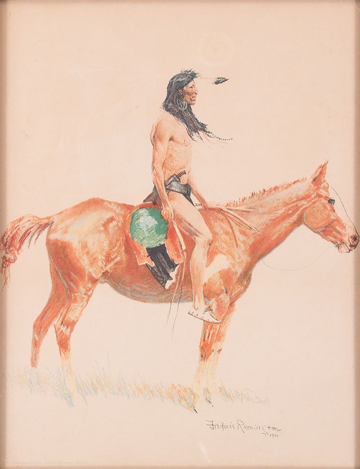 Frederic Remington (1861-1909). The Cheyenne Buck. 19 ¼" x 15" chromolithograph. Signed and dated 1901 lower right. Imprinted: Copyright 1901 by Robert Howard Russell lower left. One of eight of the print series "A Bunch of Buckskins" published in 1901.