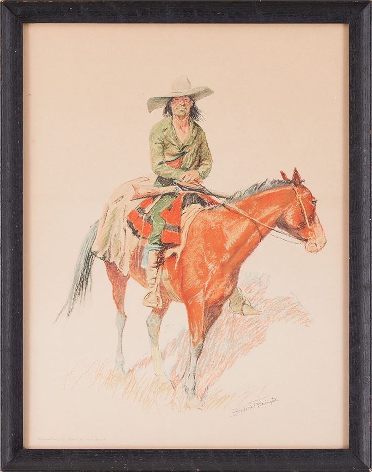 Frederic Remington (1861-1909). Old Ramon. 19 ¼" x 15" chromolithograph. Signed lower right. Imprinted: Copyright 1901 by Robert Howard Russell lower left. One of eight of the print series "A Bunch of Buckskins" published in 1901.