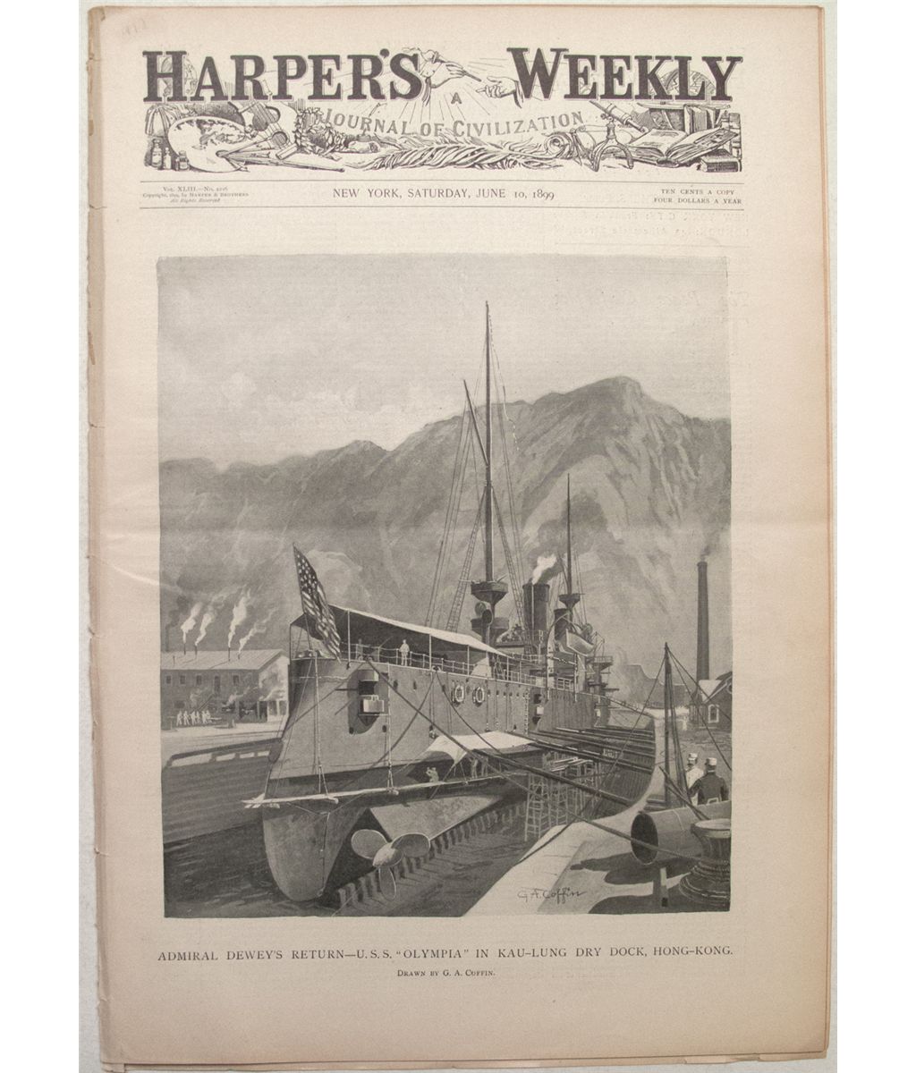 Center pages belong to a Remington drawing of a Bayonet Ruth in the Philippines. Lead article on Admiral Dewey.
