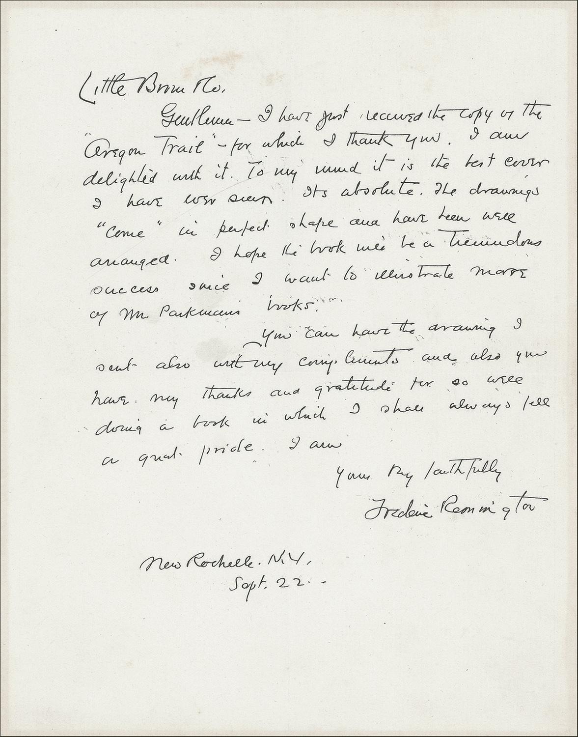 American artist (1861–1909) best known for his paintings and sculptures of the American West, and for his depictions of cowboy life in particular. ALS, one page, 6.5 x 9, September 22. In full, "Gentlemen - I have just received the copy of the 'Oregon Trail' - for which I thank you. I am delighted with it. To my mind it is the best cover I have ever seen. Its absolute. The drawings 'come' in perfect shape and have been well arranged. I hope the book will be a tremendous success since I want to illustrate more of Mr. Parkman’s works. You can have the drawing I sent also with my compliments and also you have my thanks and gratitude for so well doing a book in which I shall always feel a great pride.” Letter has been professionally inlaid into a 10 x 13 off-white sheet. In fine condition, with light intersecting mailing folds and a trivial light stain to top margin.