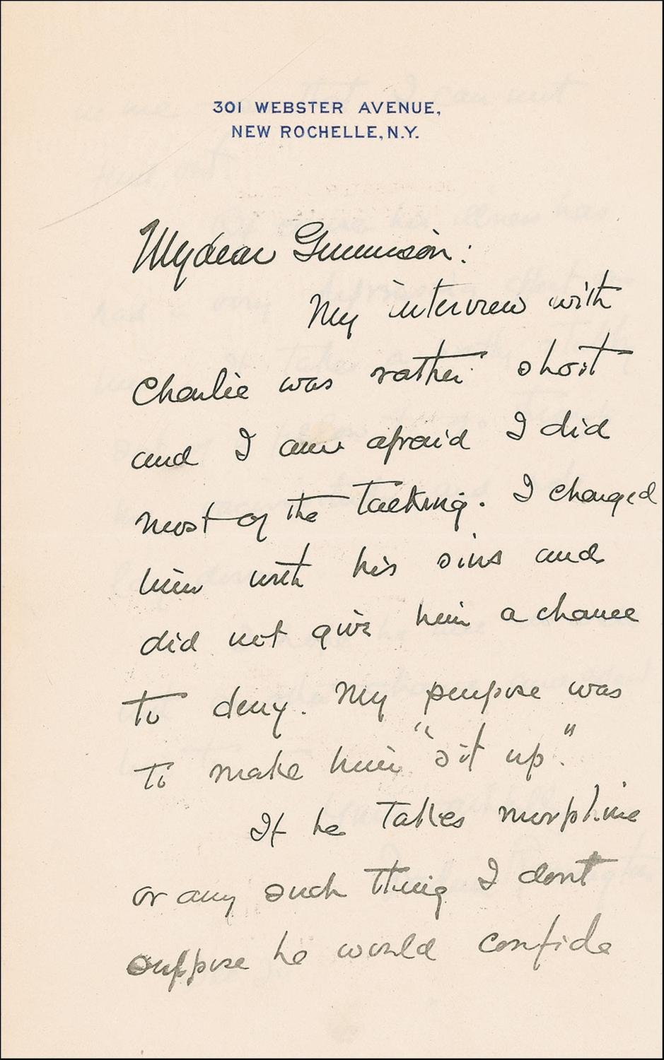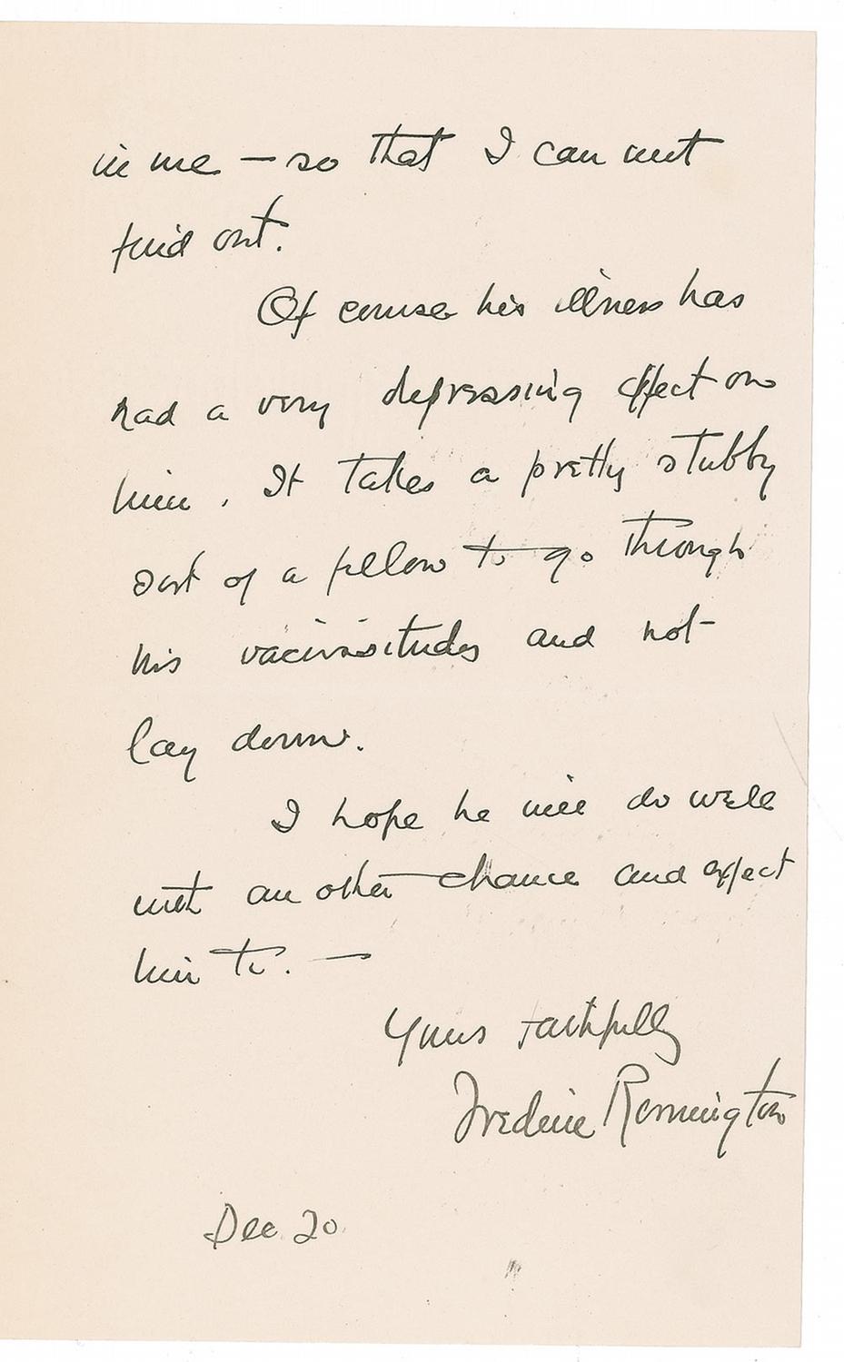 American artist (1861–1909) best known for his paintings and sculptures of the American West, and for his depictions of cowboy life in particular. ALS, two pages, 5 x 8, personal letterhead, December 20. Letter to “my dear Gunnison.” In full: “My interview with Charlie was rather short and I am afraid I did most of the talking. I charged him with his sins and did not give him a chance to deny. My purpose was to make him ‘sit up.’ If he takes morphine or any such thing I don’t suppose he would confide in me - so that I can not find out. Of course his illness has had a very depressing effect on him. It takes a pretty stubby sort of a fellow to go through his vicissitudes and not lay down. I hope he will do well with another chance.” In fine condition, with three thin areas of paper from light mounting remnants to reverse of second page.