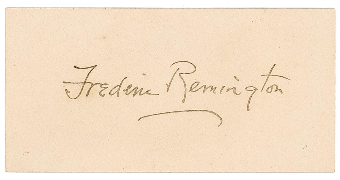 American artist (1861–1909) best known for his paintings and sculptures of the American West, and for his depictions of cowboy life in particular. Ink signature, “Frederic Remington,” on an off-white 2.75 x 1.25 card. In fine condition, with a mild shade of toning to card.