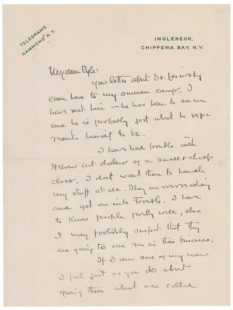 American artist (1861–1909) best known for his paintings and sculptures of the American West, and for his depictions of cowboy life in particular. ALS, one page both sides, 4.75 x 6.5, Ingleneuk letterhead, no date. Letter to his friend, Howard Pyle. In full: “Your letter about Dr. Lesinsky came here to my summer camp. I have met him—he has been to see me and he is probably just what he represents himself to be. I have had trouble with Hebrew art dealers of a small & cheap class. I don’t want them to handle my stuff at all. They are overreaching and get me into trouble. I have to know people pretty well, else I may foolishly suspect that they are going to use me in their business. If I am sure of my man I feel just as you do about giving them what are called ‘artist prices’—but I want to be sure they are going to treasure the work and put it on the market at a nice advance. This may not be the case of Dr. L. at all but since we both only know what he chooses to tell, why I reserve judgement. Should like to meet you once in a coon’s age.” Letter has been removably encapsulated in acid free Mylar. In fine condition, with a central horizontal fold and a staple hole to top left.