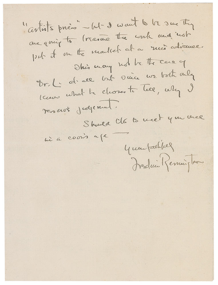 In this stunning letter, the great artist offers a firsthand account of his art and his tribulations with art dealers. Pyle, this letter’s recipient, was an illustrator and writer whose work regularly appeared in various magazines, including Harper's Weekly. In 1894, that publication ran Poultney Bigelow’s article, entitled ‘The Russian and His Jew,’ that examined the repressive regime of Russia’s Tsar Nicholas—and was written with an anti-Semitic slant. That piece was illustrated by Remington, and though, in historical hindsight, the accusation lodged by Bigelow were proven to be unfounded, it may have tainted the artist’s opinion—or perhaps merely revealed a previously hidden mentality—and resulted in such a shockingly misguided generalization as “I have had trouble with Hebrew art dealers of a small & cheap class. I don’t want them to handle my stuff at all.” A startling look into the mindset of an otherwise intelligent man.