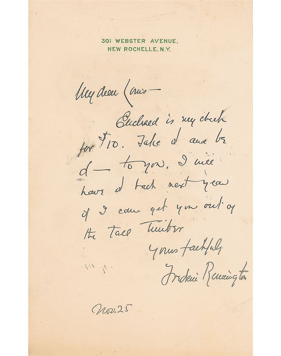 ALS, one page, 4.75 x 7.75, personal letterhead, November 25. Letter to Louis Shipman of New York. In full: “Enclosed is my check for $10. Take it and be d— to you. I will have it back next year if I can get you out of the tall timber.” Overall rippling from adhesive to reverse and scattered marks and soiling, otherwise fine condition.