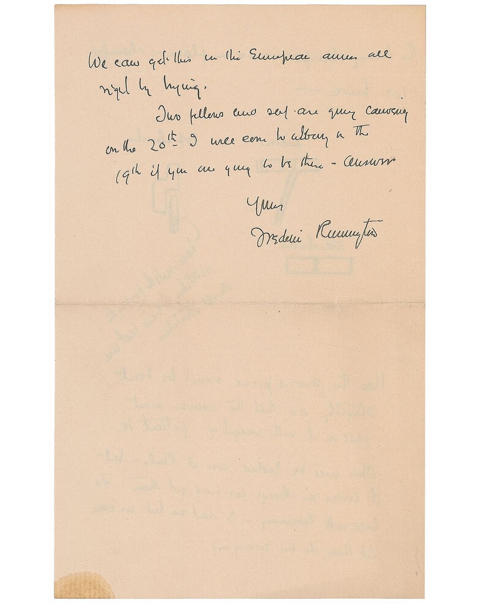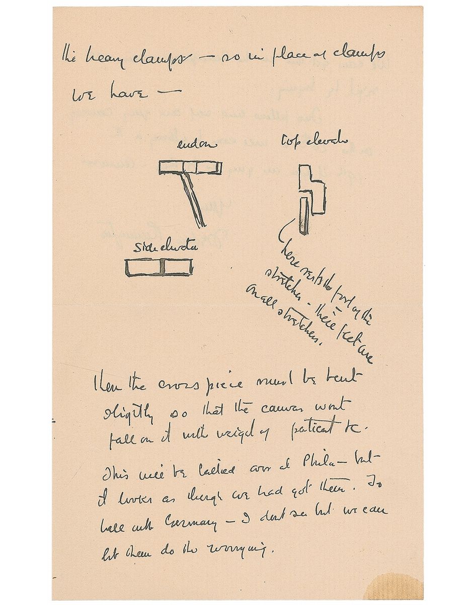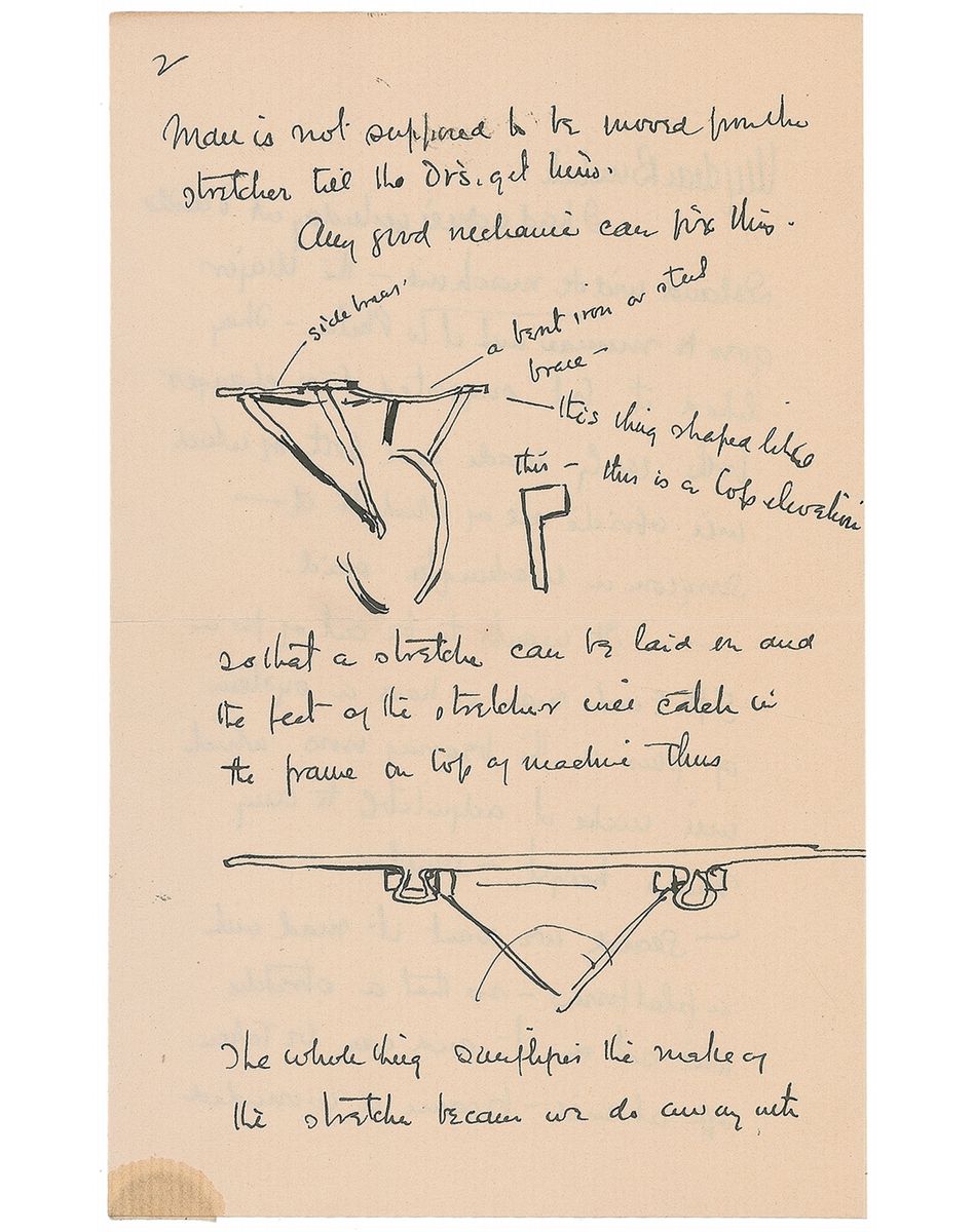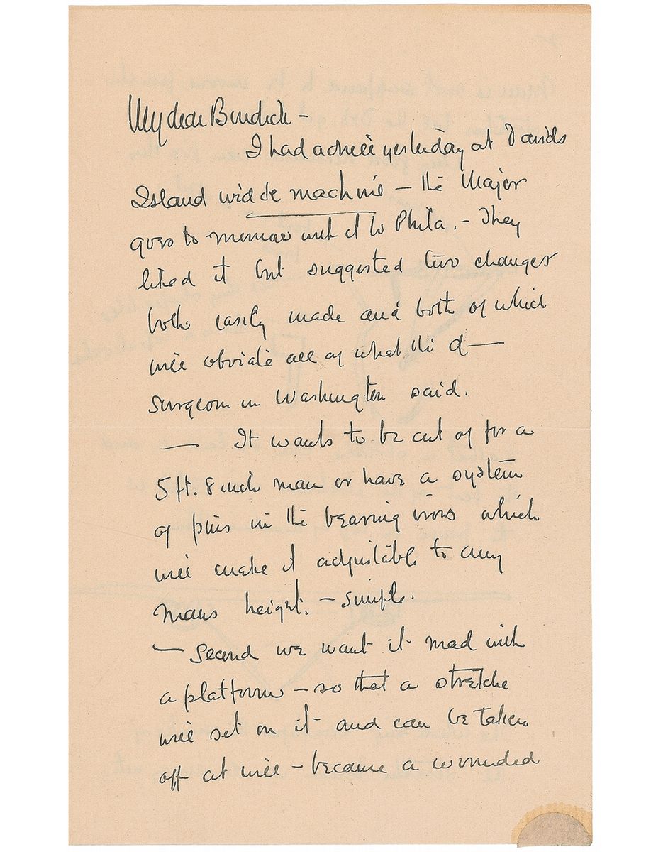 ALS, four pages on two adjoining sheets, 4.25 x 6.75, no date. Letter to Joel Burdick, describing and sketching an improved design for a medical stretcher. In part: “I had advice yesterday at David's Island wid [sic] de machine…They like it but suggested two changes…It wants to be cut out for a 5 ft 8 inch man or have a system of pins in the bearing irons which will make it adjustable to any man's height—simple. Second, we want it made with a platform, so that a stretcher will set on it and can be taken off at will…then the cross piece must be bent slightly so that the canvas won't fall on it with weight of patient &c…To hell with Germany—I don't see but we can let them do the worrying. We can get this in the European armies all right by trying.” Remington adds several diagrams to depict these improvements. In fine condition, with toned adhesive remnants to the lower right corner.