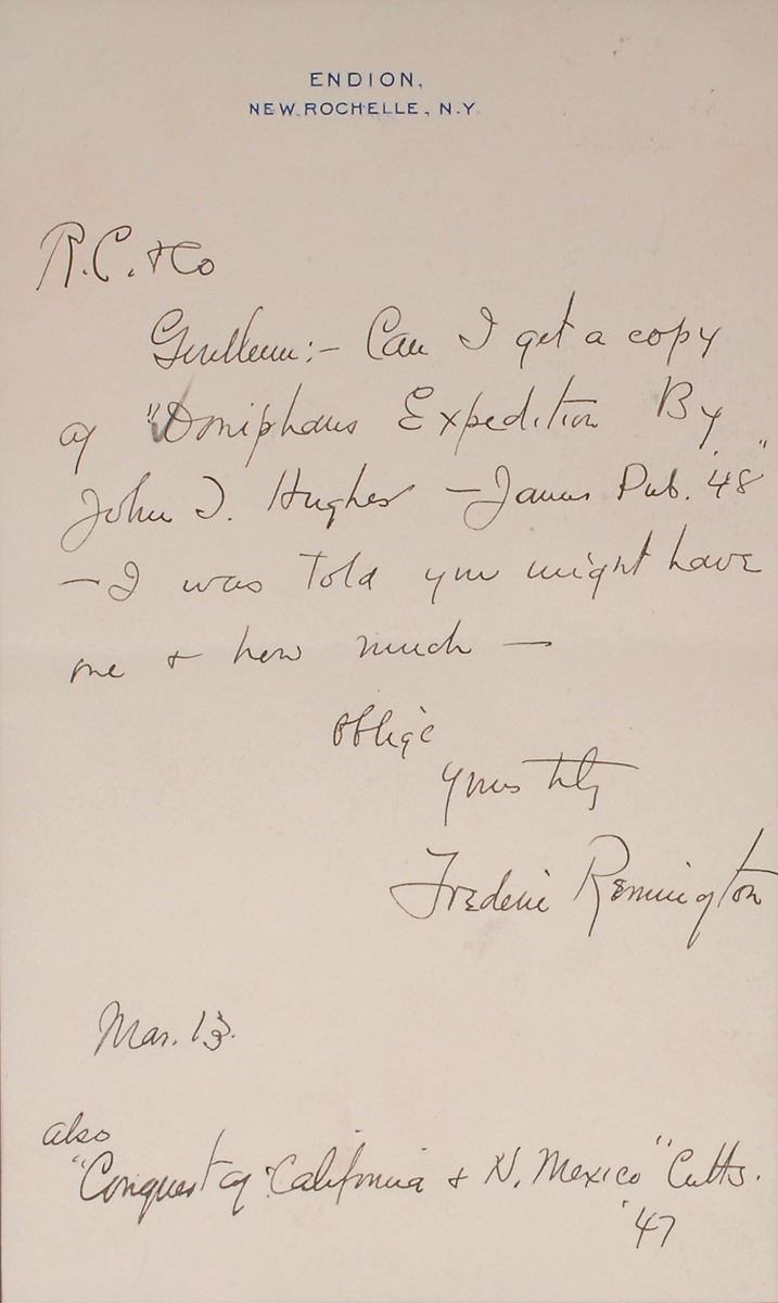ALS, one page, 4 x 6.5, Endion letterhead, March 13. Letter to R. C. & Co., in full: “Can I get a copy of ‘Doniphans Expedition By John I. Hughes—Janus Pub. ‘48’—I was told you might have one and how much—.” Remington adds a brief postscript at the conclusion, “Also ‘Conquest of California & N. Mexico’ Catts, ‘47.” Double-matted and framed with a photo of Remington smoking a cigarette to an overall size of 16.5 x 13.25. In fine condition, with an office notation and trivial soiling.