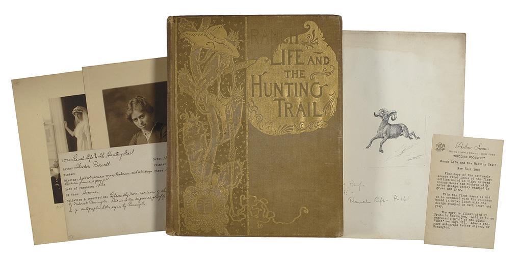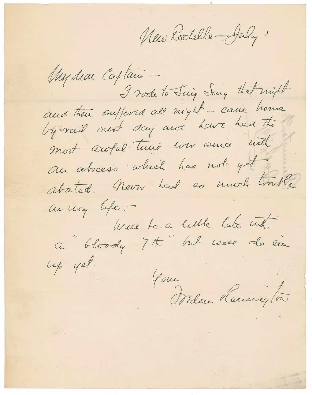 ALS, one page, 7 x 9, New Rochelle, July 1, no year. Letter addressed to “My dear Captain.” In full: “I rode to Sing Sing that night and there suffered all night—came home by rail next day and have had the most awful time since with an abscess which has not yet abated. Never had so much trouble in my life. Will be a little late with a ‘bloody 7th’ but will do ‘em up yet.” Accompanied by a hardcover first edition of Ranch Life and the Hunting Trail by Theodore Roosevelt, featuring illustrations by Remington, and a 9 x 11.75 engraver’s proof of Remington’s illustration entitled “Shot,” pictured on page 161. Letter is in fine condition; the book rates very good, with scattered cover wear, partially detached hinges, and scattered toning and dampstaining; the print exhibits toning and damp staining to edges.