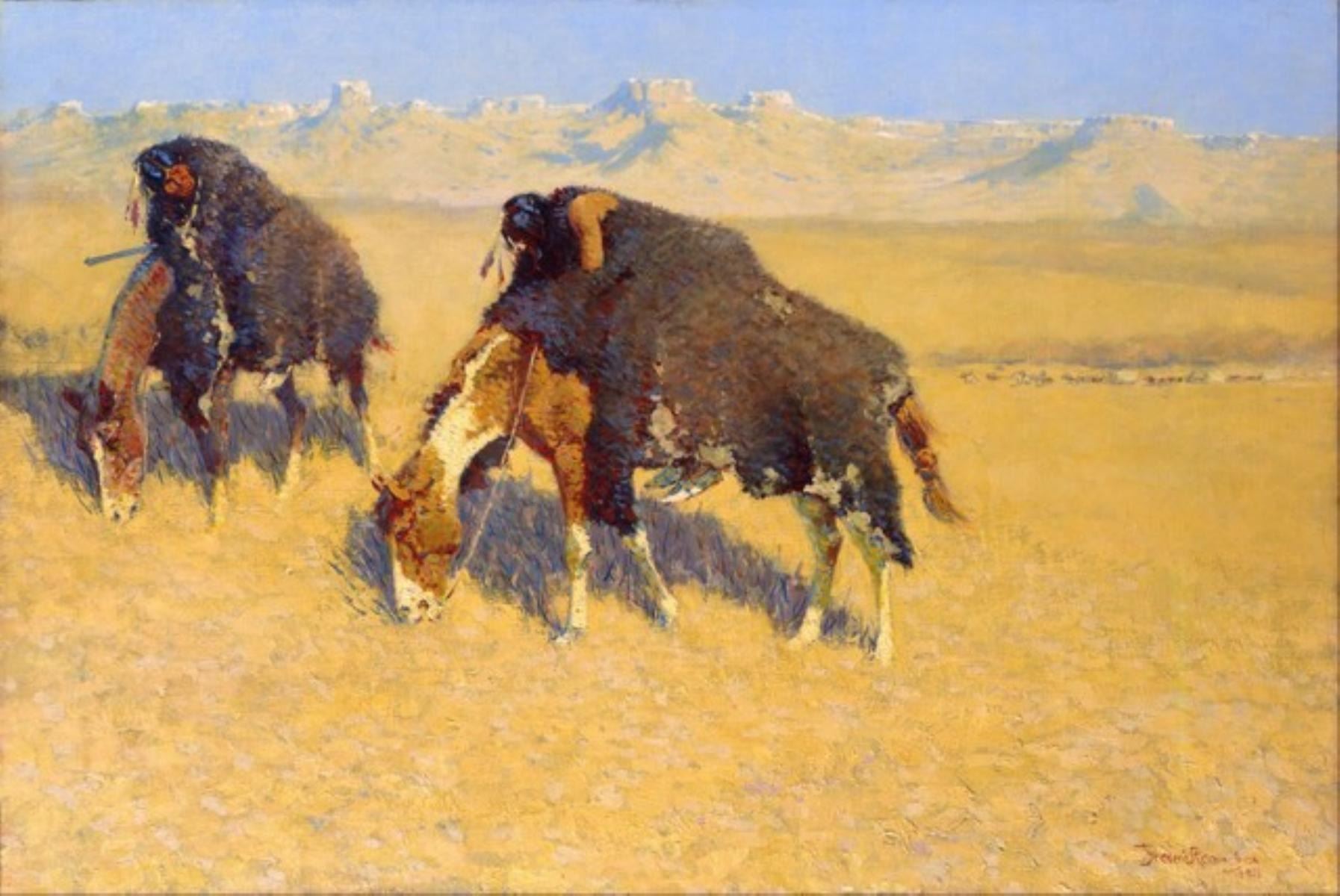 Artist: Frederic Sackrider Remington - Title: Indians Simulating Buffalo - Medium: Fine Art Giclee on Canvas - Image Size: Approximately 13.25 inches x 20 inches - Framed: Unframed on Unstretched Canvas - Biography: Frederic Sackrider Remington (October 4, 1861 - December 26, 1909) was an American painter, illustrator, sculptor, and writer who specialized in depictions of the Old American West, specifically concentrating on the last quarter of the 19th century American West and images of cowboys, American Indians, and the U.S. Cavalry.
