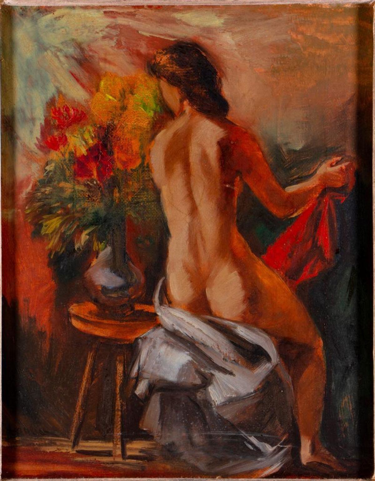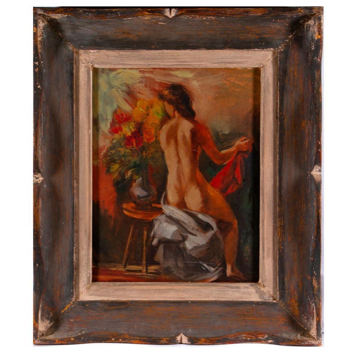 Artist: Frederic Taubes (1900-1981). Title/Subject: Nude with Flowers. Medium: Oil on canvas. Size image: 14" x 11". Size frame: 21" x 18". Condition: Good.