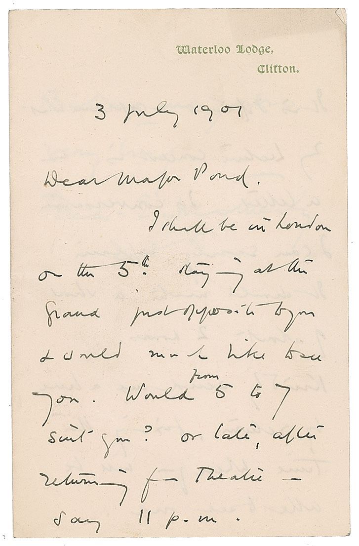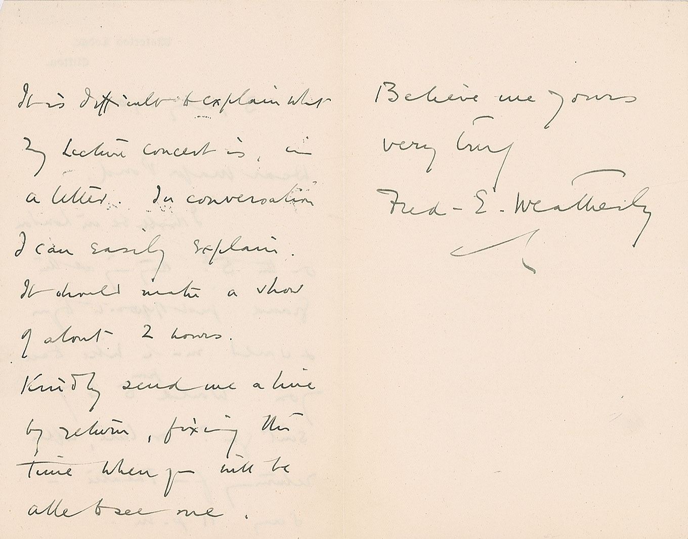 ALS signed “Fred. E. Weatherly,” three pages on two adjoining sheets, 4.5 x 7, Waterloo Lodge letterhead, July 3, 1907. In part: "Would much like to see you. Would from 5 to 7 suit you? Or later, after returning from theatre—say 11 p.m. It is difficult to explain what my lecture concert is in a letter. In conversation I can easily explain." In fine condition.