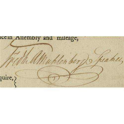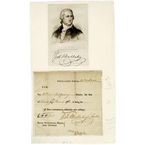 <B>Frederick A. Muhlenberg, (1750-1801) first speaker of the House of Representatives, partly-printed Document Signed,</B></I> "<I>Fredk. A. Muhlenberg, Speaker</B></I>" one page, 7" x 6.5", Philadelphia, November 27, 1782, a pay warrant ordering £26 to William Montgomery "<I>...it being for 28 Days attendance in Assembly and mileage...</B></I>" Countersigned by <B>John Nicholson.</B></I> Expertly mounted to another sheet which has been hinged to a lager sheet bearing an engraving of Muhlenberg. Light toning at folds, else very good. A fine example. From the Henry E. Luhrs Collection. Accompanied by LOA from PSA/DNA.