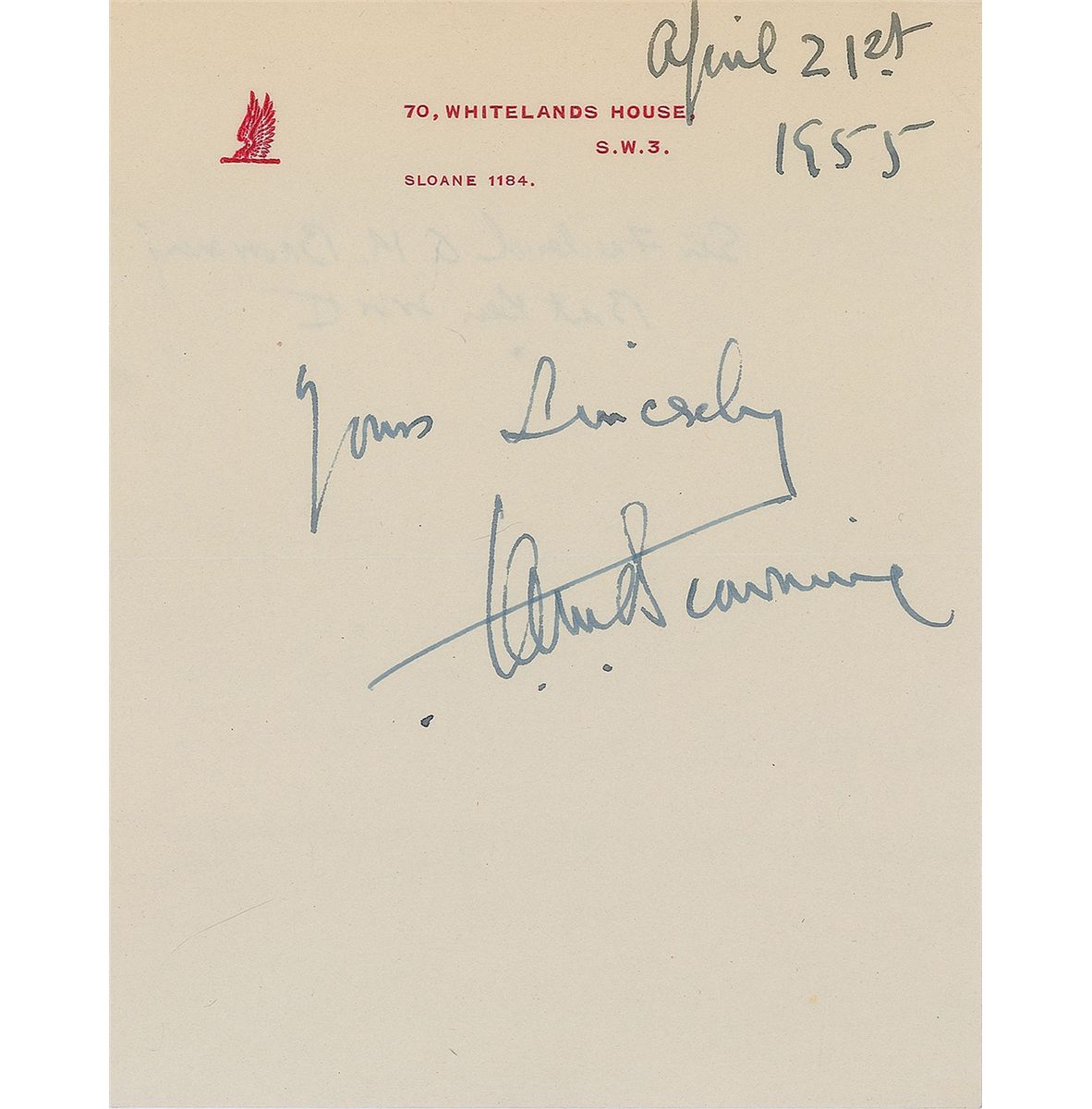 Fountain pen signature, “Yours sincerely, F. A. M. Browning” on an off-white 5.5 x 7 sheet of his personal stationery, dated in another hand April 21, 1955. Browning (1896–1965) was a British army officer who has been called the ‘father of the British airborne forces.’ And a fountain pen signature, “Henry Moore, Admiral, 5th January 1946,” on a light blue sheet of British Admiralty Delegation stationery. Moore (1886–1978) was the last British admiral to command Home Fleet during World War II. In fine condition.